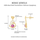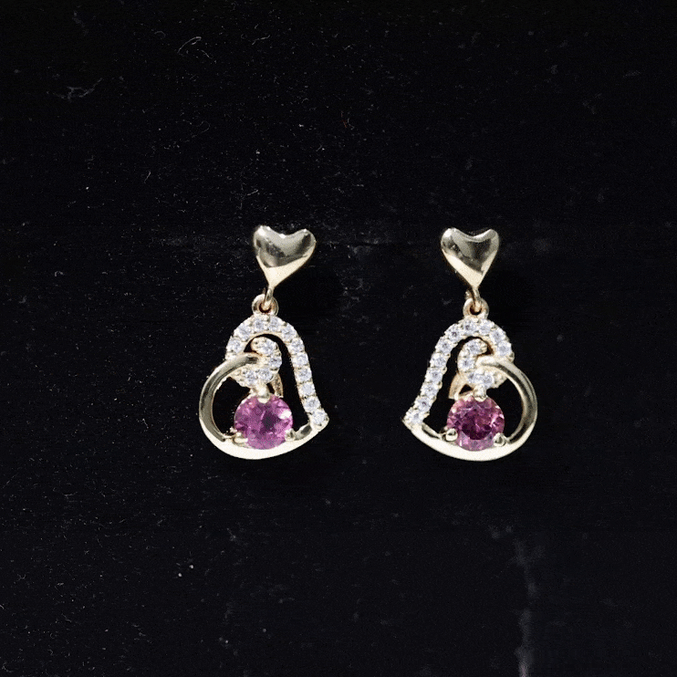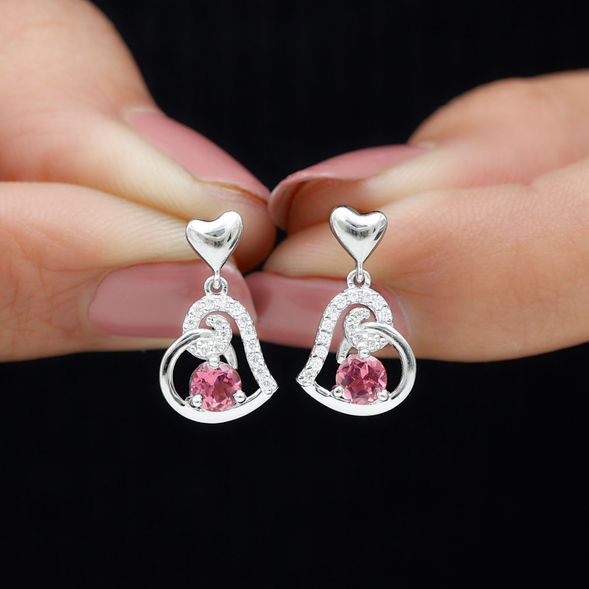 Flaunt your Fashion Style with these Unique Design Heart Drop Earrings. The Drop Earrings are embellished with Round Shape Pink Tourmaline as Center Stone in 3 Prong Setting. Tiny Round Shape Diamond studded Beautifully on Solid Gold crafted Heart in Accent Setting that make it more Attractive.