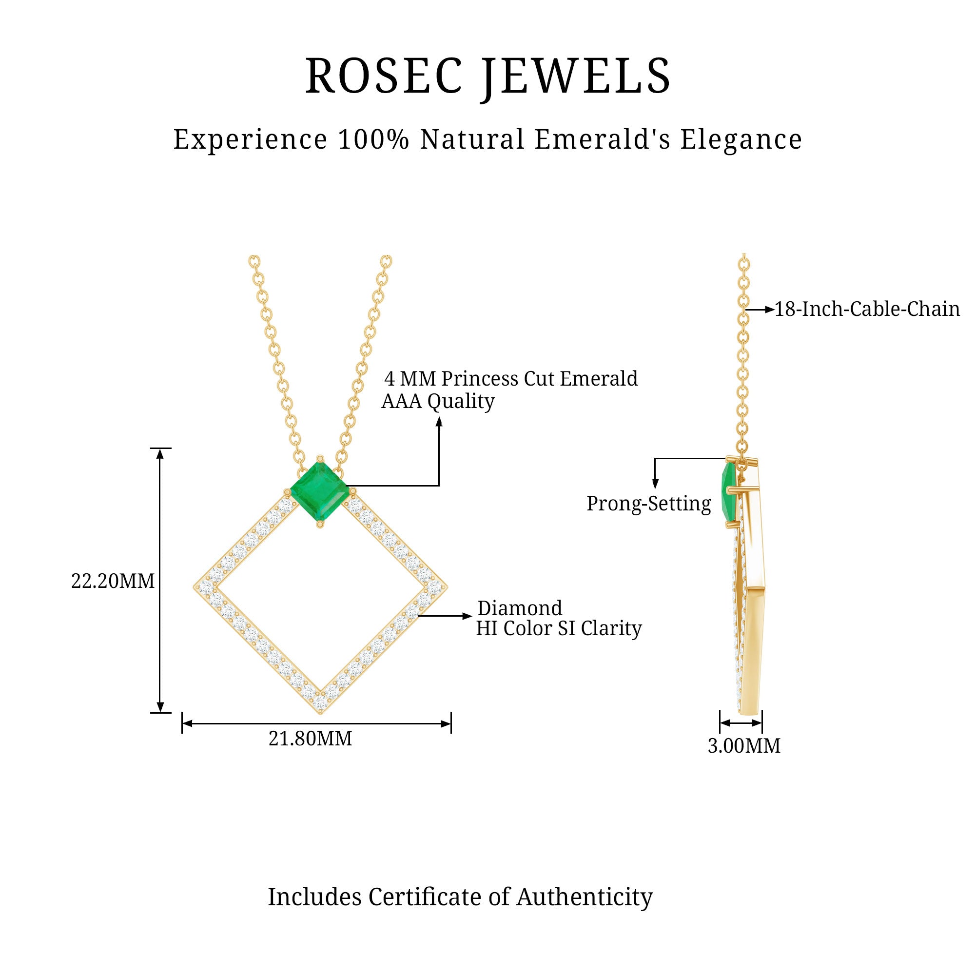 Enhance your jewelry collection with this exquisite Antique Diamond Emerald Pendant, featuring a stunning Solitaire Princess Cut Emerald as the centerpiece of the Open Square Design. Adorned with Round Brilliant Cut Diamond, this unique Womens Promise Pendant is crafted from Solid Gold, making it a luxurious addition to any outfit.