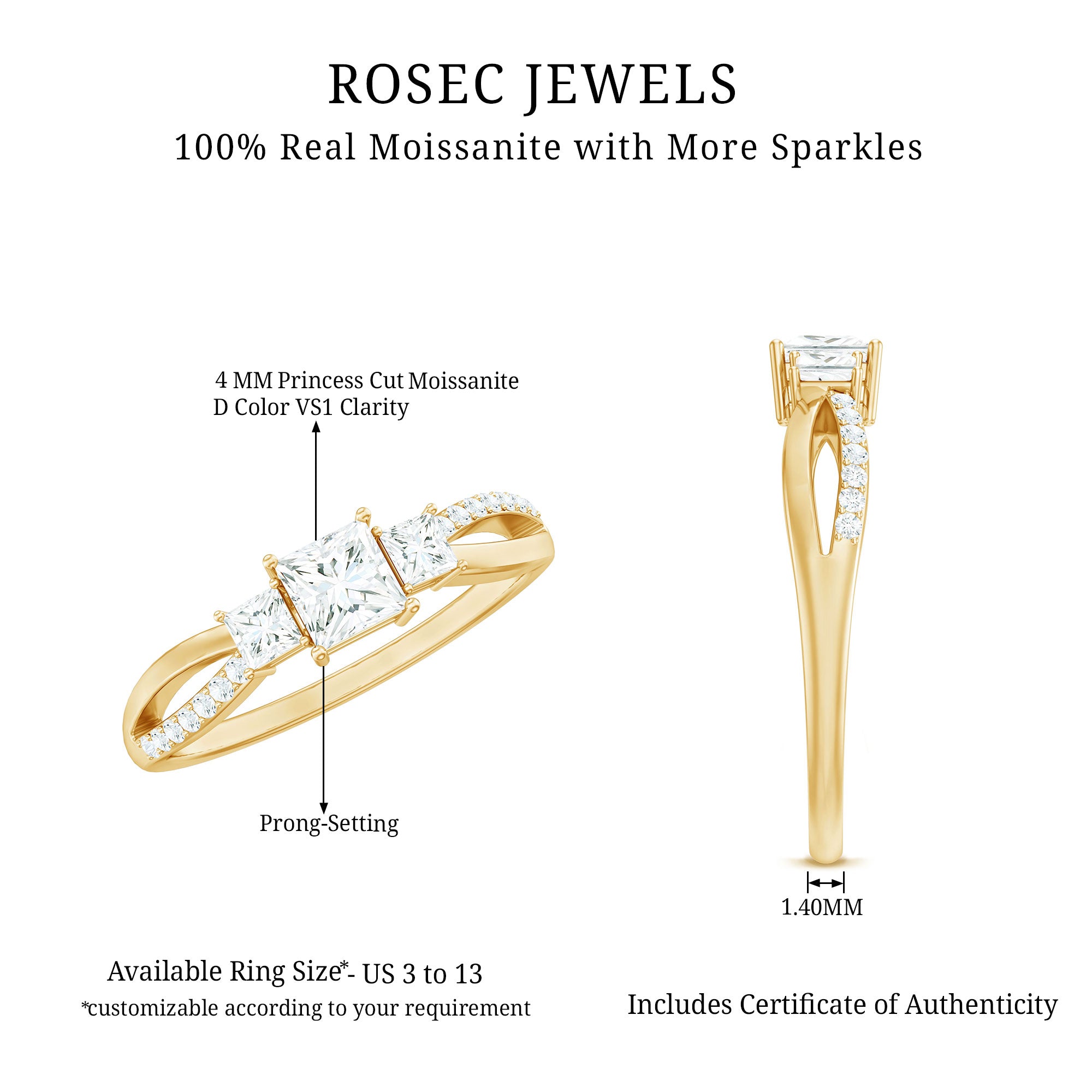 Impress your wife with your excellent choice in fine jewelry by giving her this gorgeous Engagement Ring, embellished with Three Stone Princess Cut Moissanite in a Prong Setting and Round Moissanite are set at the side in surface prong setting on split shank. This Moissanite Engagement Ring is composed of Gold Metal.