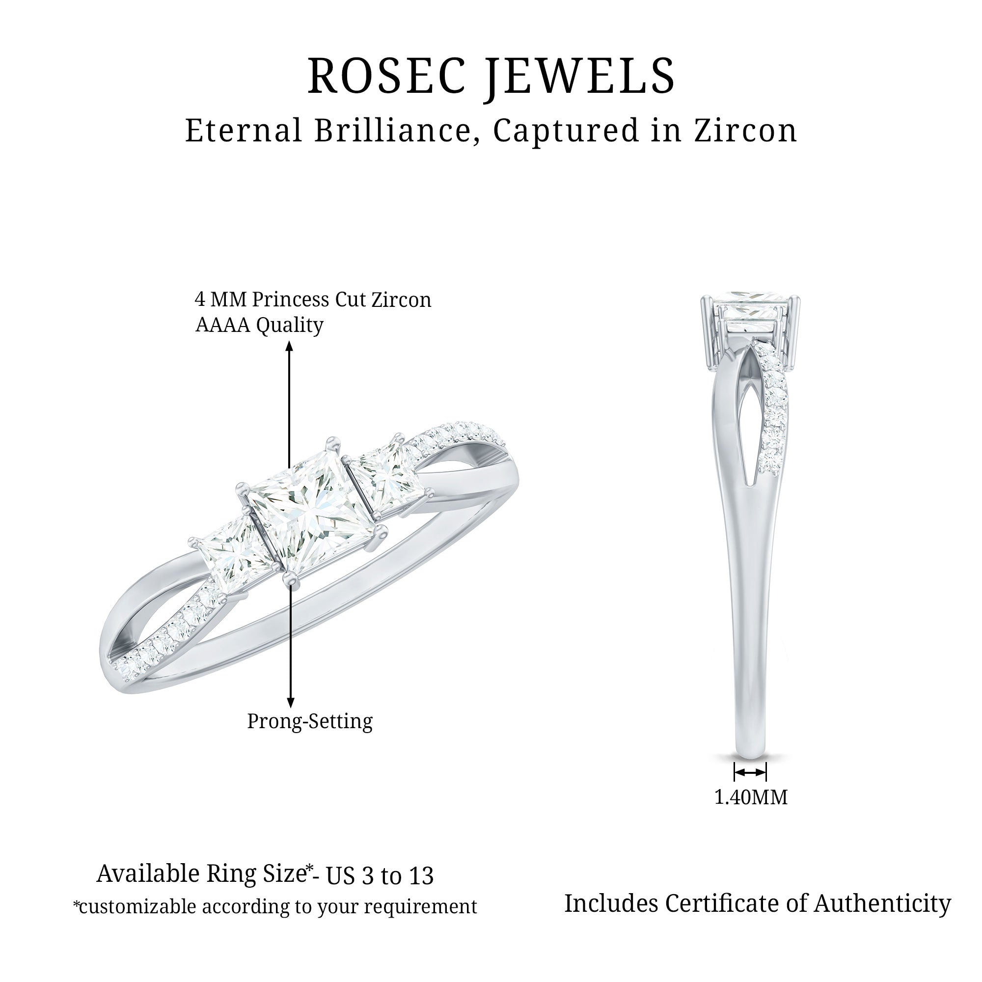 The Infinity Promise Ring is a beautifully crafted piece of jewelry featuring a stunning trio of princess cut zircon stones set in a timeless infinity band design. The ring is further accentuated by round zircon stones, adding to its brilliance and sparkle. This ring is a perfect choice to symbolize a promise with its exquisite design and quality craftsmanship.