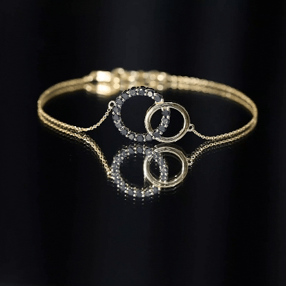 Bring a smile to your girls face with this interlock charm bracelet, crafted in solid gold and adorned with a round-cut black diamond in a prong setting. The timeless design exudes elegance and sophistication, making it the perfect party wear jewelry for any occasion. Shell cherish this eternity bracelet for years to come.