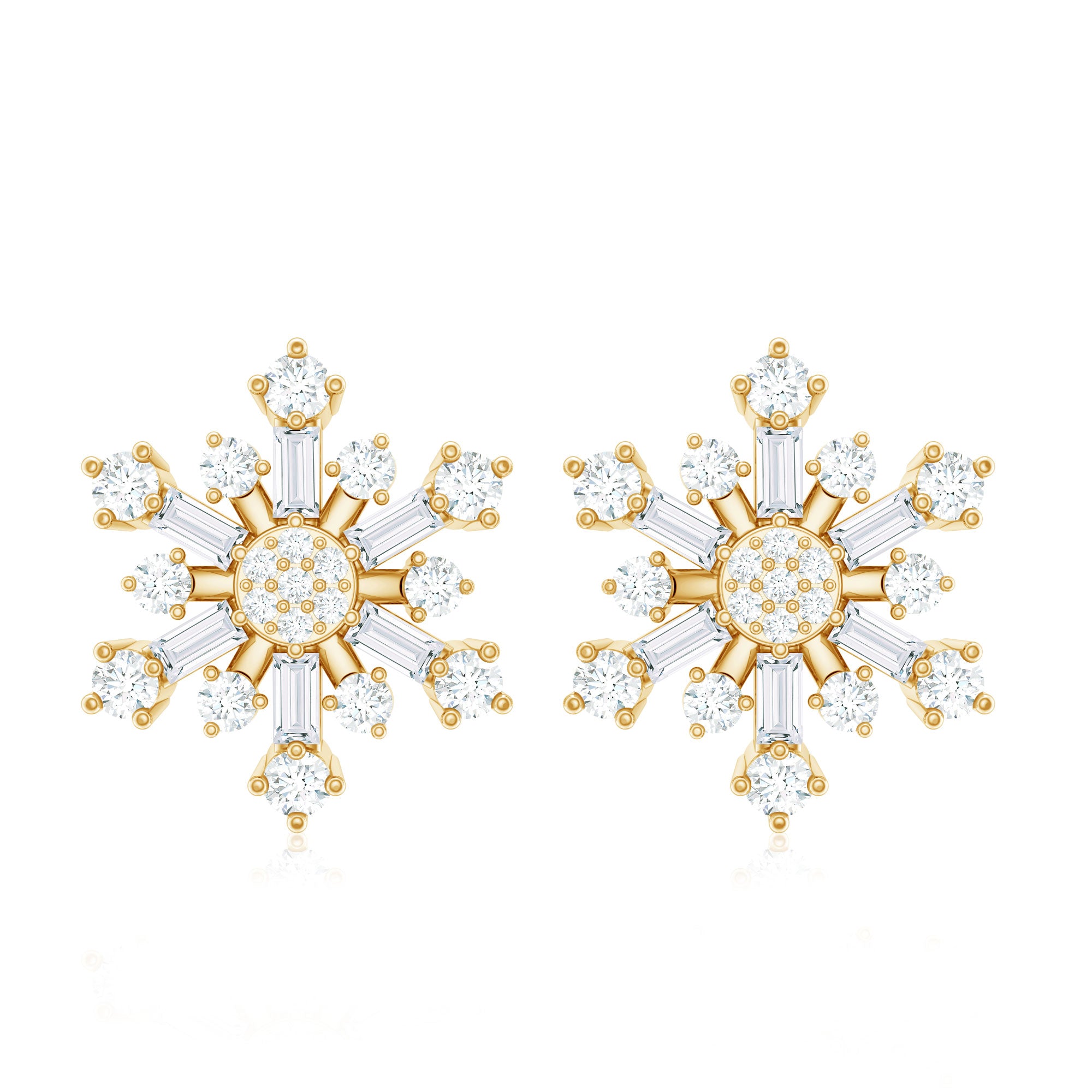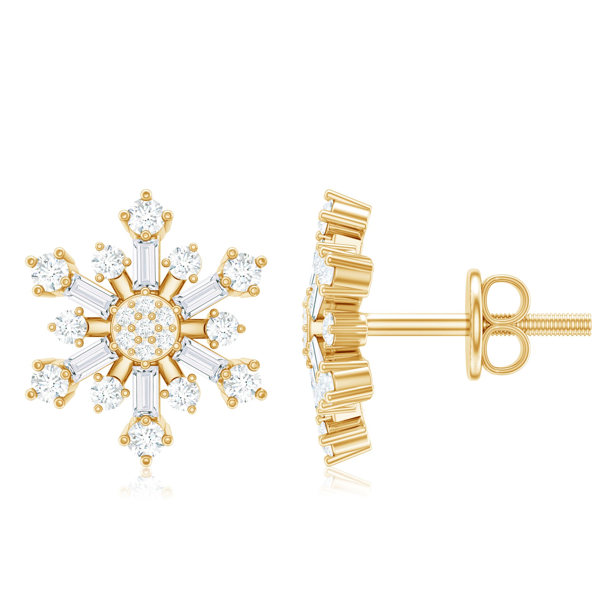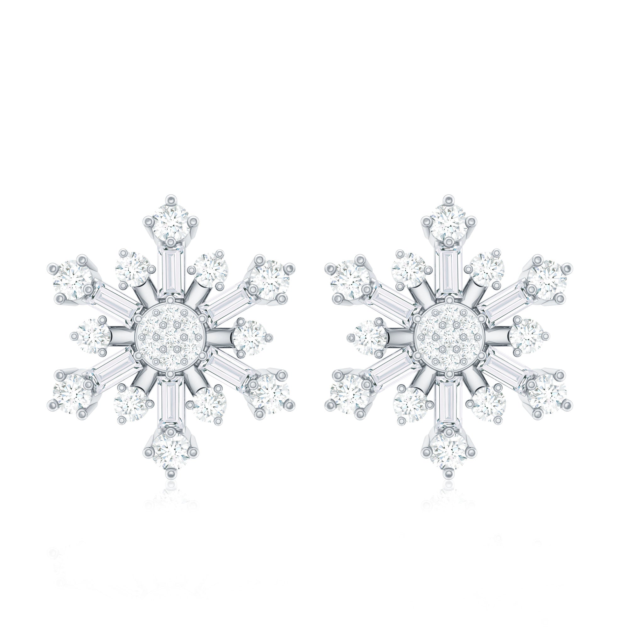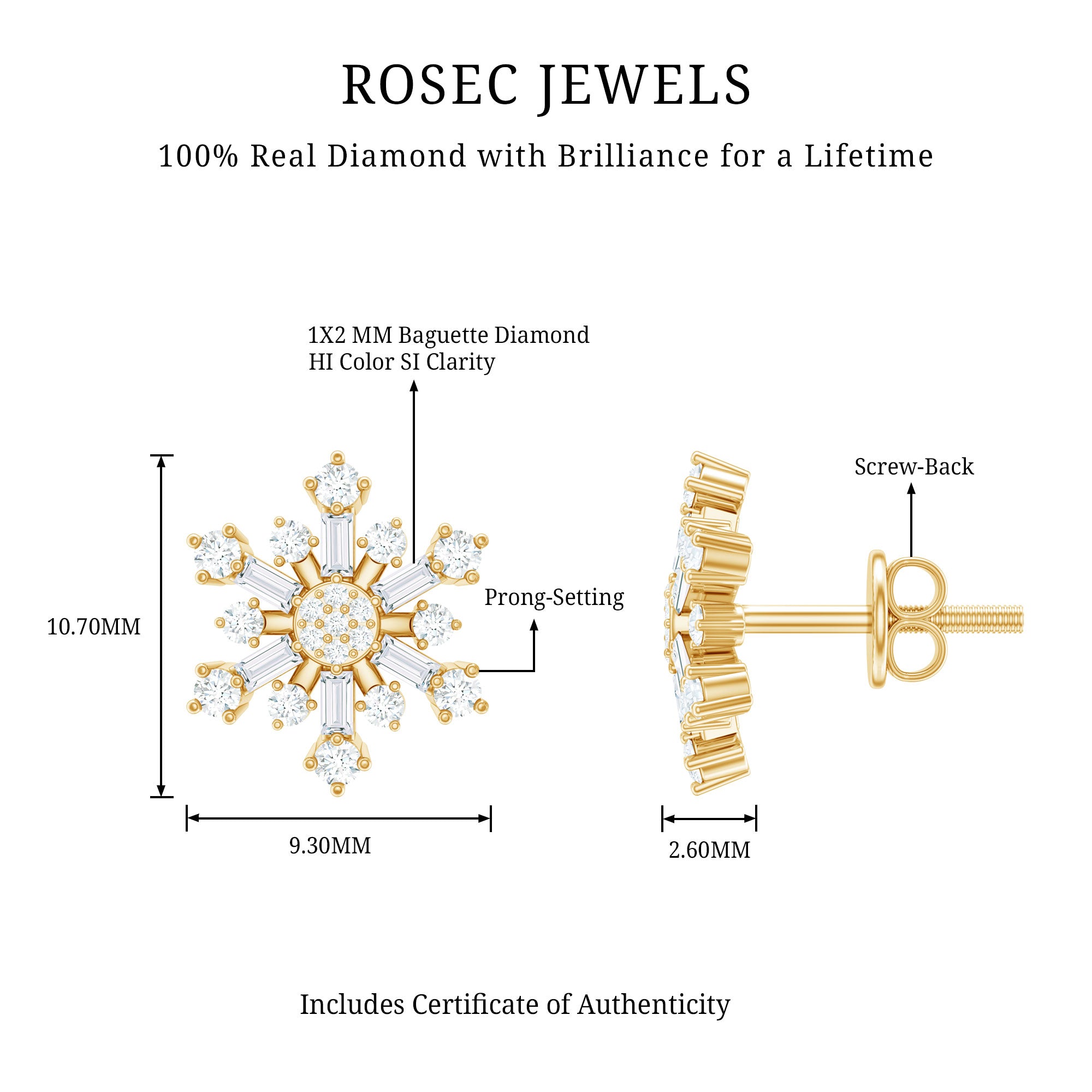 Handcrafted to complement the magic of the holiday season, these Snowflake Earrings bring a touch of winter sparkle to every moment. Designed with delicate snowflake motifs, each earring glimmers with Round and Baguette Shape Diamond stones that catch the light like freshly fallen snow. Their festive charm makes them perfect for adding an elegant shine to your Christmas outfits, whether you are attending a gathering, a holiday party or simply enjoying an evening by the tree. The secure Screw Back Closure ensures they stay comfortably in place, giving you peace of mind as you celebrate and make memories. Beautifully detailed, these Diamond Snowflake Earrings offer just the right amount of shimmer without feeling too bold. Presented in a signature jewelry box and ready to gift, these Diamond Stud Earrings make a thoughtful surprise for someone who loves the sparkle of the season. These Diamond Earrings for Women capture the warmth, wonder and enchantment that make Christmas truly unforgettable.