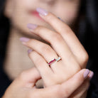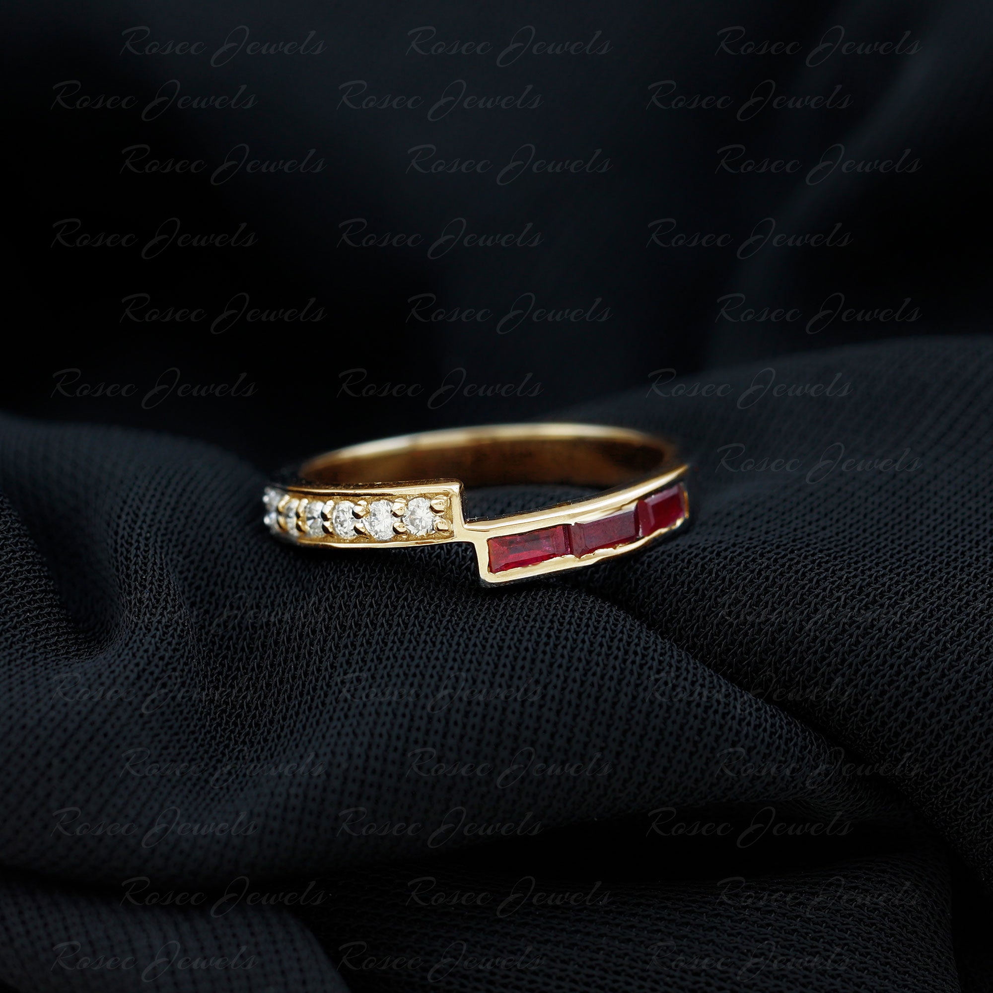 This stunning Gold Band Ring is a perfect addition to any womans jewelry collection. It is decorated with a combination of Baguette Cut Rubies and Round Shape Diamond stones, adding a touch of glamour and sophistication. The Ruby Band Ring is a must-have piece for anyone who loves to make a statement with their jewelry.