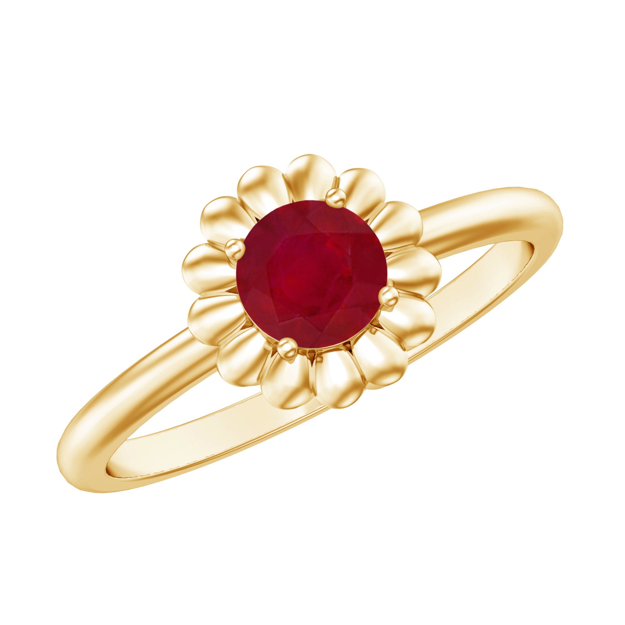 3/4 CT Round Cut Solitaire Ruby Gold Flower Ring