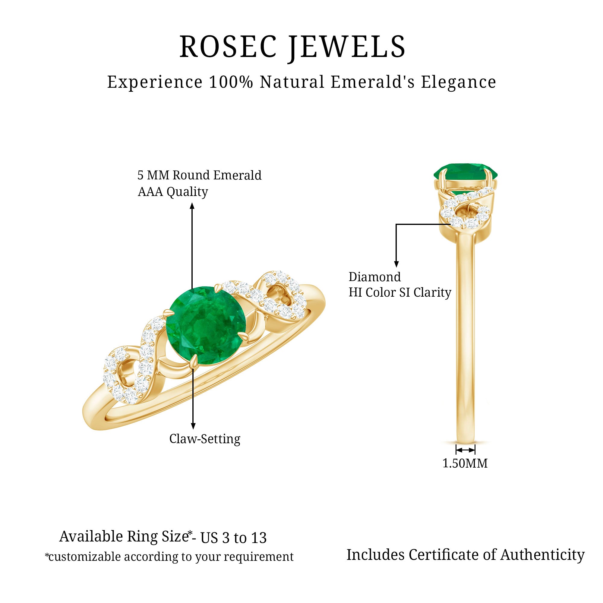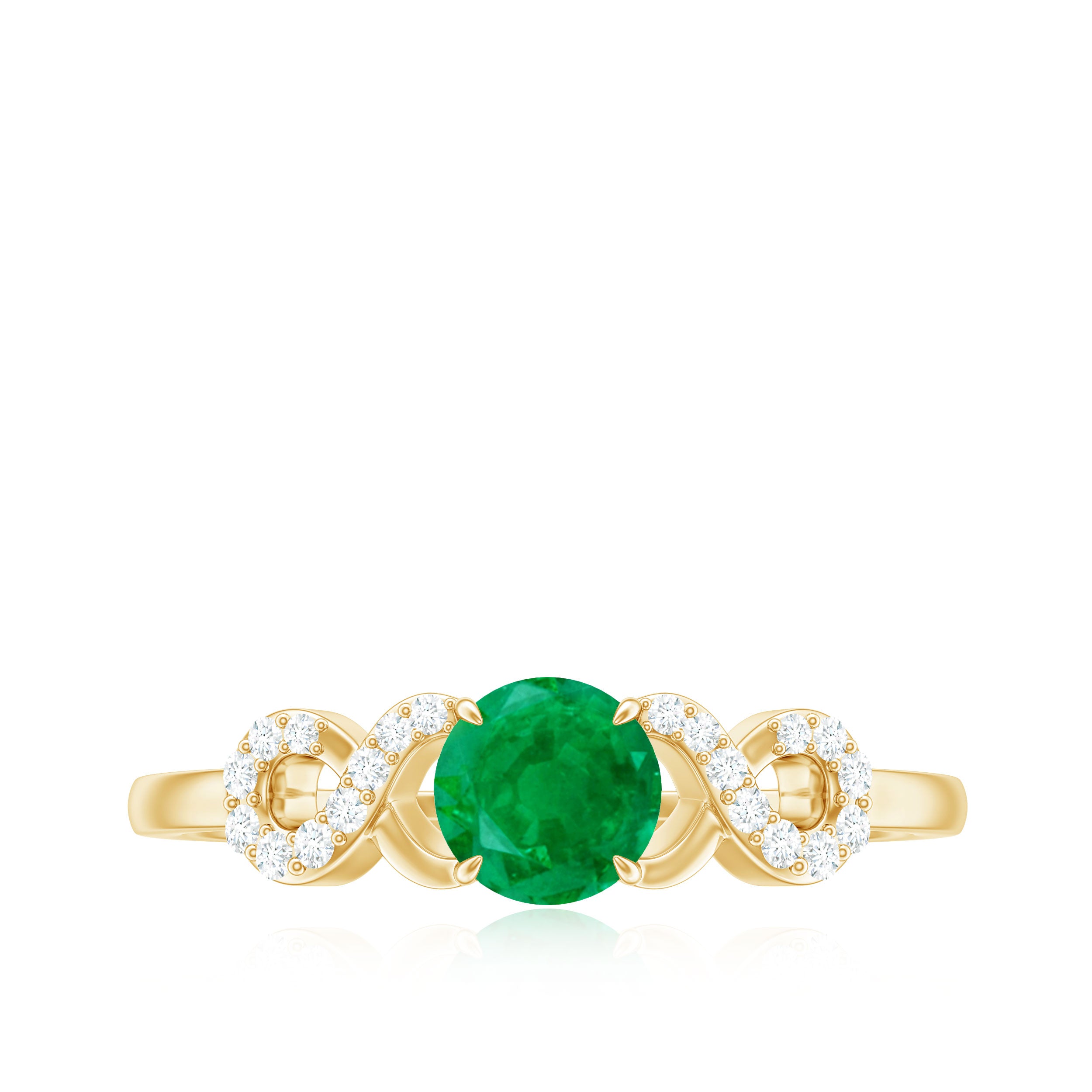 When words fall short, let the brilliance of this Promise Engagement Ring speak for your heart. This mesmerizing piece of jewelry captures the essence of everlasting love, featuring a 5 mm Round Shape Emerald at its center in Claw Setting. Surrounding it, a delicately crafted Diamond Criss Cross shank shimmers with grace, symbolizing two souls intertwined in an unbreakable bond. Designed for the modern romantic, this Emerald and Diamond Ring balances timeless elegance with contemporary artistry, making it the perfect choice for the one who completes your world. Beautifully presented in a signature jewelry box and available in various sizes, this Criss Cross Ring is a treasure meant to fit perfectly, just like your love. Whether presented during a heartfelt proposal or as a symbol of enduring affection, this Emerald Solitaire Ring transforms a single moment into forever.