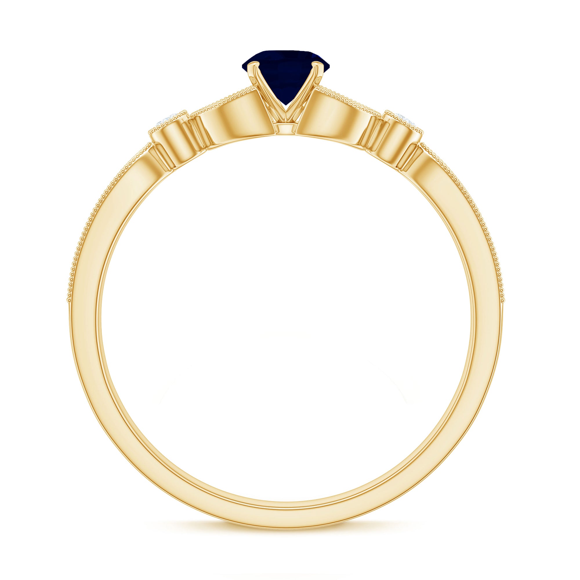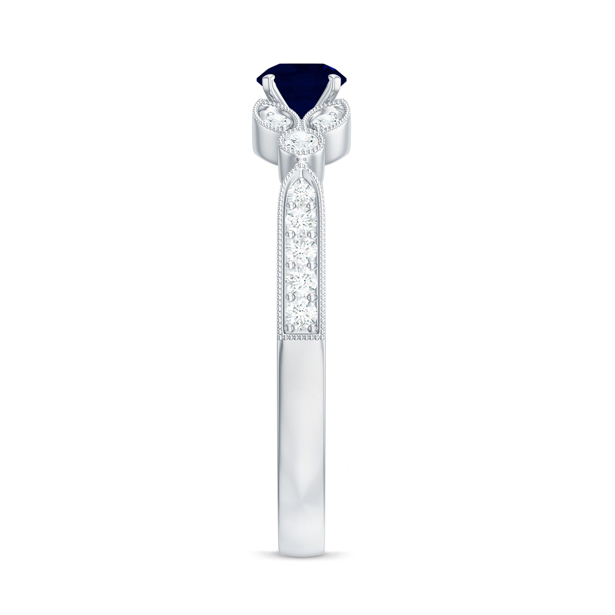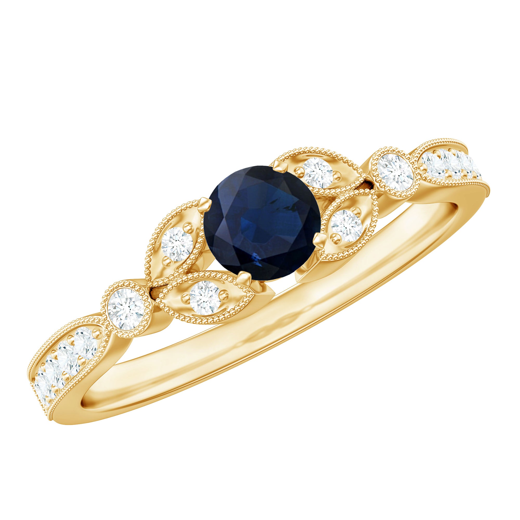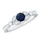 Make your statement style with this Unique Engagement Ring is adorned with Round Shape Blue Sapphire set as Solitaire and Round Shaped Diamond in Side Stones. Beaded Engraved design ring is a perfect gift for your loved ones.