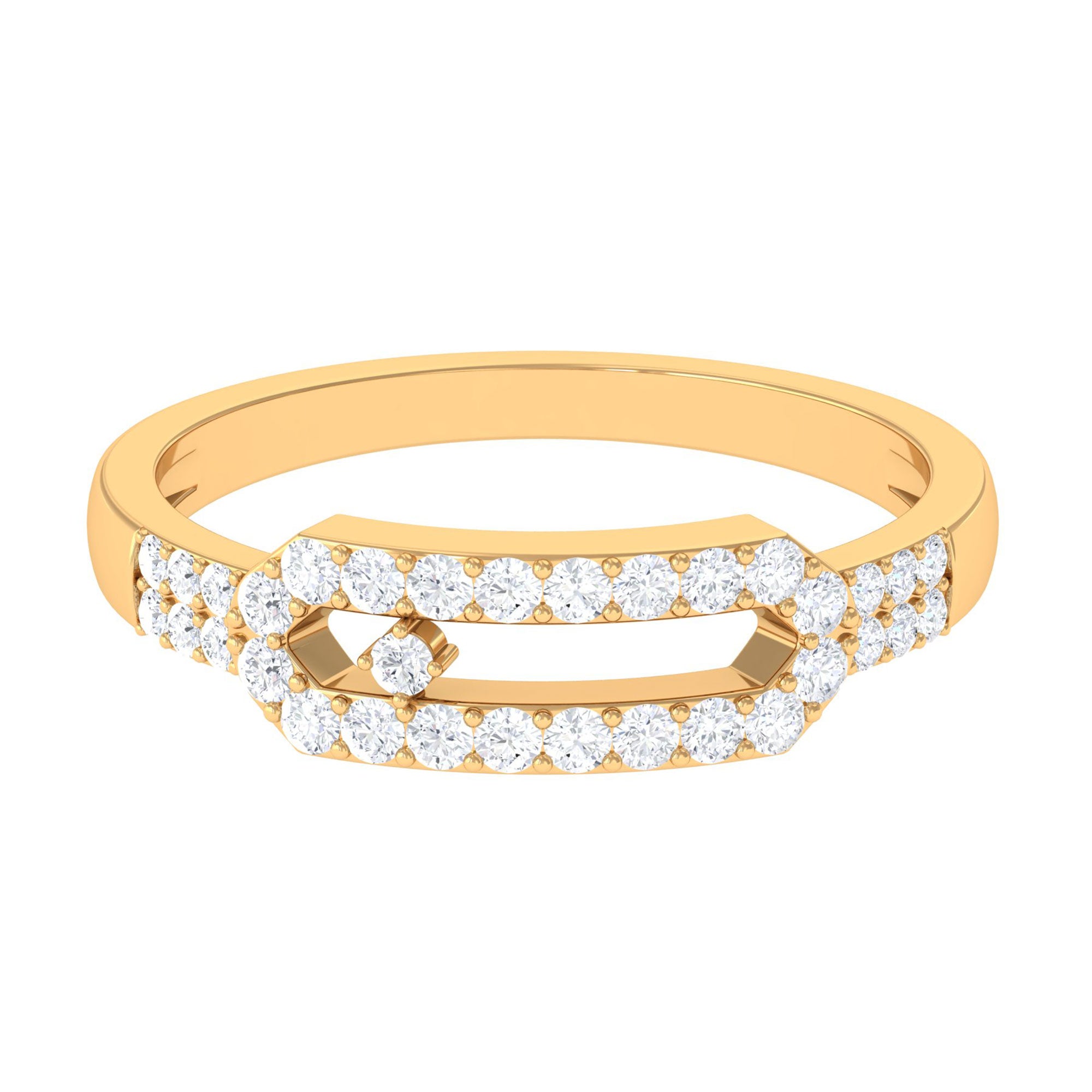 This Dainty Ring is embellished with Round Cut Diamond sits in Prong Setting in Diamond Frame with Side Stones. This Minimal Ring is crafted in Gold Metal.