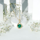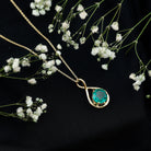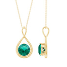 This captivating pendant necklace features a stunning Created Emerald as its centerpiece, adorned by graceful ribbons of Gold that swirl around it. The pendant is further enhanced by solitaire gemstones, elegantly complementing the overall design.