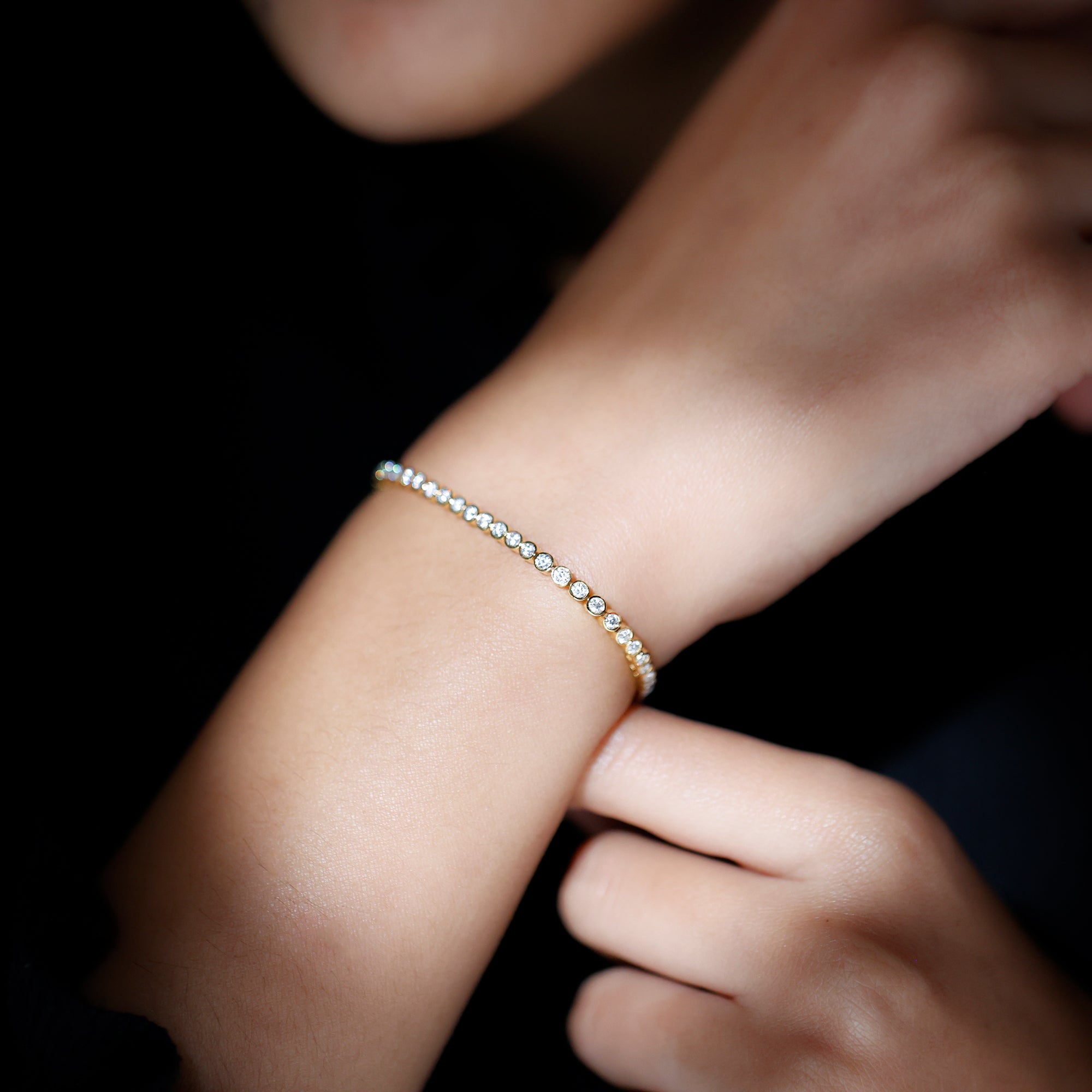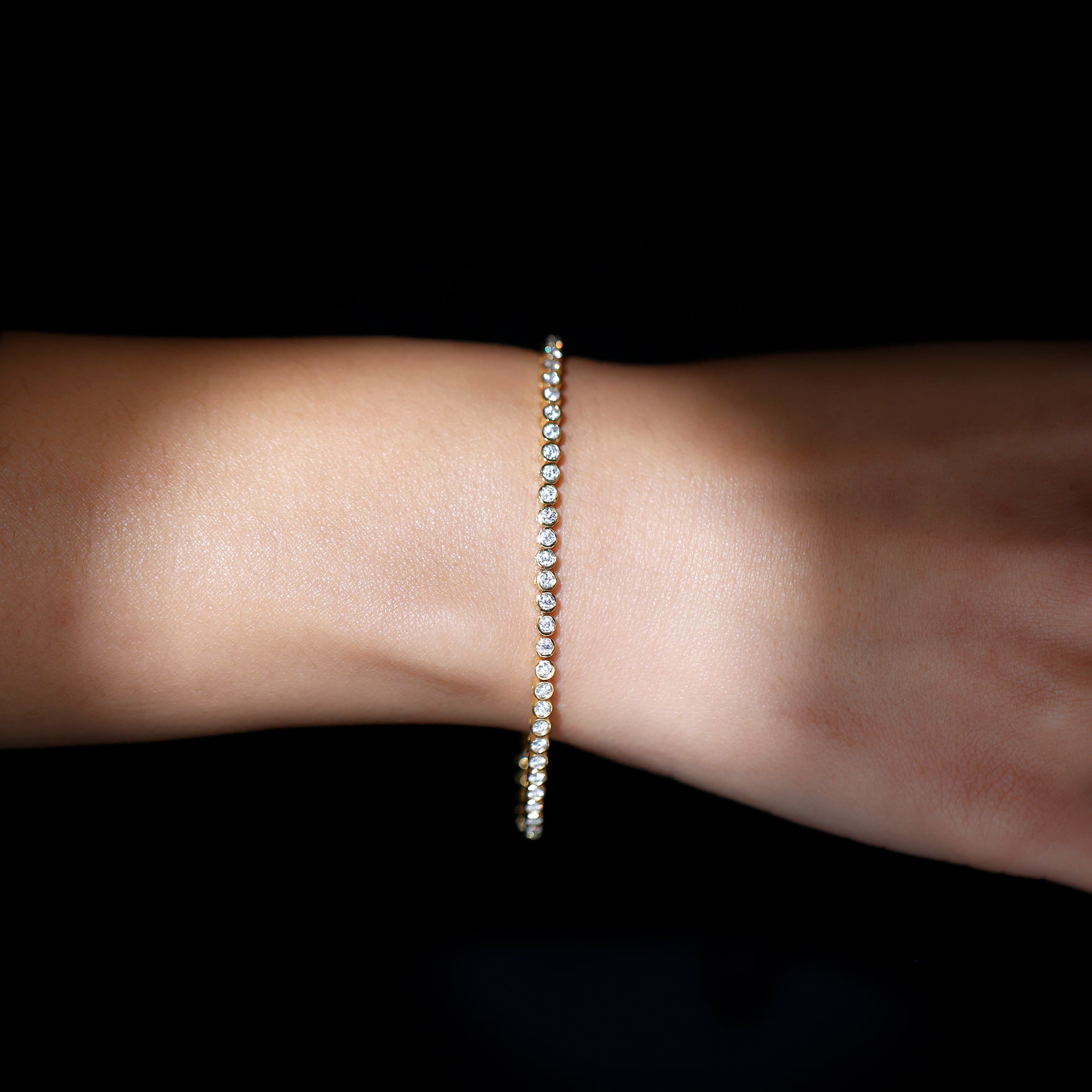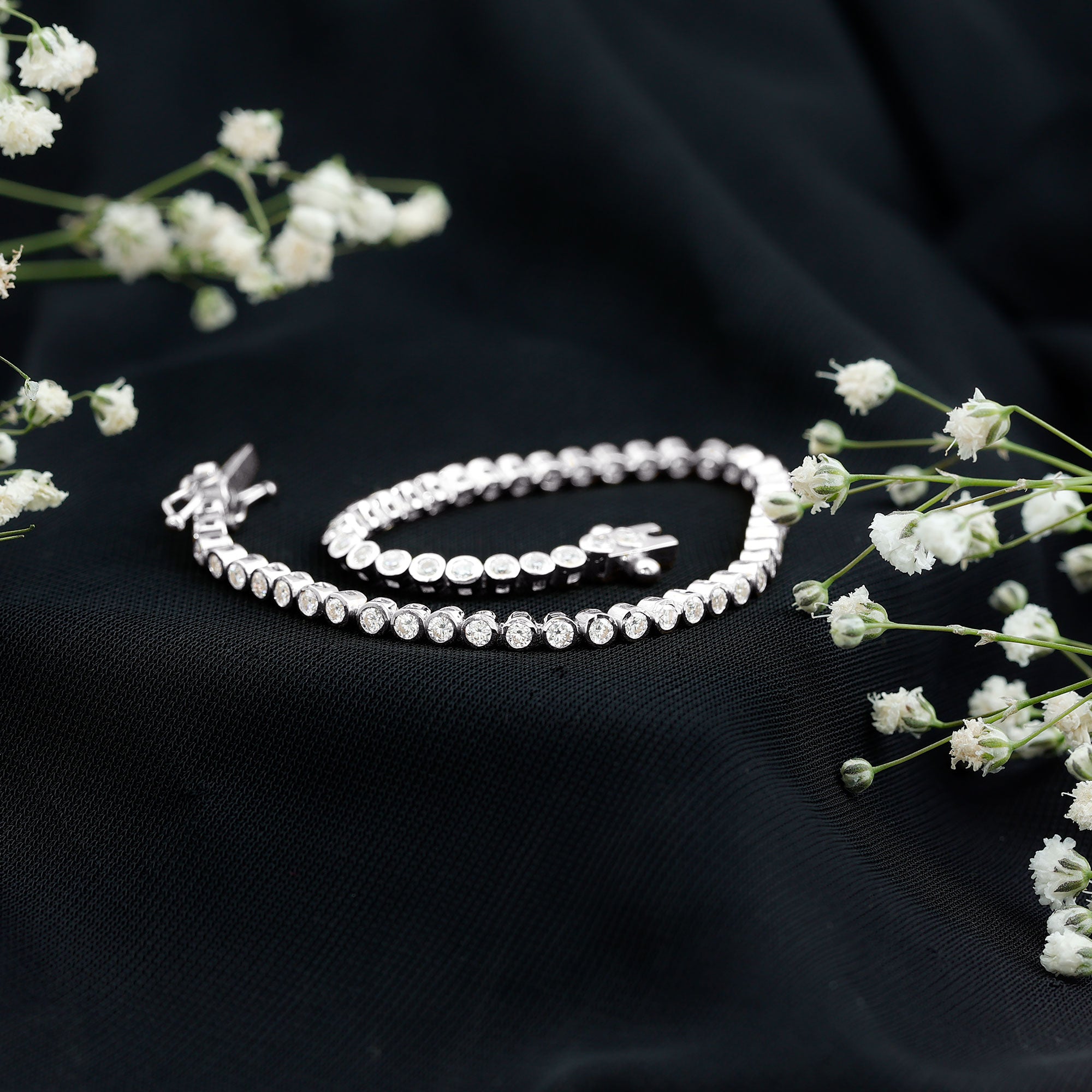 Indulge in the timeless sophistication of this exquisite Moissanite Tennis Bracelet, a piece designed to captivate from every angle. Each round cut Moissanite stone is securely nestled in an elegant bezel setting, forming a radiant row of brilliance that circles the wrist with effortless grace. Crafted with D-VS1 quality Moissanites, this Eternity Bracelet brings together exceptional sparkle and a timeless charm, creating a luxurious accessory that stands out without overwhelming. Perfect for celebrating life’s most meaningful moments, this Bezel Set Bracelet makes a memorable gift for birthdays, anniversaries, or any occasion that calls for something truly special. Its evergreen style allows it to complement both everyday outfits and more formal attire, making it a versatile treasure in any jewelry collection. Presenting this 3 CT Tennis Bracelet to someone you love is a heartfelt expression of admiration, appreciation, and enduring affection. Let this breathtaking piece be the reason your partner smiles a little brighter and feels deeply cherished, knowing it was chosen with love and intention.