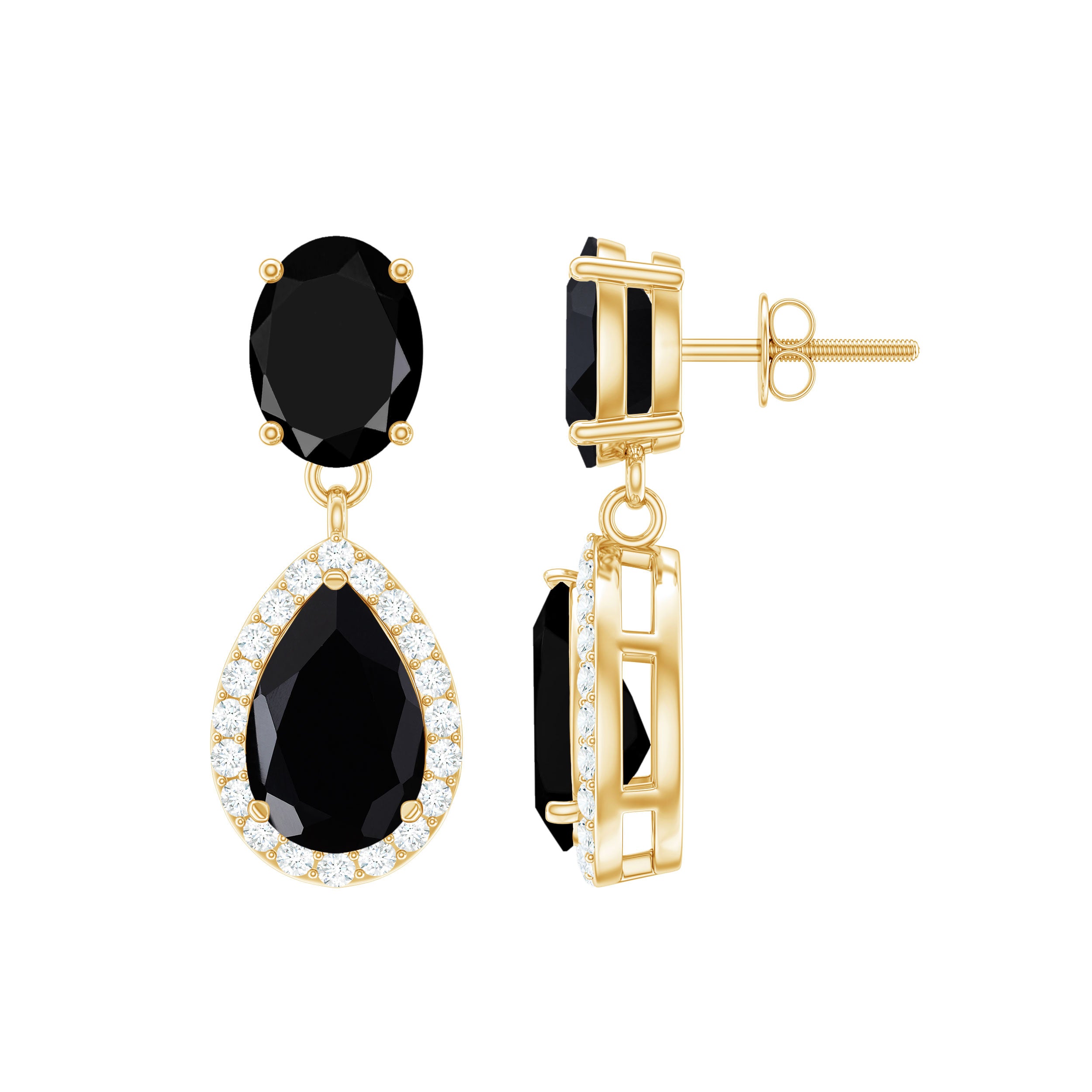 These Dangle Drop Earrings are embellished with Oval Shape Black Onyx Gemstone from which Pear Shape Black Onyx Gemstone is hanged which is encircled with Round Shape Diamond in Halo, crafted in a Solid Gold.
