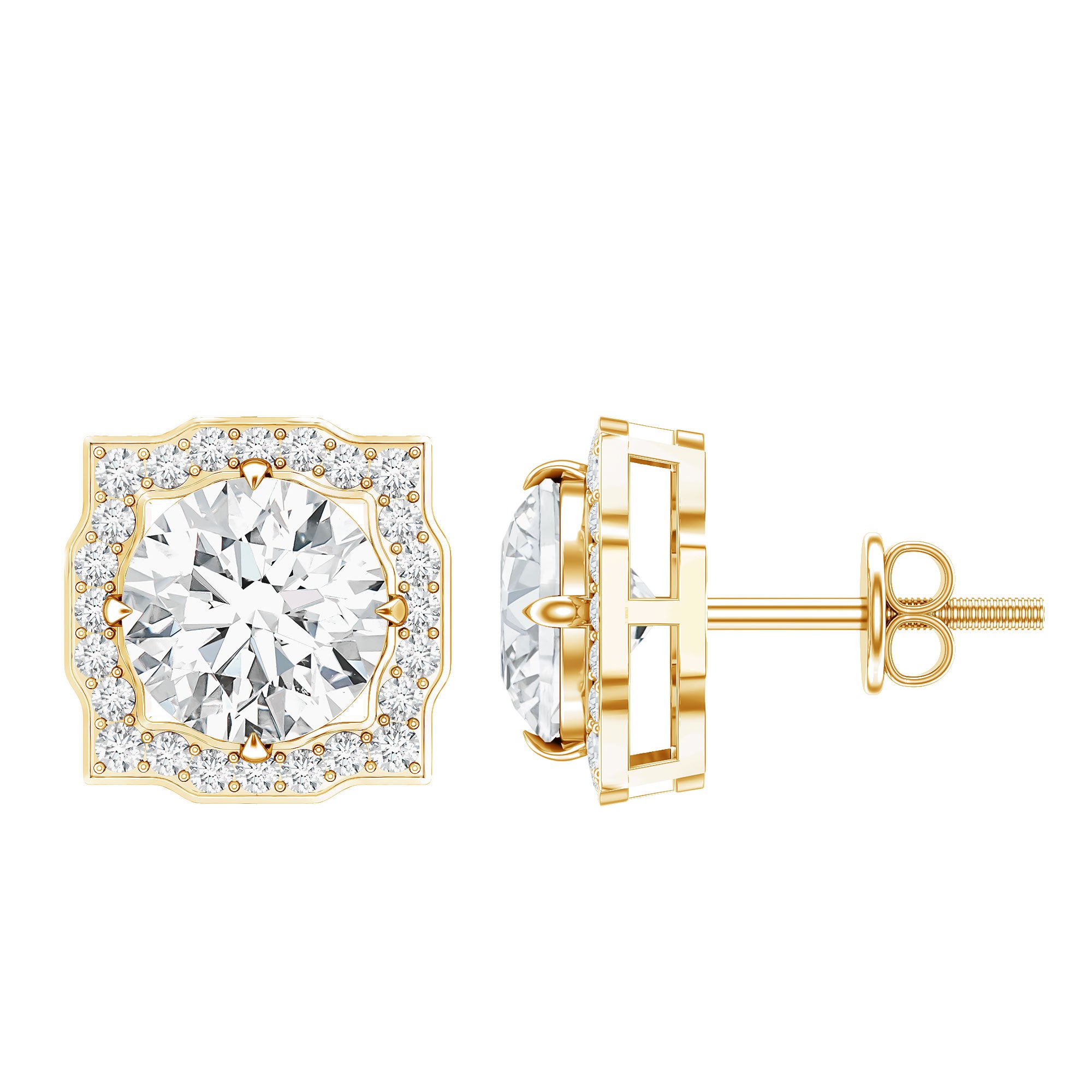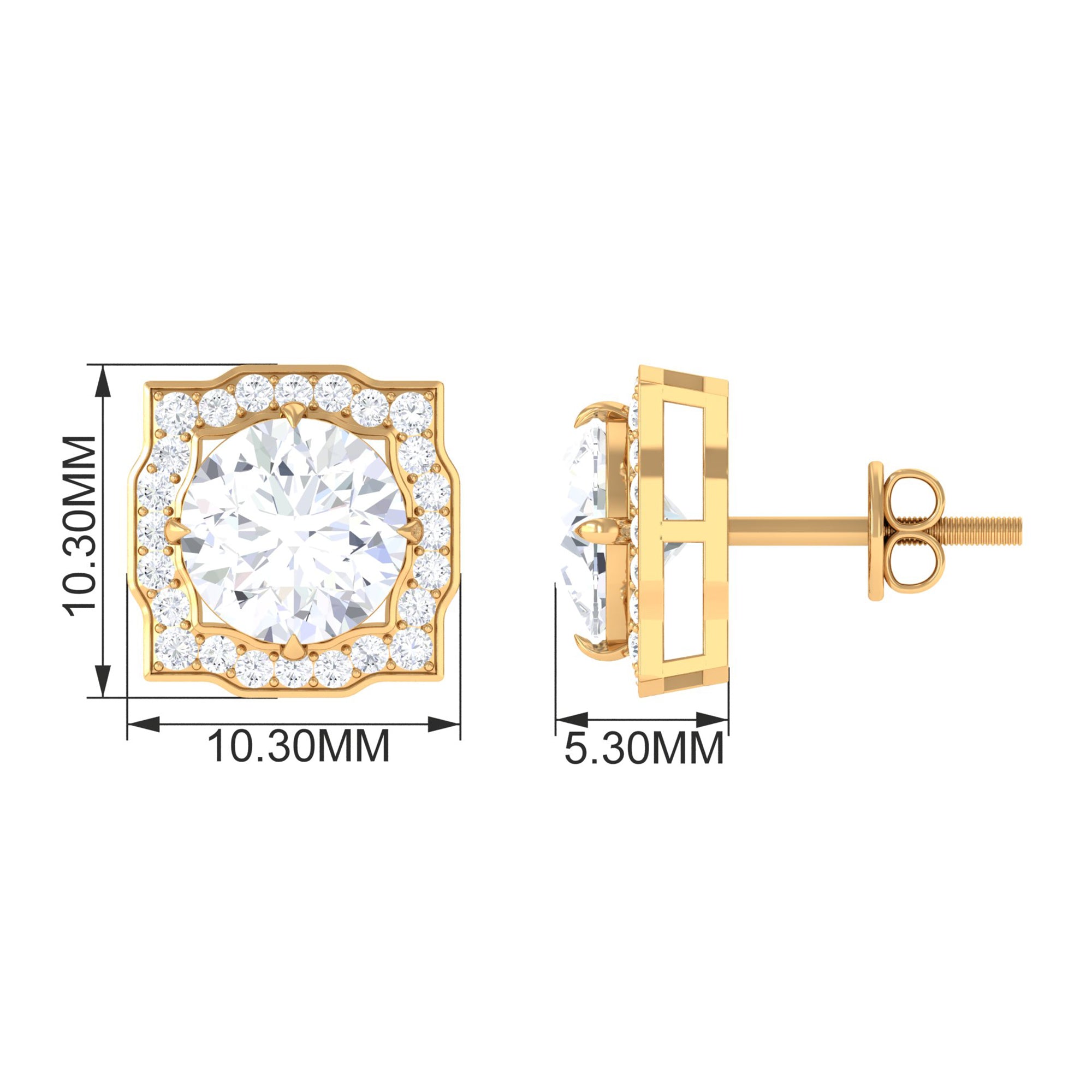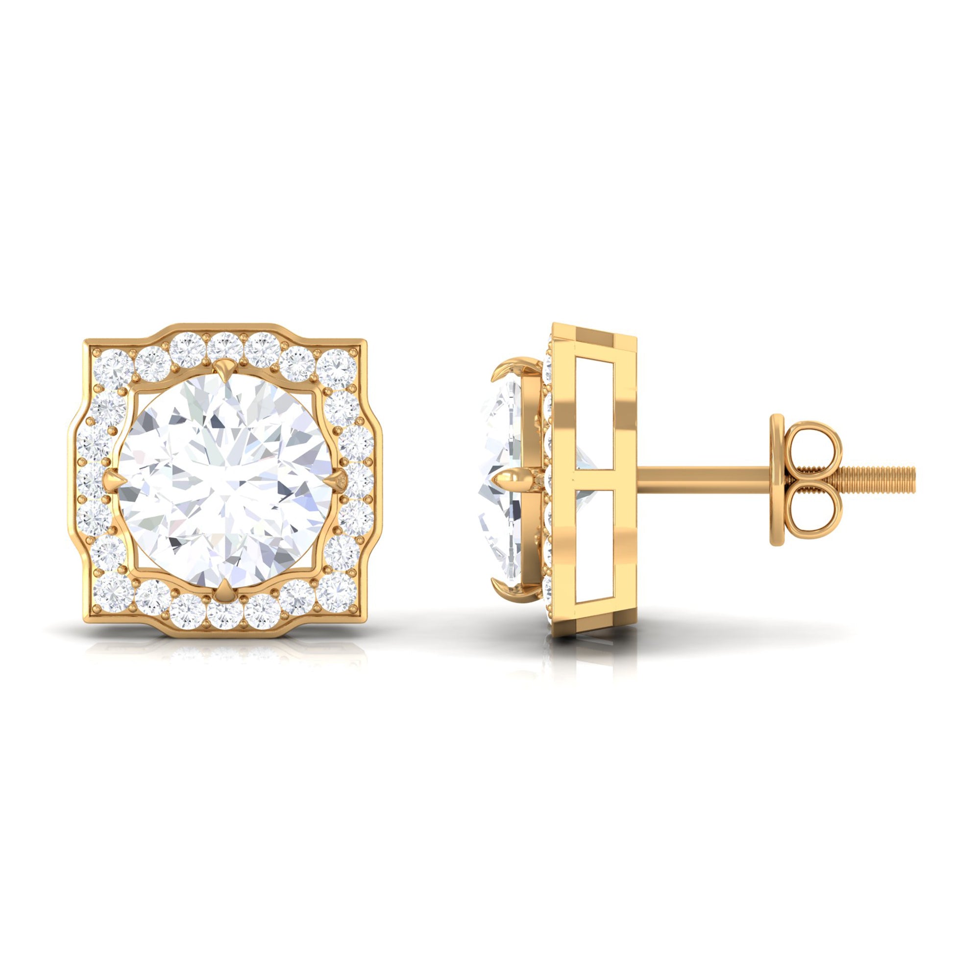 These Statement Stud Earrings embellished with Brilliant Round Cut Moissanite is set at the center as Solitaire in a Prong Setting encircled with small Brilliant Round Cut Moissanites, crafted in a Solid Gold Metal.