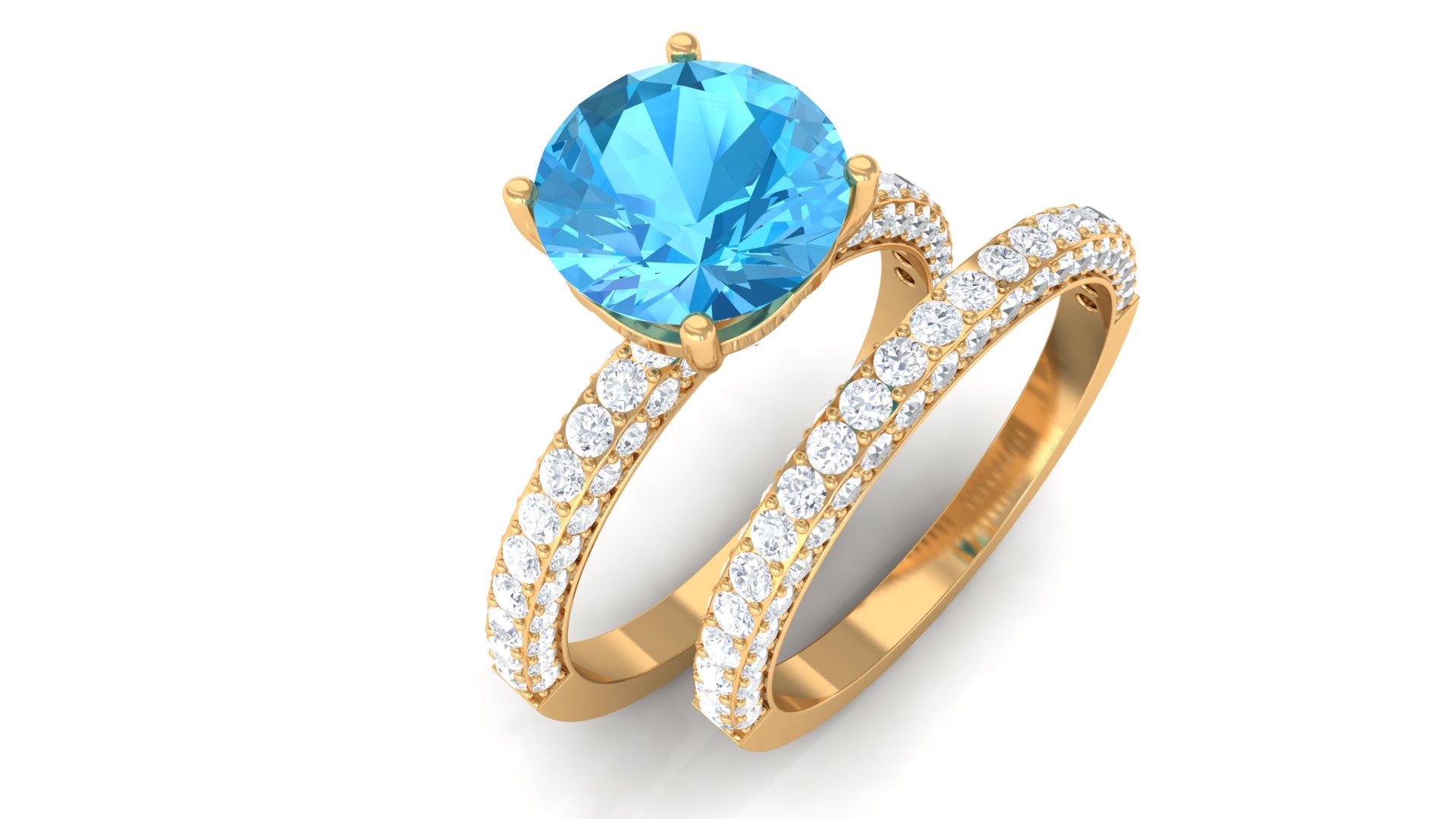 Impress your wife with your excellent choice by giving her this gorgeous Wedding Ring Set designed with Swiss Blue Topaz Solitaire Ring and a Half Eternity Band Ring adorned with Moissanites.