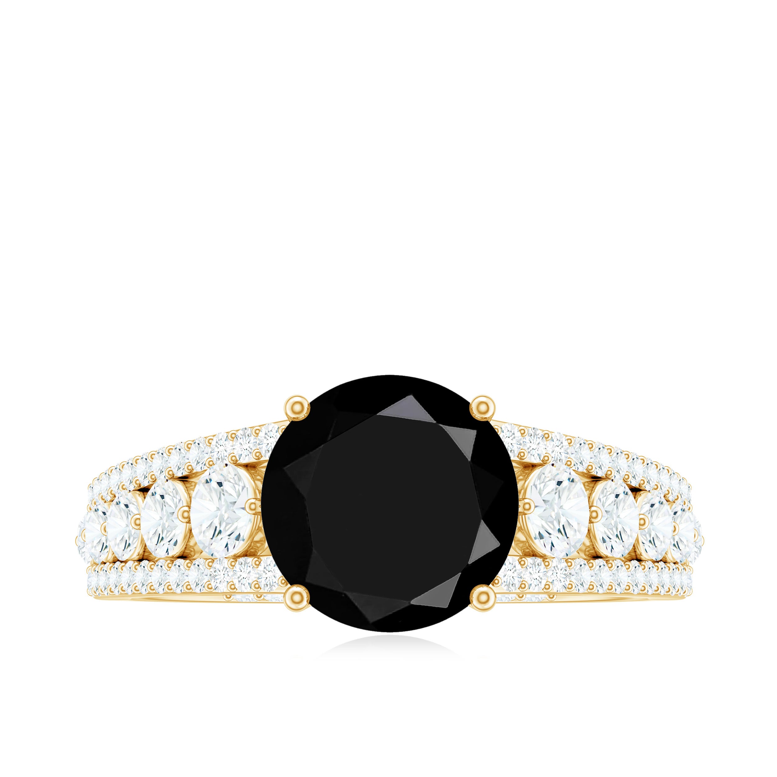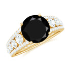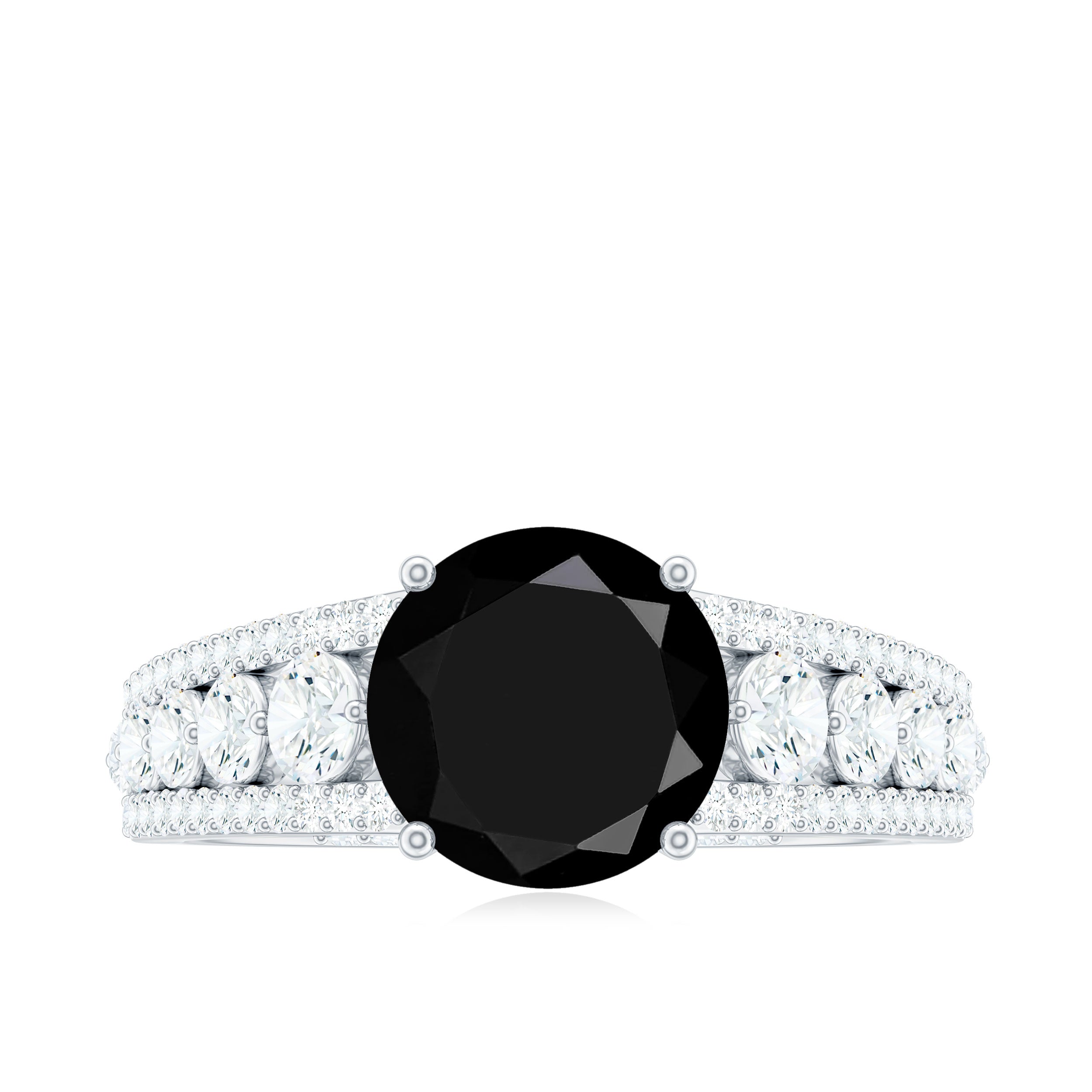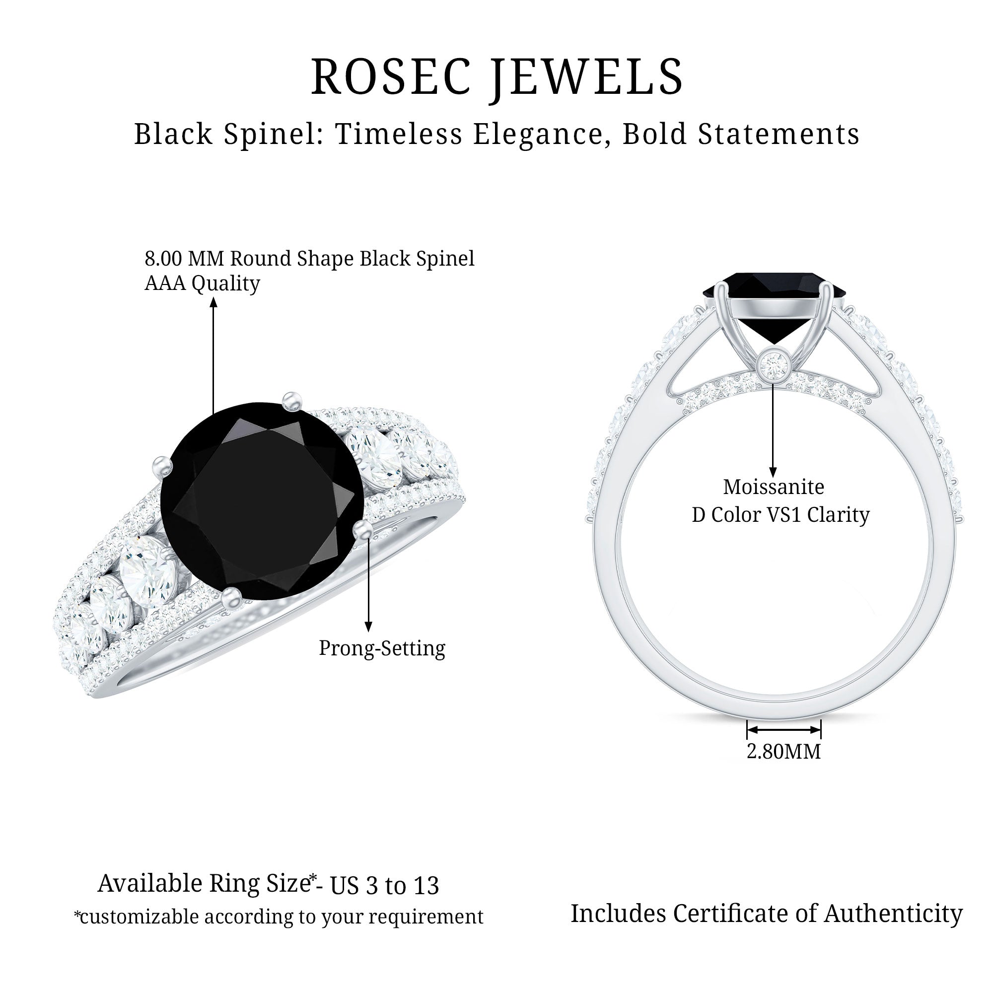 Take her breath away with this Designer Engagement Ring and make your special day truly unforgettable. This Fine Engagement Ring features an 8 MM Round Shape Black Spinel gemstone set in Prong Setting, flanked with Moissanite Side Stones. The bridge of the stunning band is adorned with petite Round Shape Moissanite gemstones, for a luxurious appeal. This Black Spinel Engagement Ring is meticulously crafted to perfectly fit her ring finger.