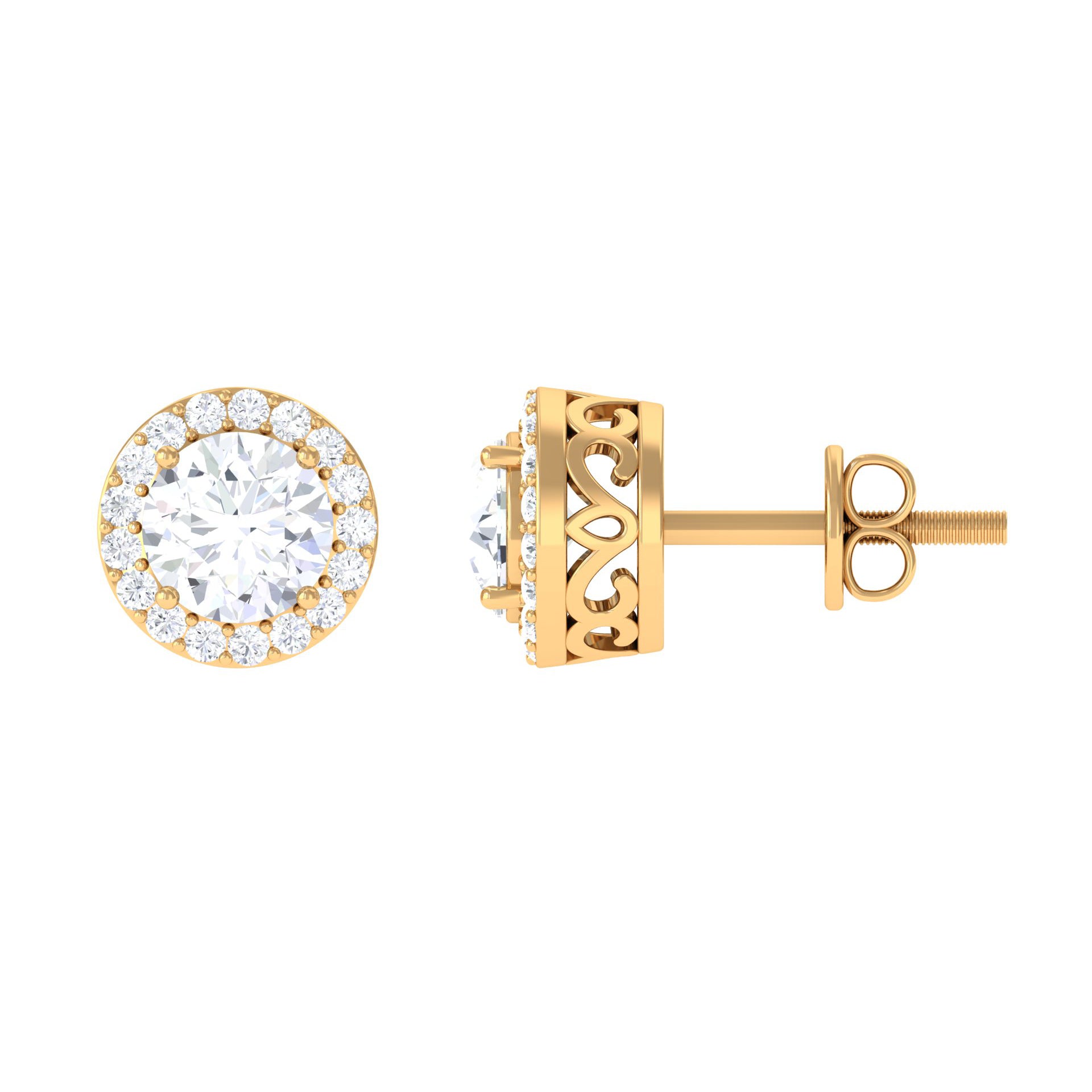 Adorn yourself with these stunning Stud Earrings, featuring a Round Cut Moissanite center surrounded by a halo of sparkling Round Cut moissanite in an Accent Setting. Made of Gold with Screw Back closure, these Moissanite Stud Earrings are sure to be a favorite accessory.
