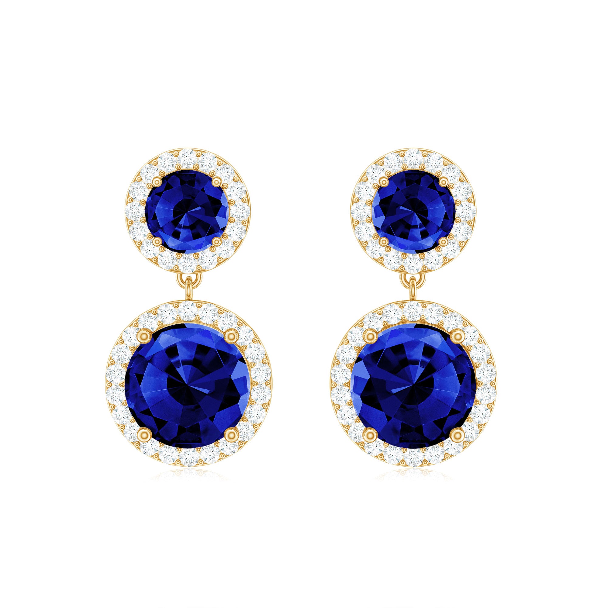 Besides serving to adorn the body, these created blue sapphire earrings are also a royal symbol of love. These dangle earrings are embellished with created blue sapphire and Moissanite accentuating the piece by creating scintillating halo. Get these dangle earrings for your lady and make her feel that your for her is eternal. She will look pretty adorning these created blue sapphire and Moissanite earrings for sure!