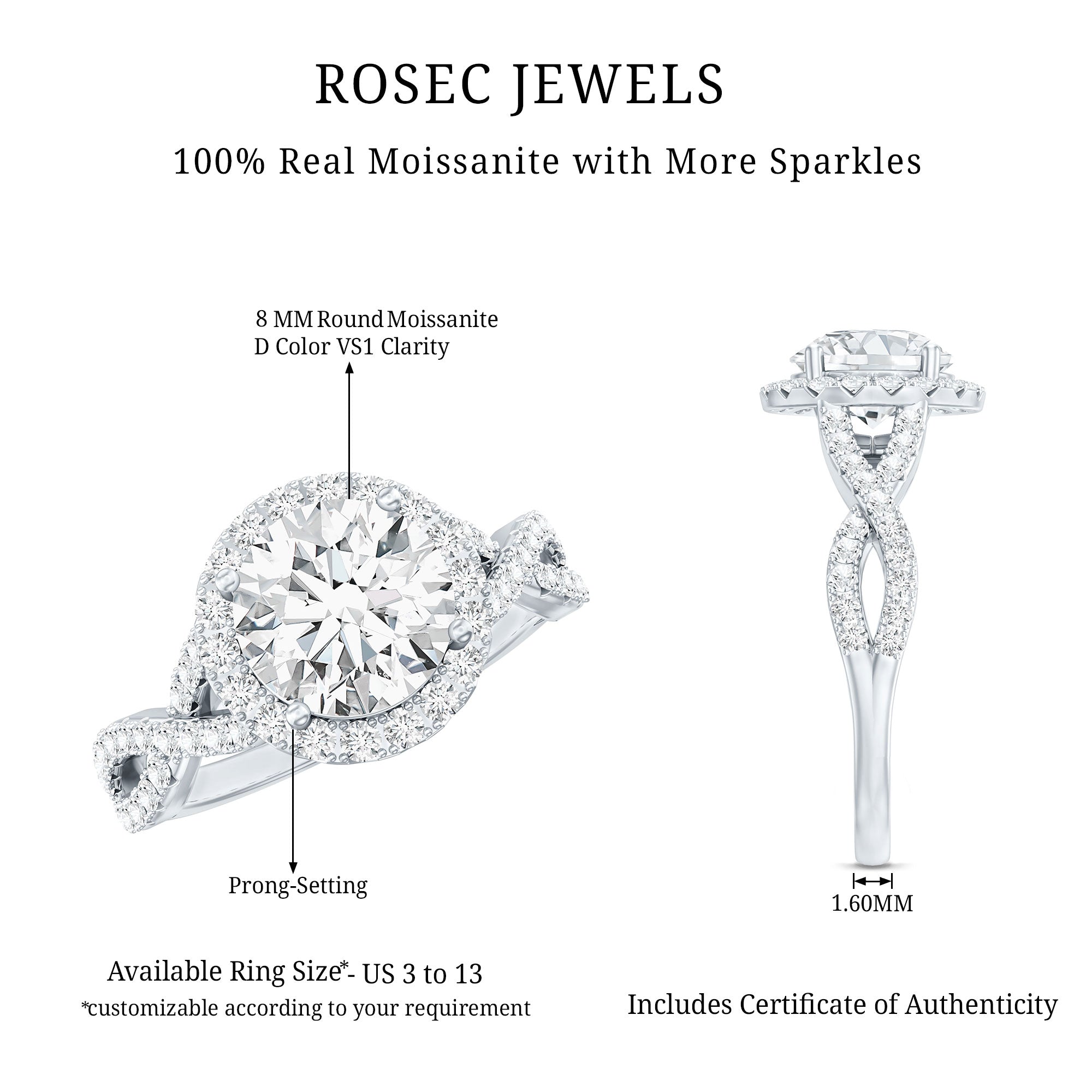 Make a bold statement on your special day with this exquisite Moissanite Engagement Ring. Featuring a stunning round cut moissanite set in a secure prong setting at the center surrounded by a halo, this ring is elegantly adorned with more shimmering dainty moissanite on a vintage crossover band. This Moissanite Halo Engagement Ring is a true statement piece, guaranteed to capture the attention of everyone around you and make your special day even more memorable.