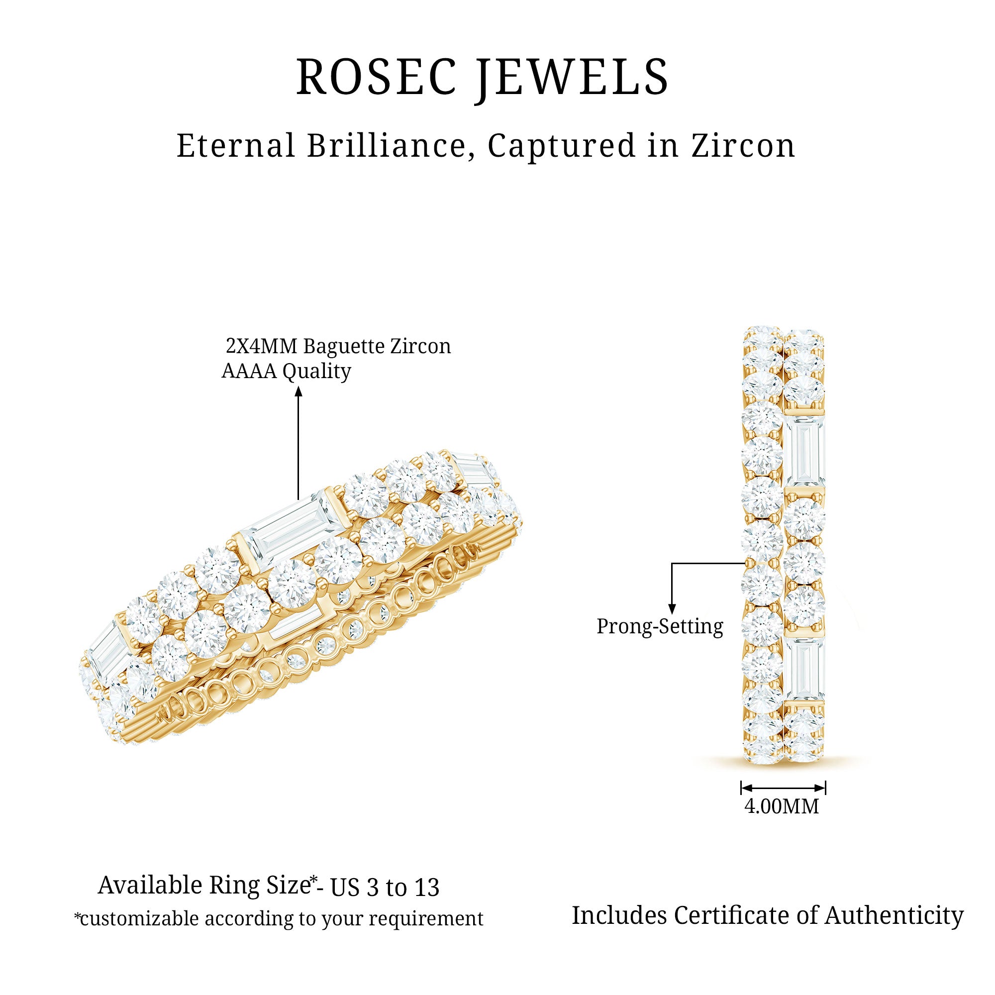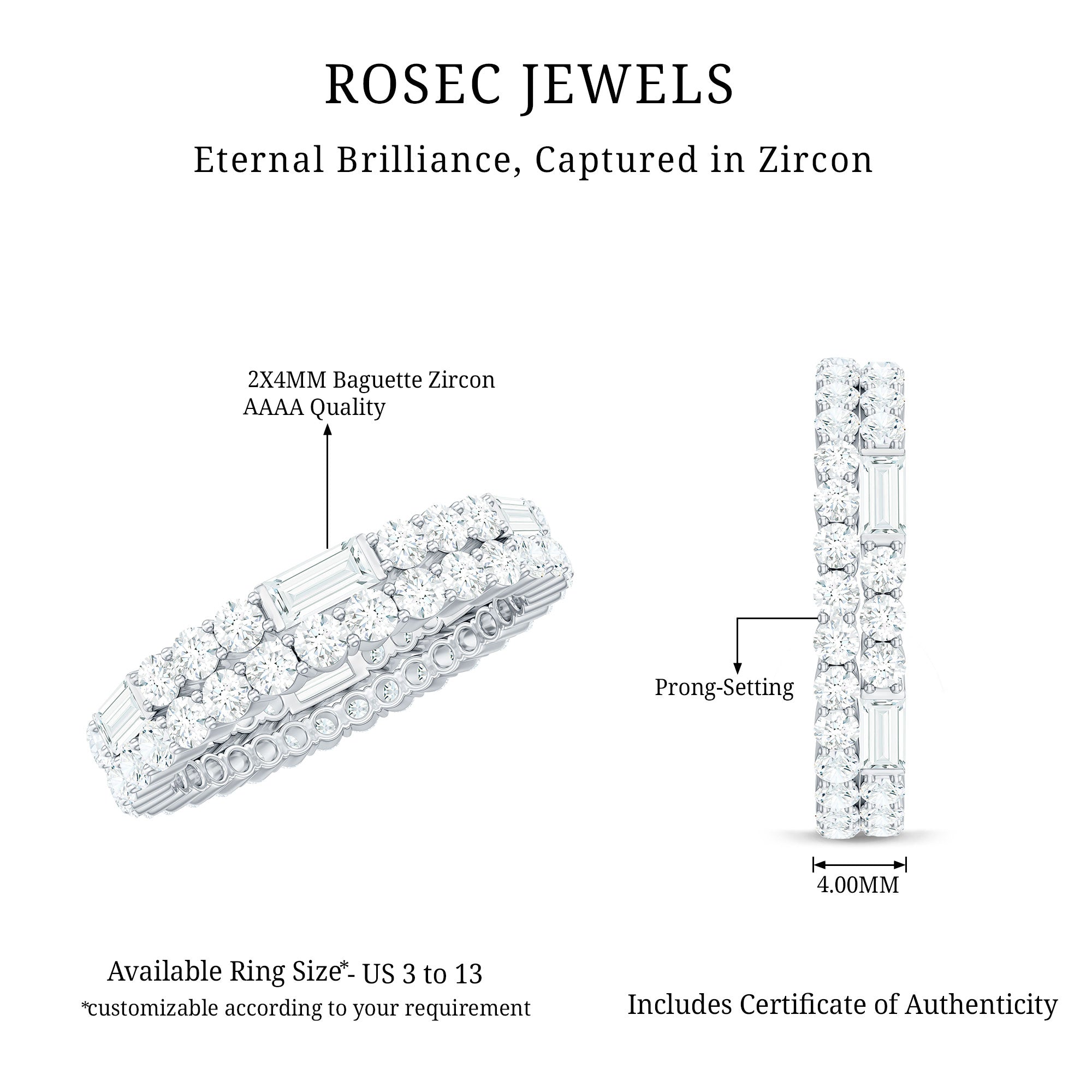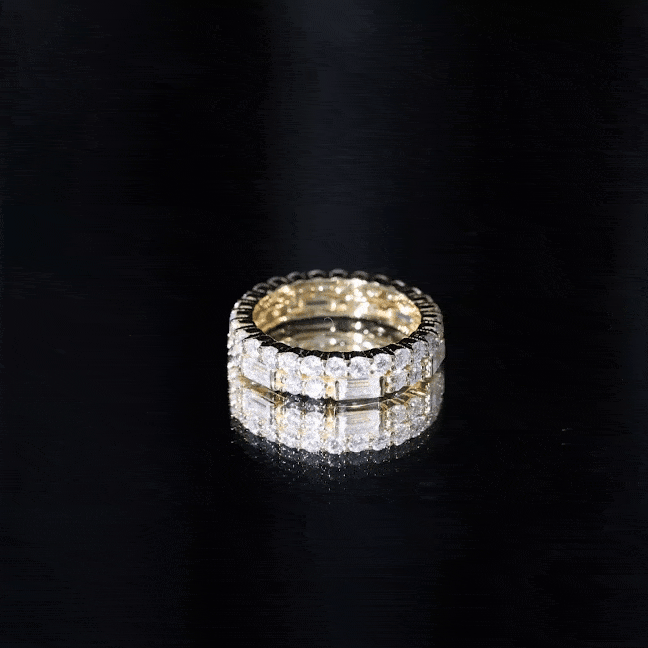 The Cubic Zirconia Eternity Ring is a beautiful and elegant piece of jewelry featuring two rows of sparkling Baguette and Round Shape Zircon Stones in Prong Setting. The stones encircle the entire band, creating a continuous ring of shimmering brilliance. This classic design is perfect for a variety of occasions, whether its worn as a wedding band, anniversary gift, or simply as an everyday accessory to add a touch of glamour to any outfit.