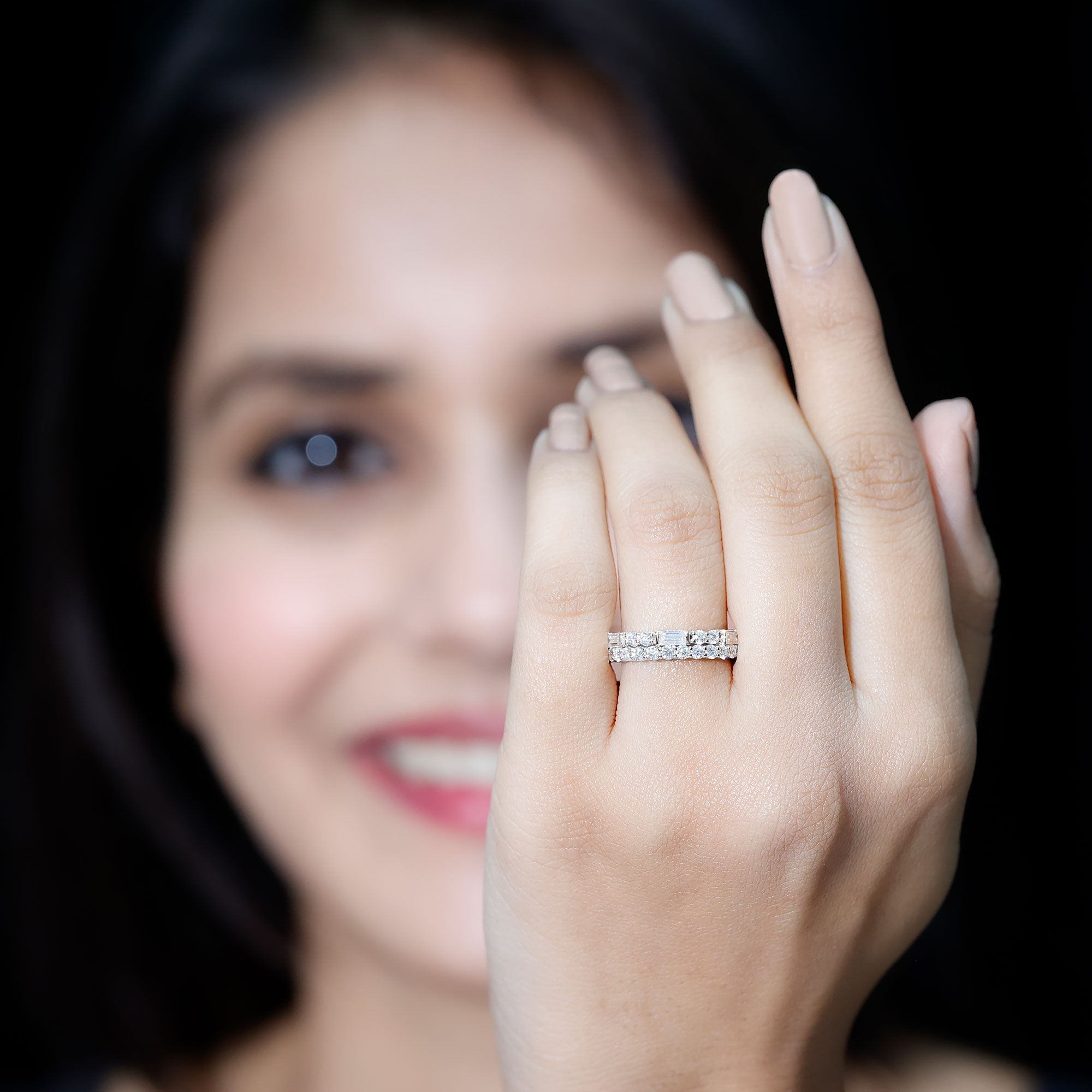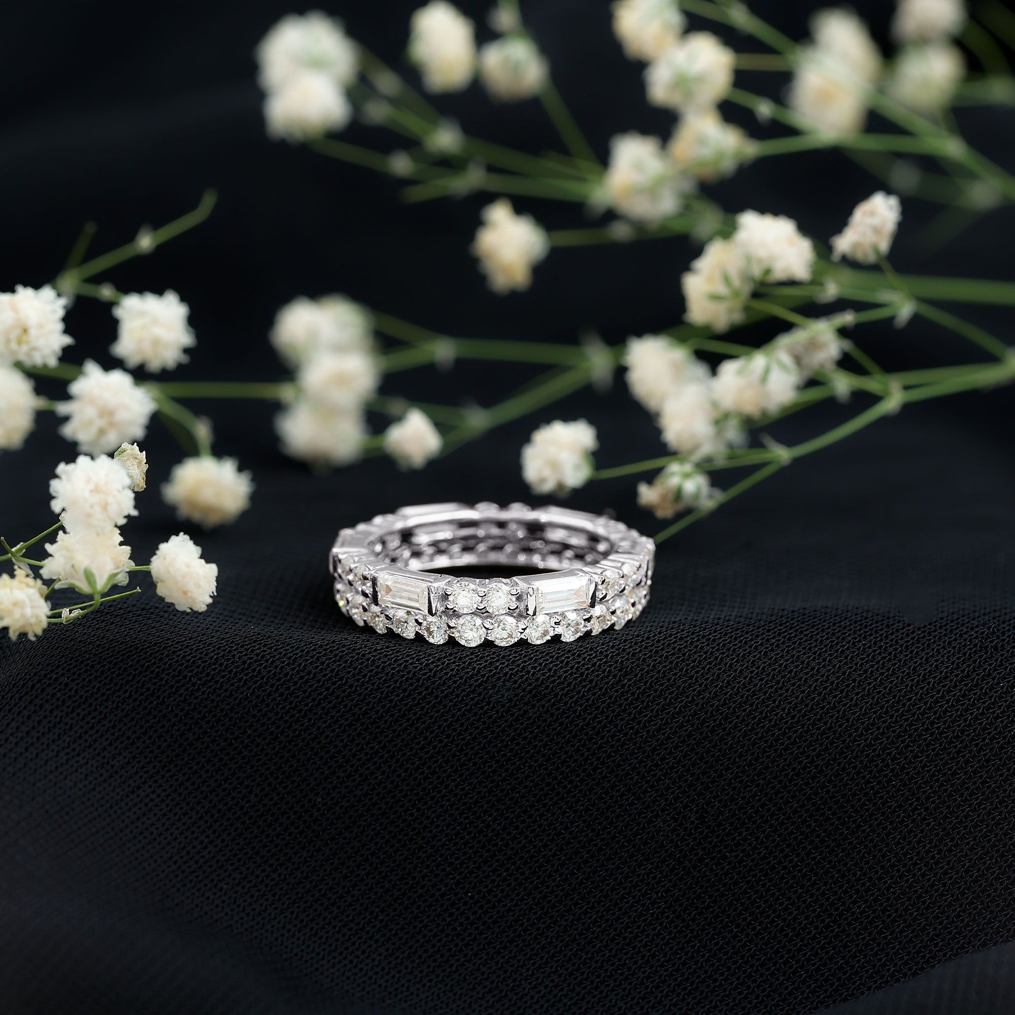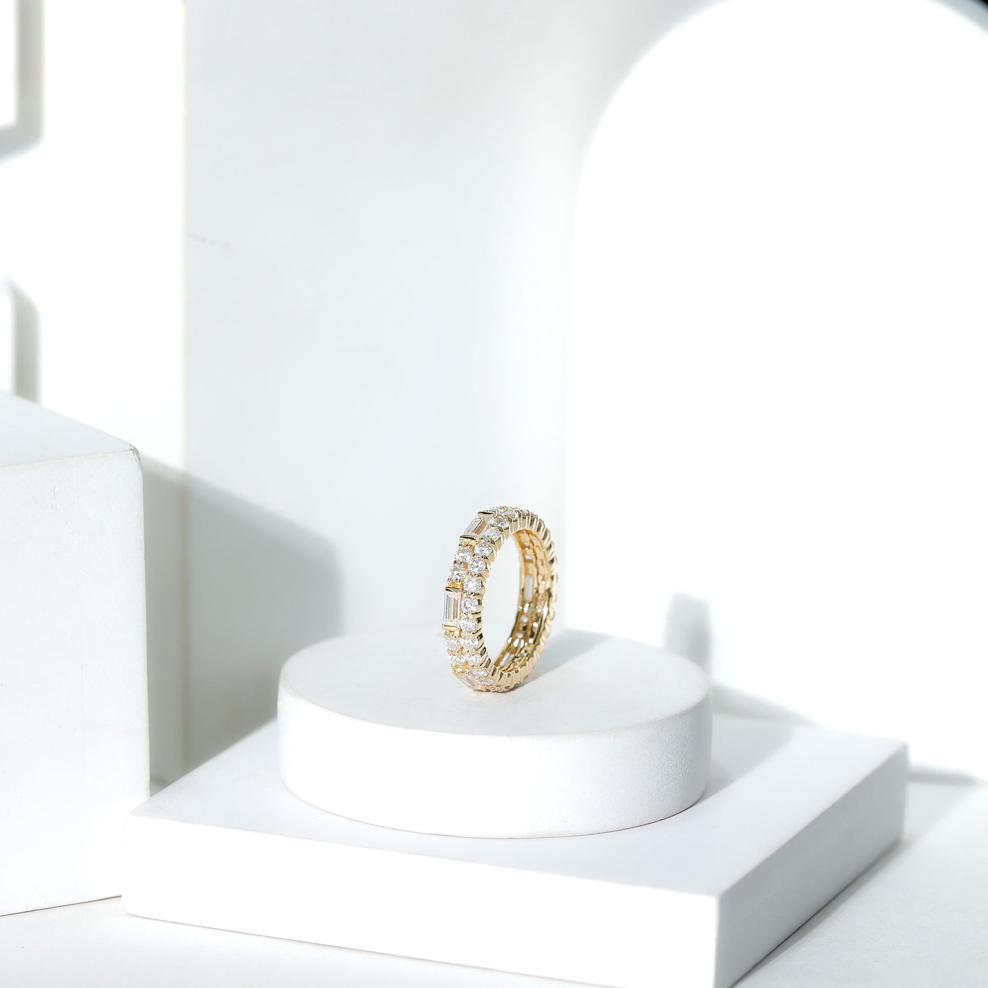 The Cubic Zirconia Eternity Ring is a beautiful and elegant piece of jewelry featuring two rows of sparkling Baguette and Round Shape Zircon Stones in Prong Setting. The stones encircle the entire band, creating a continuous ring of shimmering brilliance. This classic design is perfect for a variety of occasions, whether its worn as a wedding band, anniversary gift, or simply as an everyday accessory to add a touch of glamour to any outfit.