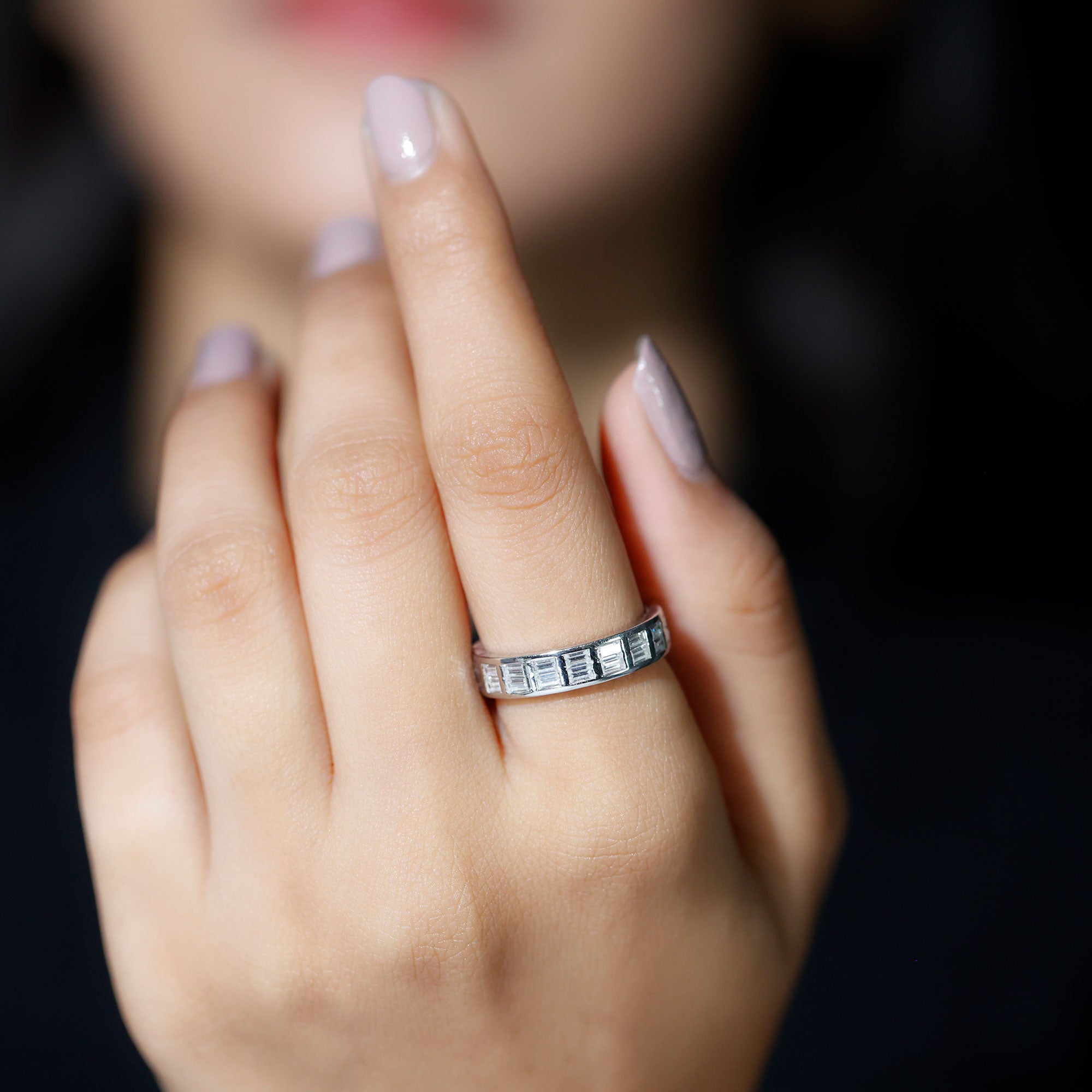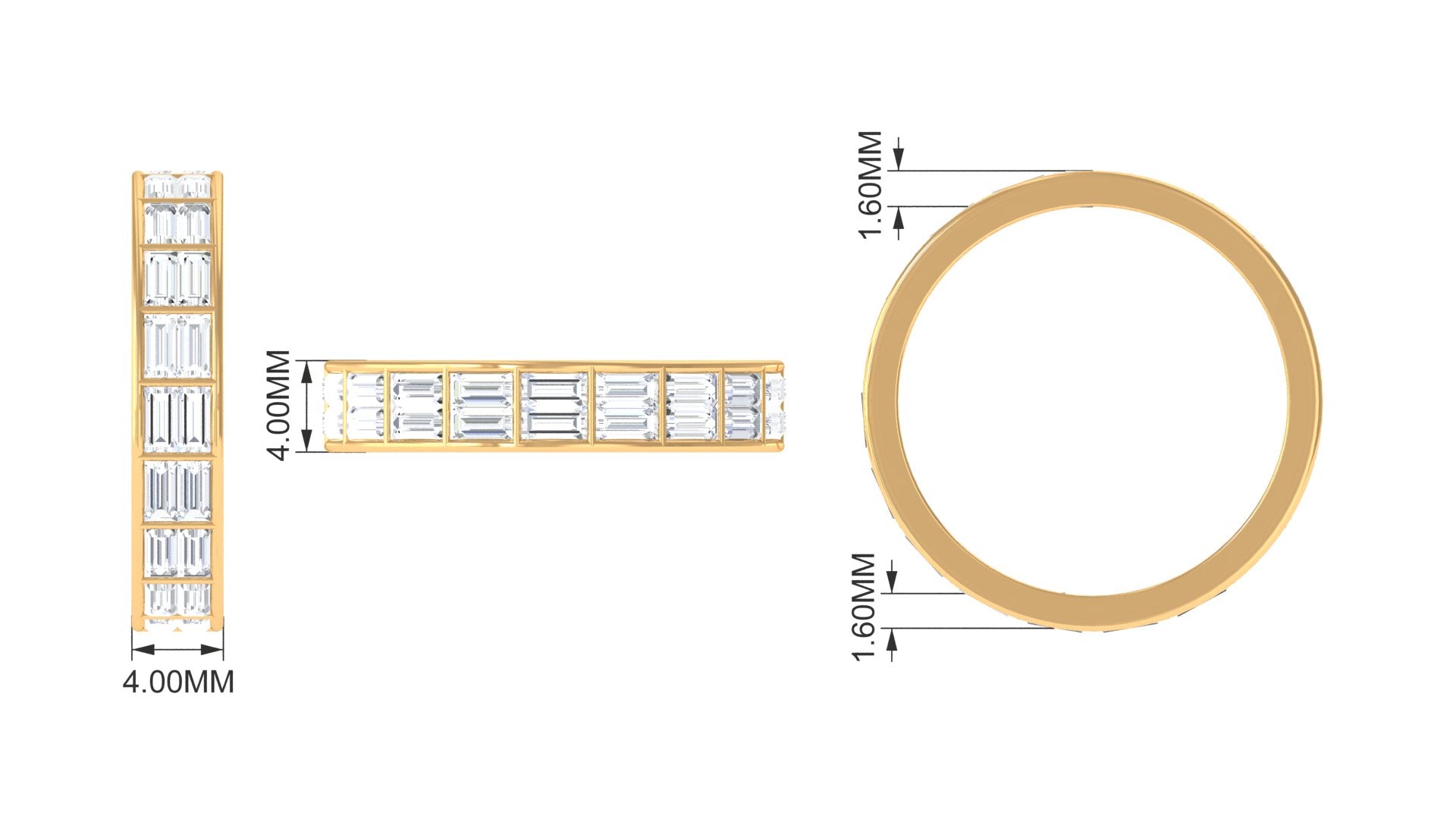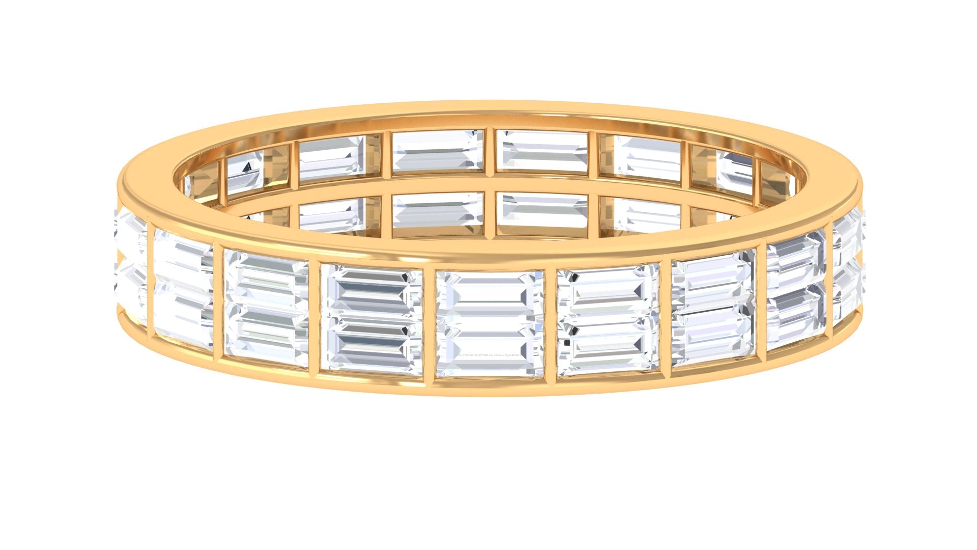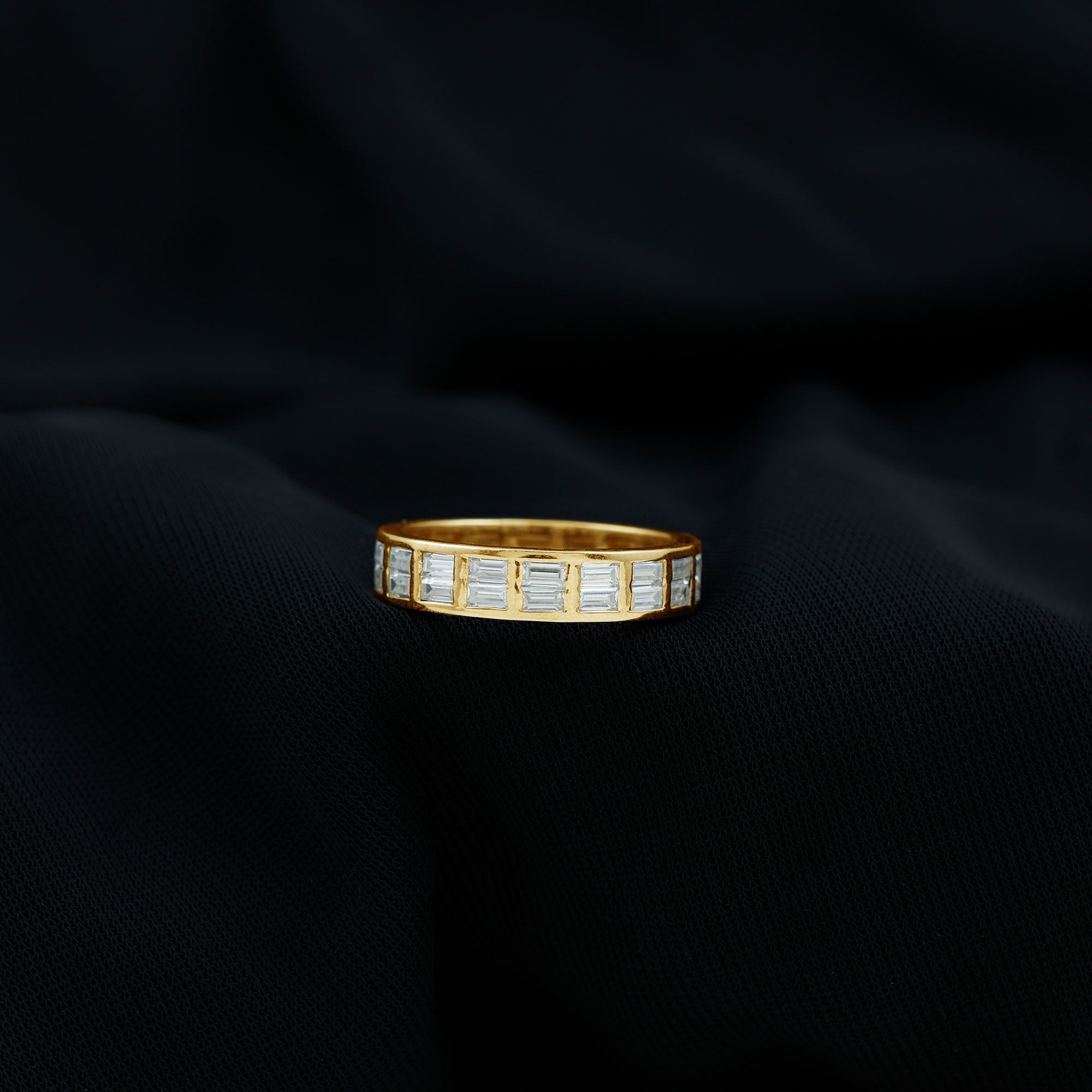 Stylish, distinctive Cubic Zirconia Band Ring which you can wear as an everyday staple or as an office jewelry also. The Baguette Cut Zircon in Channel Setting on Two Row Band Ring adorns this elegant jewelry. The options are endless with this Eternity Band Ring, you can also stack with your other rings too. How will you wear yours? The ring carries a total weight of 3 Carat. All our gemstones are certified and undergoes strict quality check.
