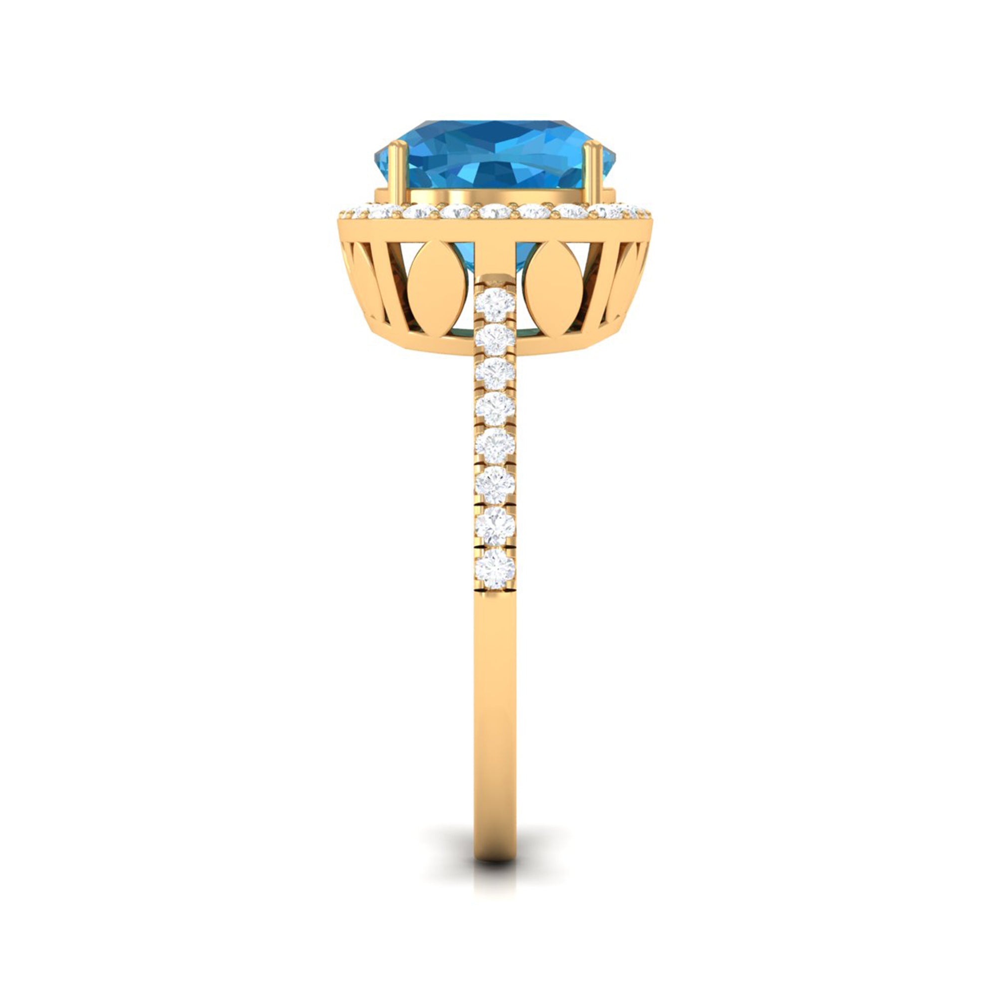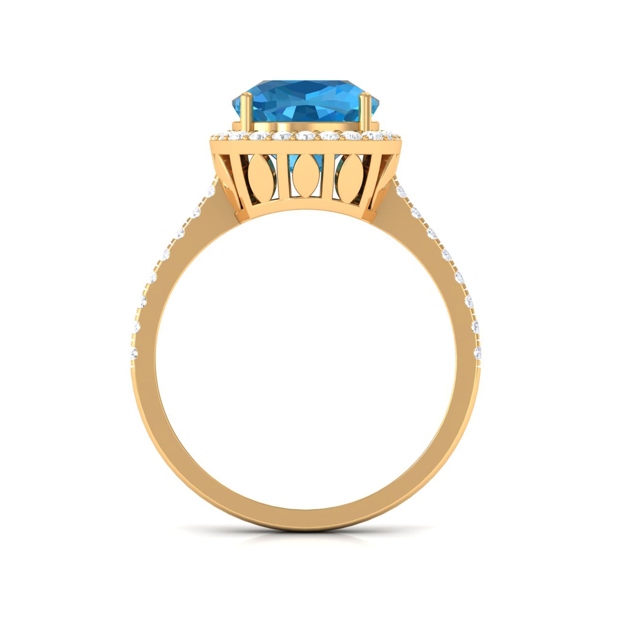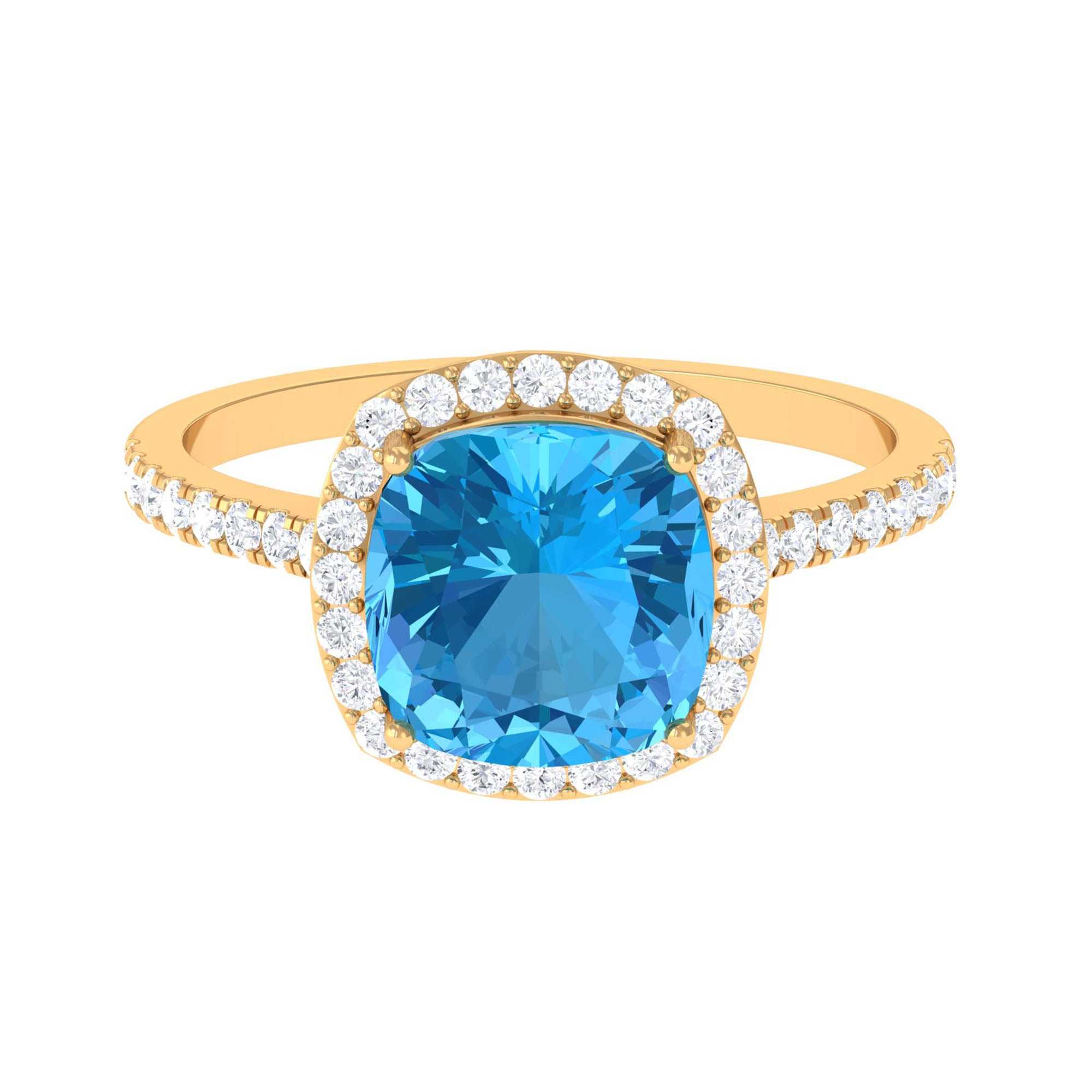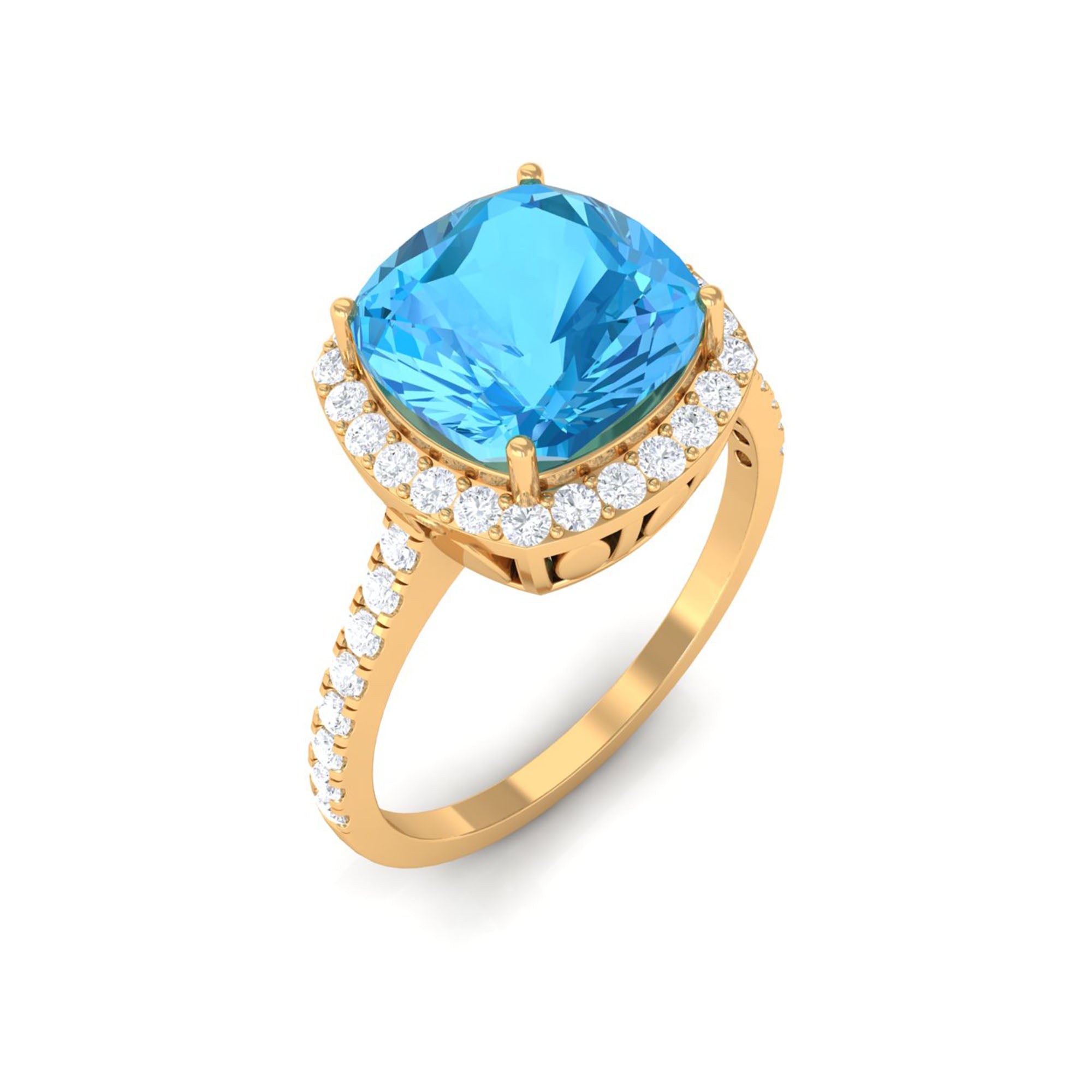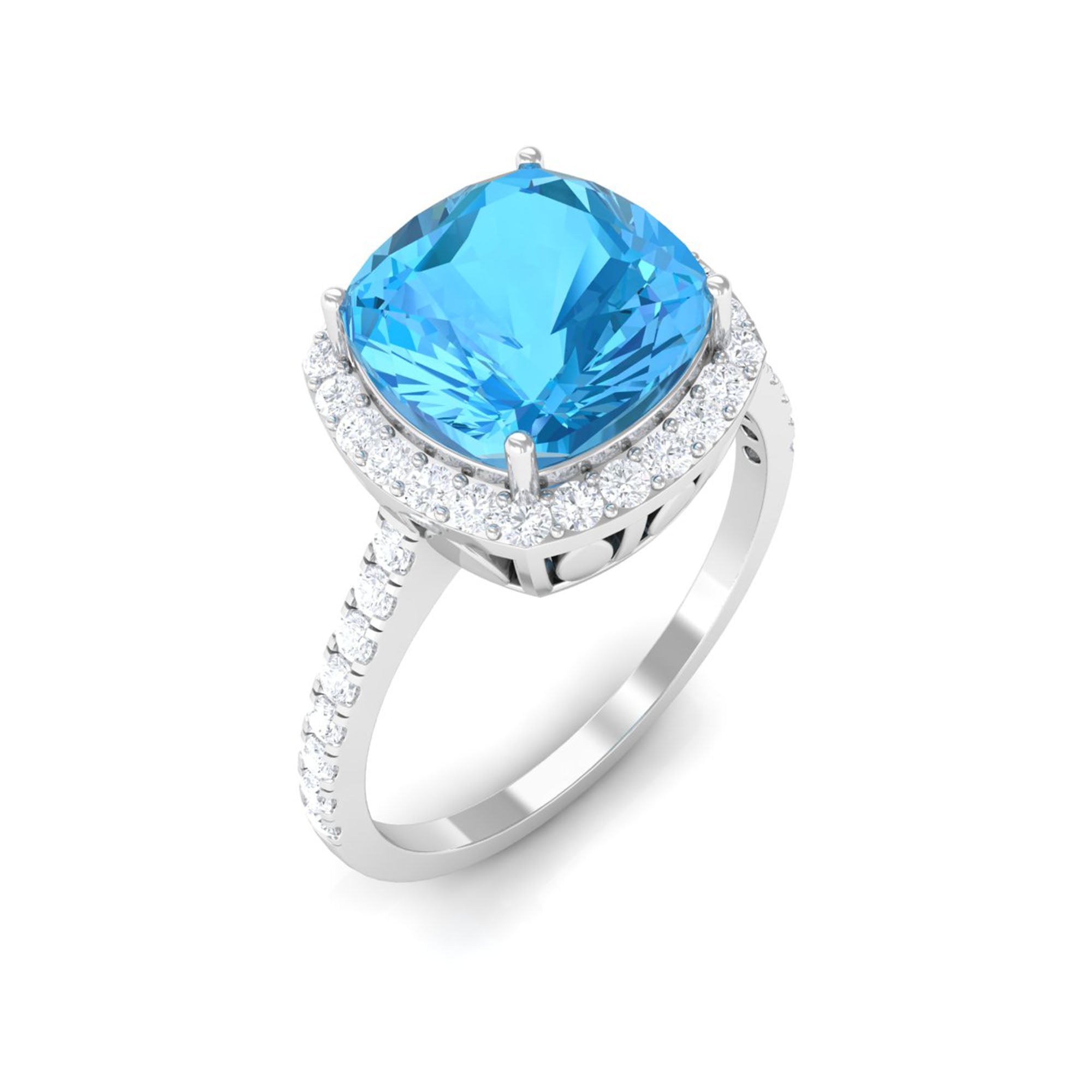 Bring your fiancée immeasurable joy with this stunning Engagement Ring, which is sure to make her dance with happiness. This ring is crafted with high-quality solid gold, and is an embodiment of beauty, featuring a stunning cushion cut Swiss blue topaz solitaire as its centerpiece, complemented by radiant Diamond accents. The ring has exquisite design is sure to leave a lasting impression, and its timeless elegance will be a symbol of your love for years to come. Give your fiancée the gift of beauty and grace with this remarkable engagement ring.
