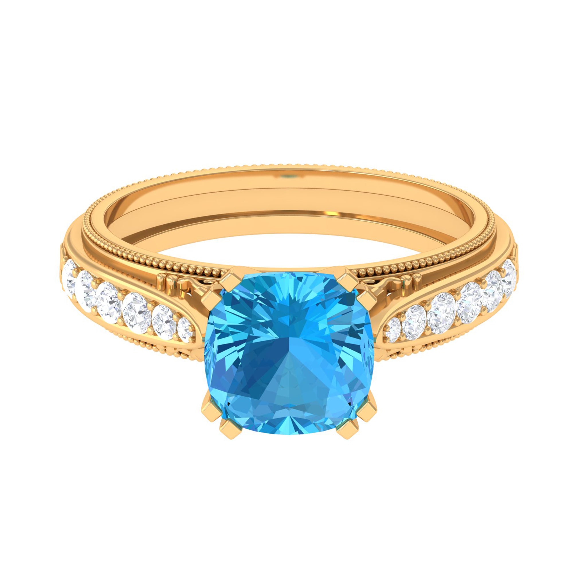 This engagement ring features an 8mm cushion-cut solitaire of Swiss blue topaz, complemented by Diamond accents and a distinctive milgrain design to enhance its overall appearance.