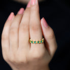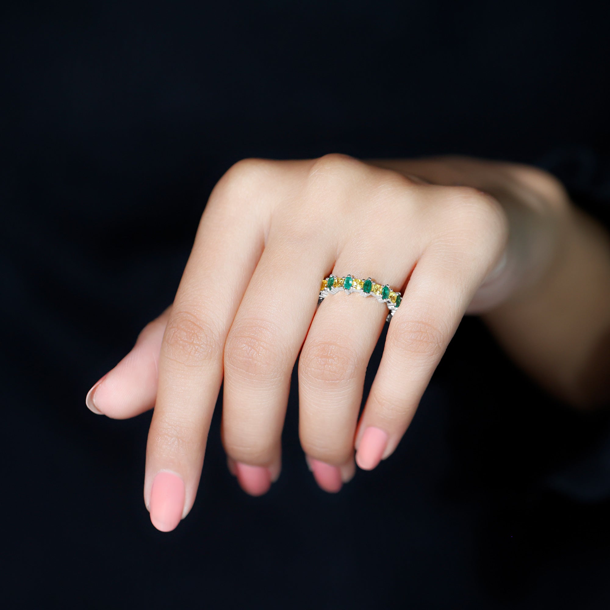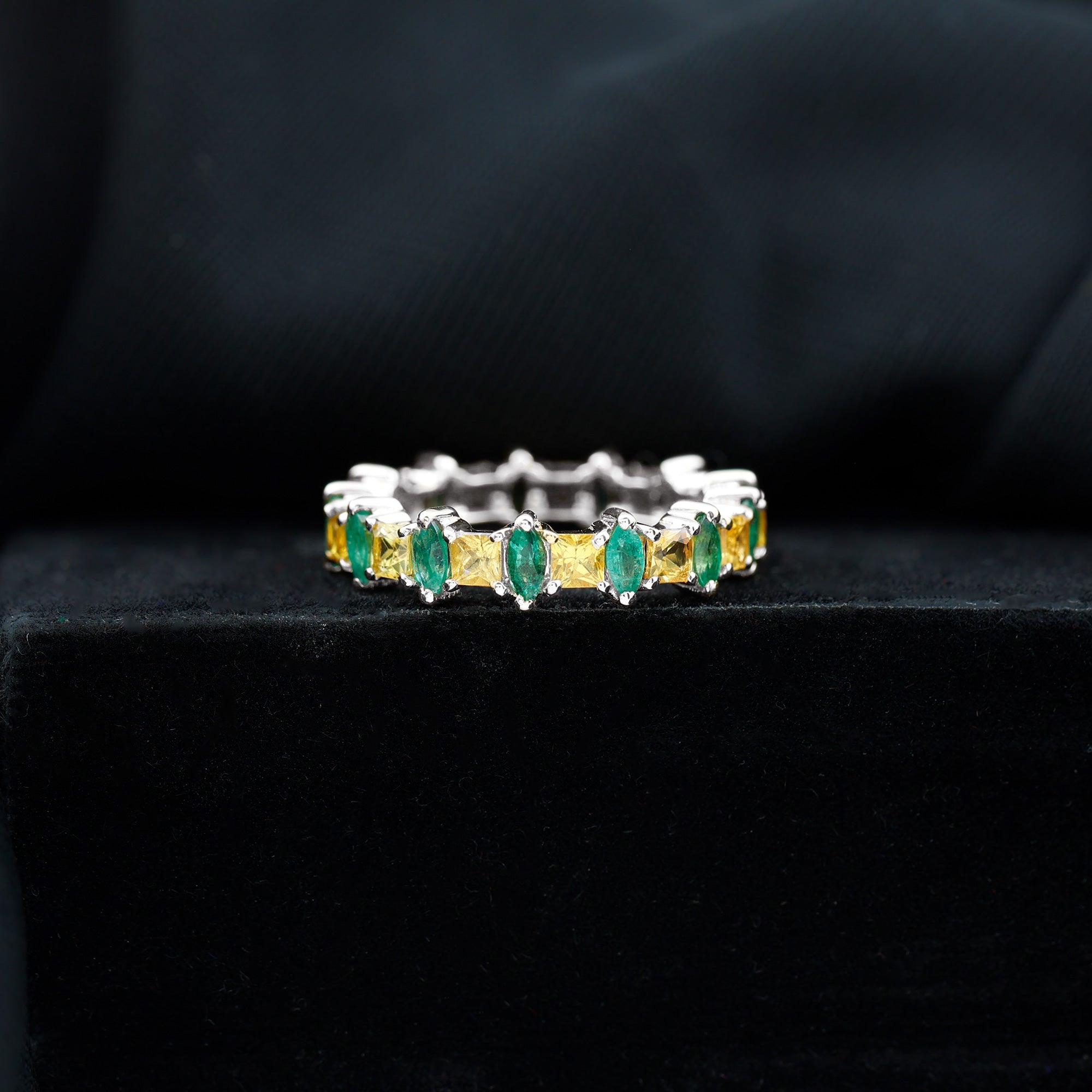 Add a splash of color and elegance to your special day with this beautiful Alternative Eternity Band. Designed to reflect harmony and style, this Wedding Band Ring captures attention with its unique mix of gemstones and shapes. It features a stunning combination of marquise cut emeralds and princess cut yellow sapphires, each held securely in prong setting. The graceful green of the emeralds blends perfectly with the bright golden tones of the yellow sapphires, creating an eye-catching pattern that flows all around the band. The alternating design gives this Stackable Eternity Ring a modern look while keeping its timeless charm. Every detail is thoughtfully crafted to bring out the beauty of each gemstone, making this piece a perfect choice for those who appreciate color, creativity, and meaning in their jewelry. The continuous line of stones symbolizes everlasting love and connection, making it an ideal piece to mark a special occasion or milestone. Whether you wear it alone for a refined statement or pair it with other rings for a layered look, this Yellow Sapphire and Emerald Eternity Band adds sophistication to any outfit.