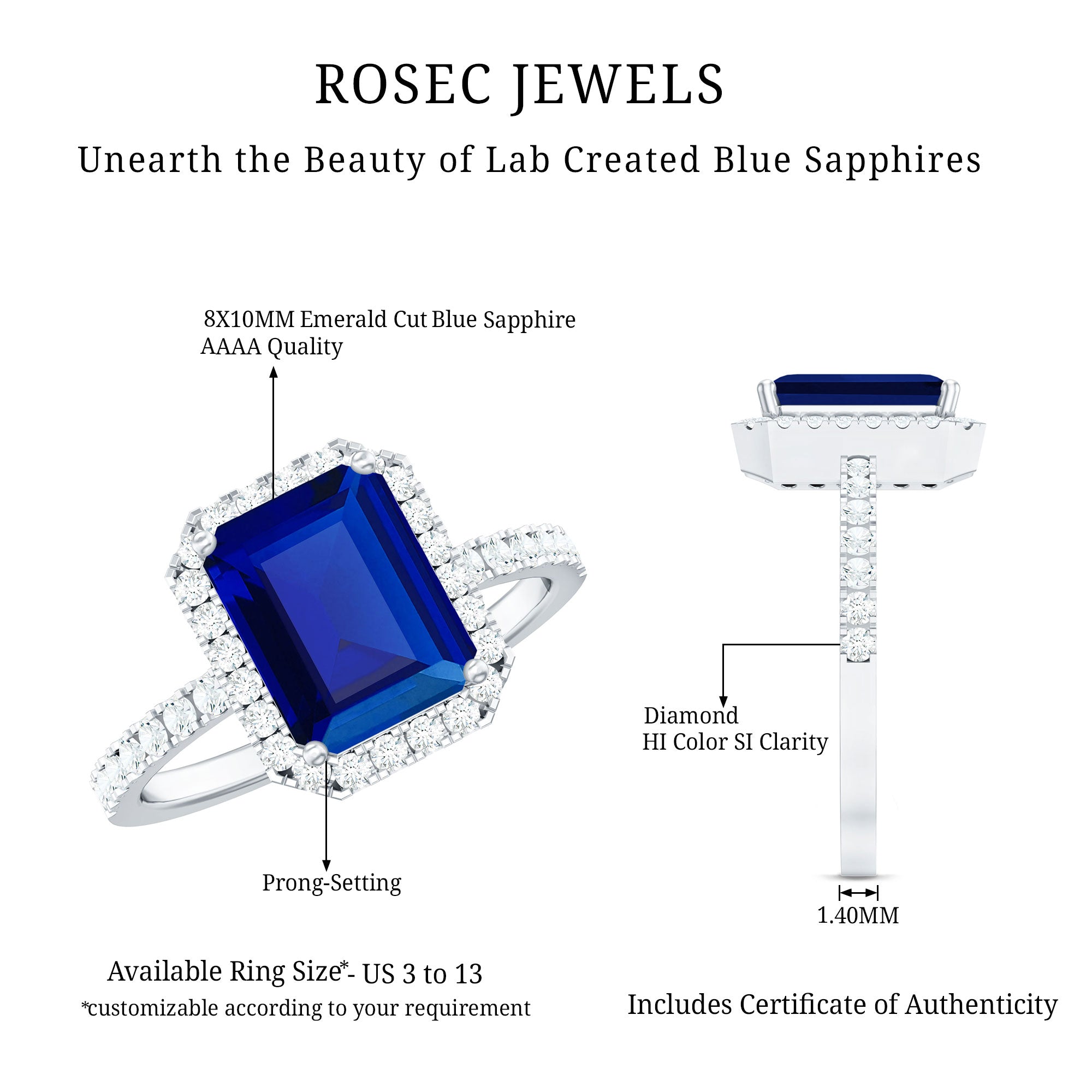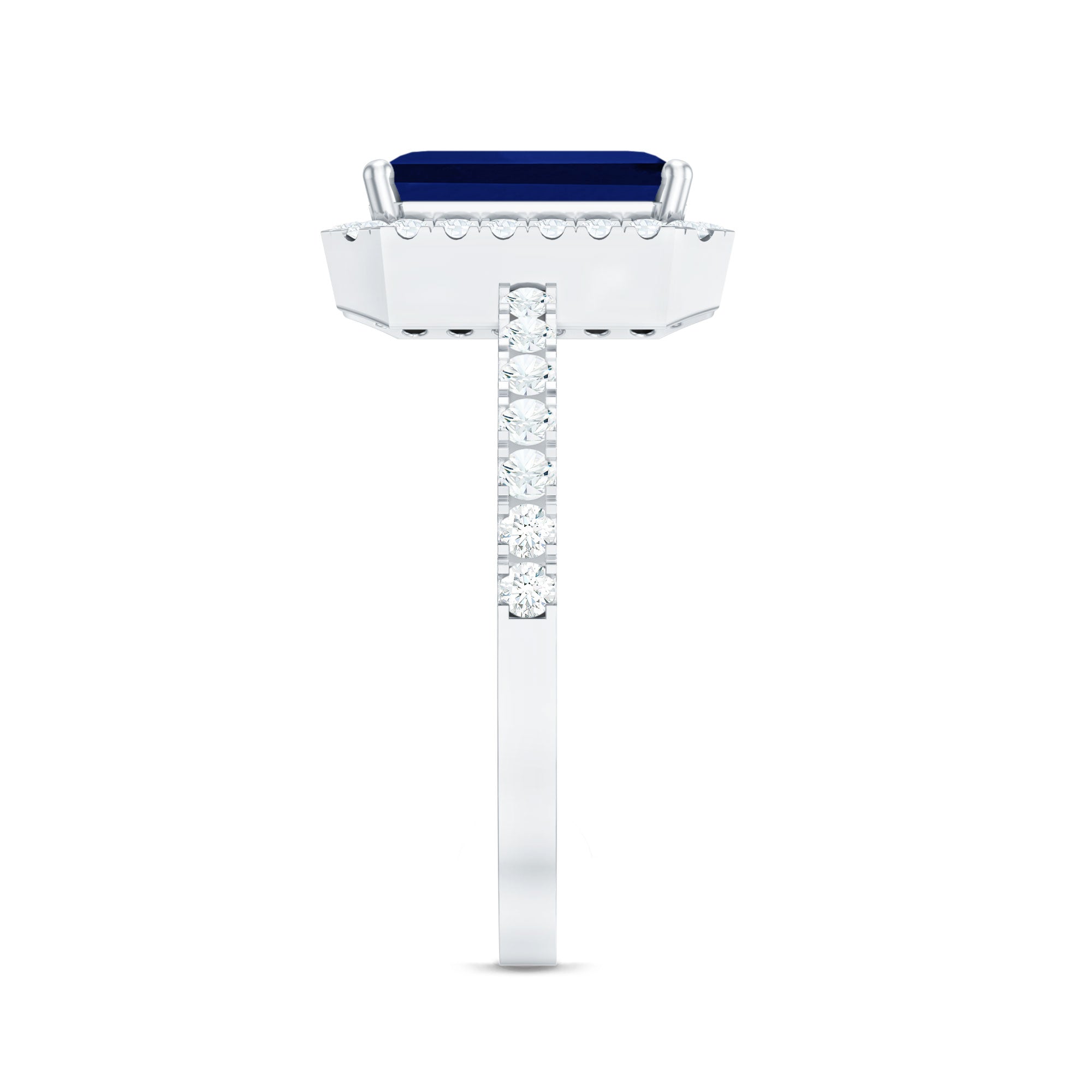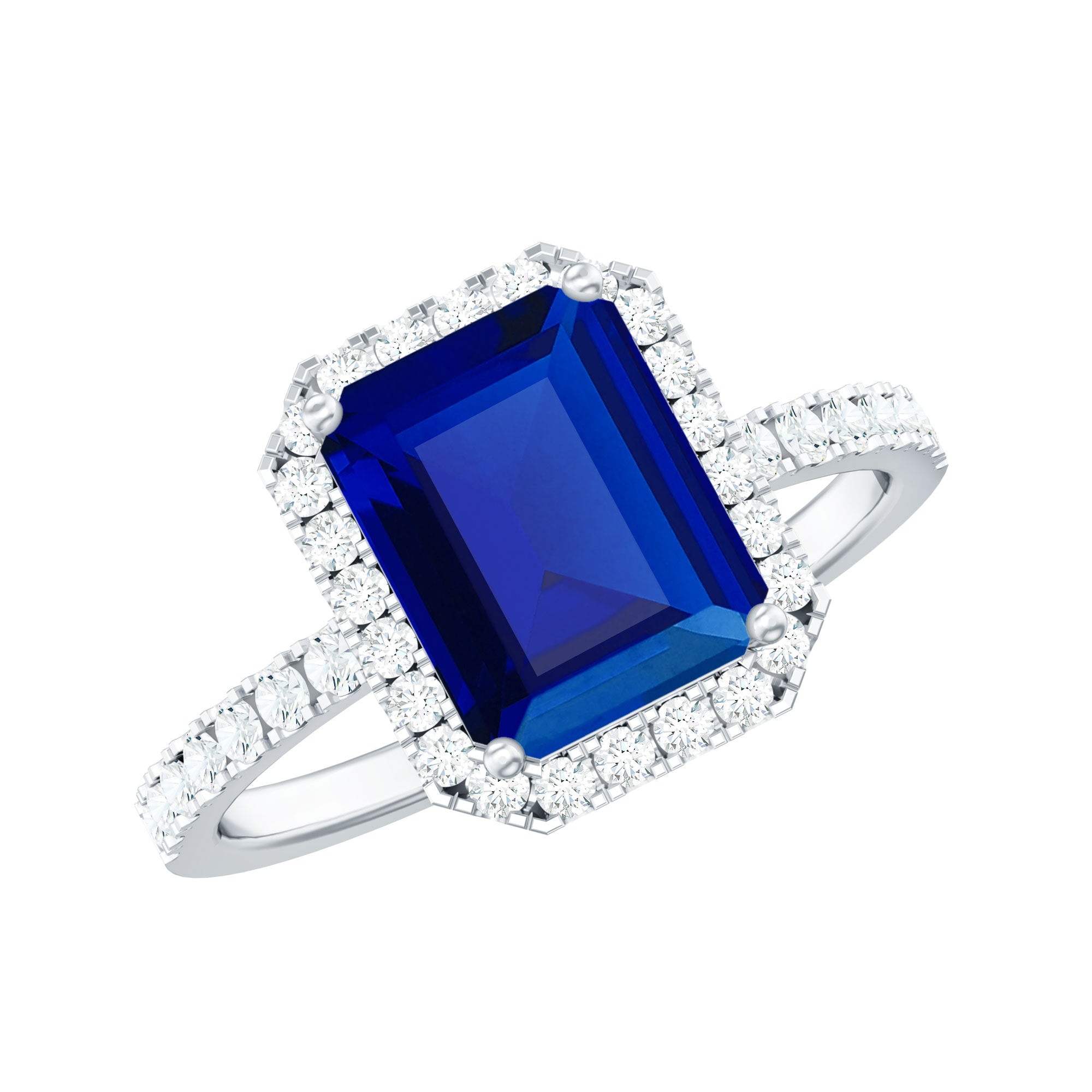 3 CT Emerald Cut Lab Grown Blue Sapphire Halo Engagement Ring