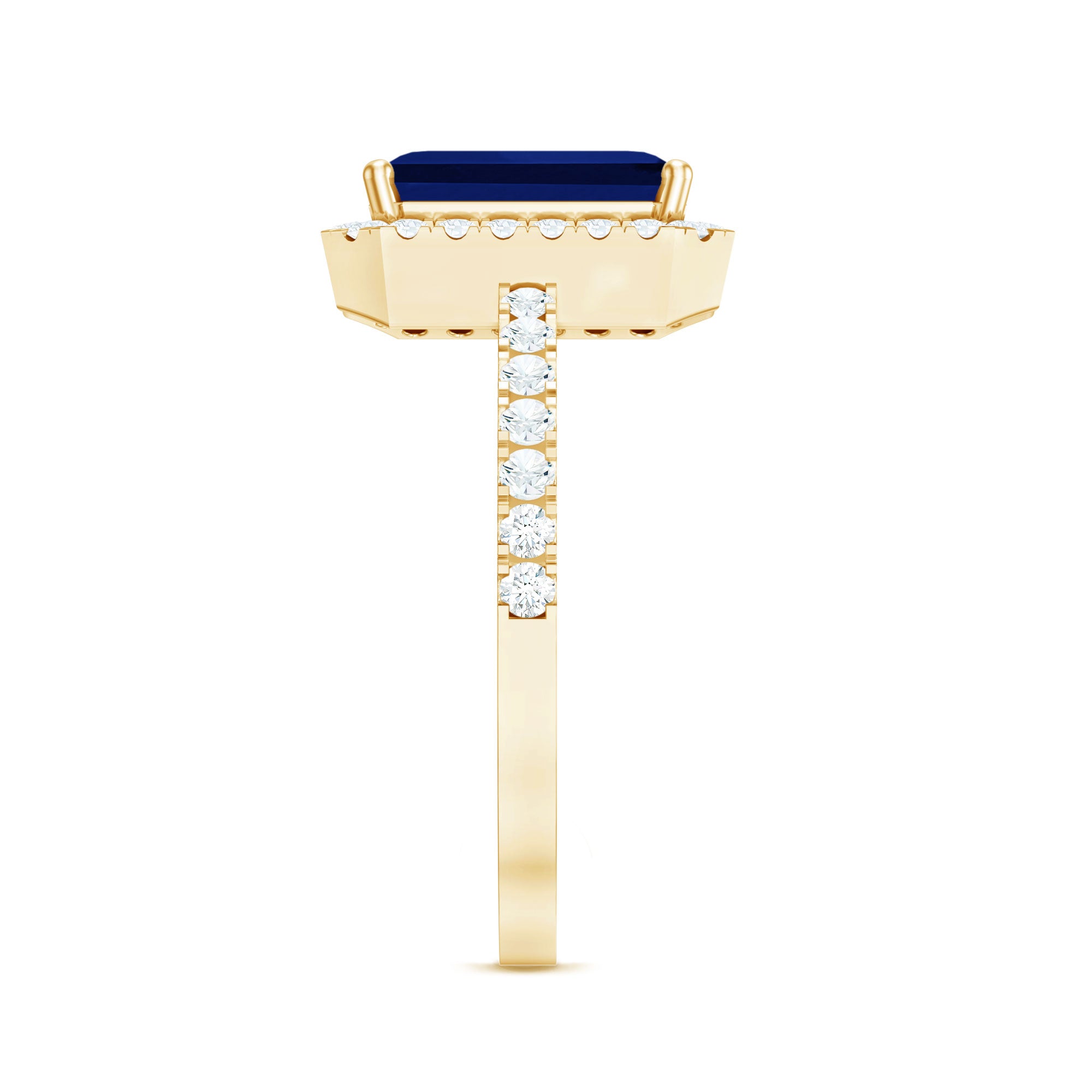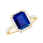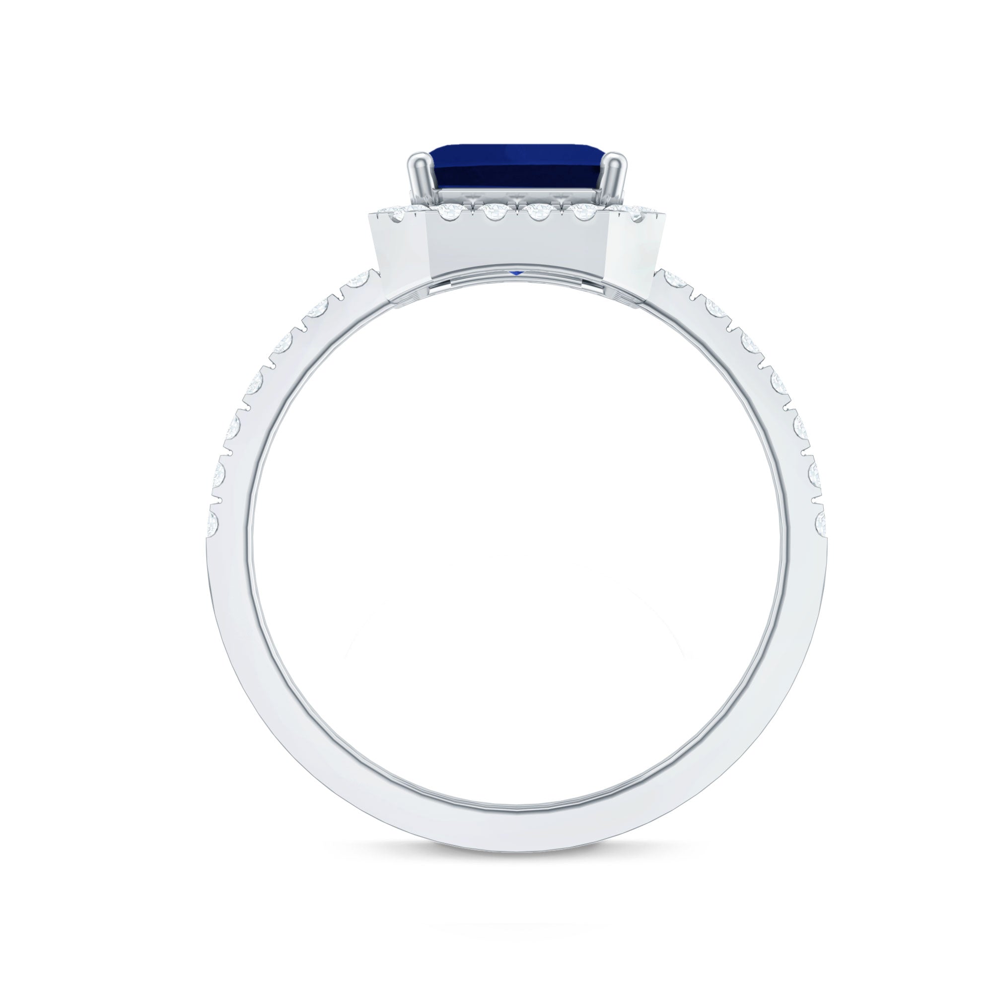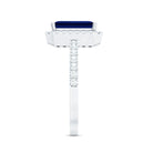 Experience the allure of a solo statement piece with our Halo Engagement Ring. The captivating Emerald Cut Lab Created Blue Sapphire takes center stage in a graceful prong setting, complemented by a mesmerizing Diamond halo and side stones, making it the perfect gemstone choice for your special day. Embrace the modern twist of this Created Blue Sapphire Solitaire Engagement Ring, where elegance and uniqueness unite in perfect harmony.