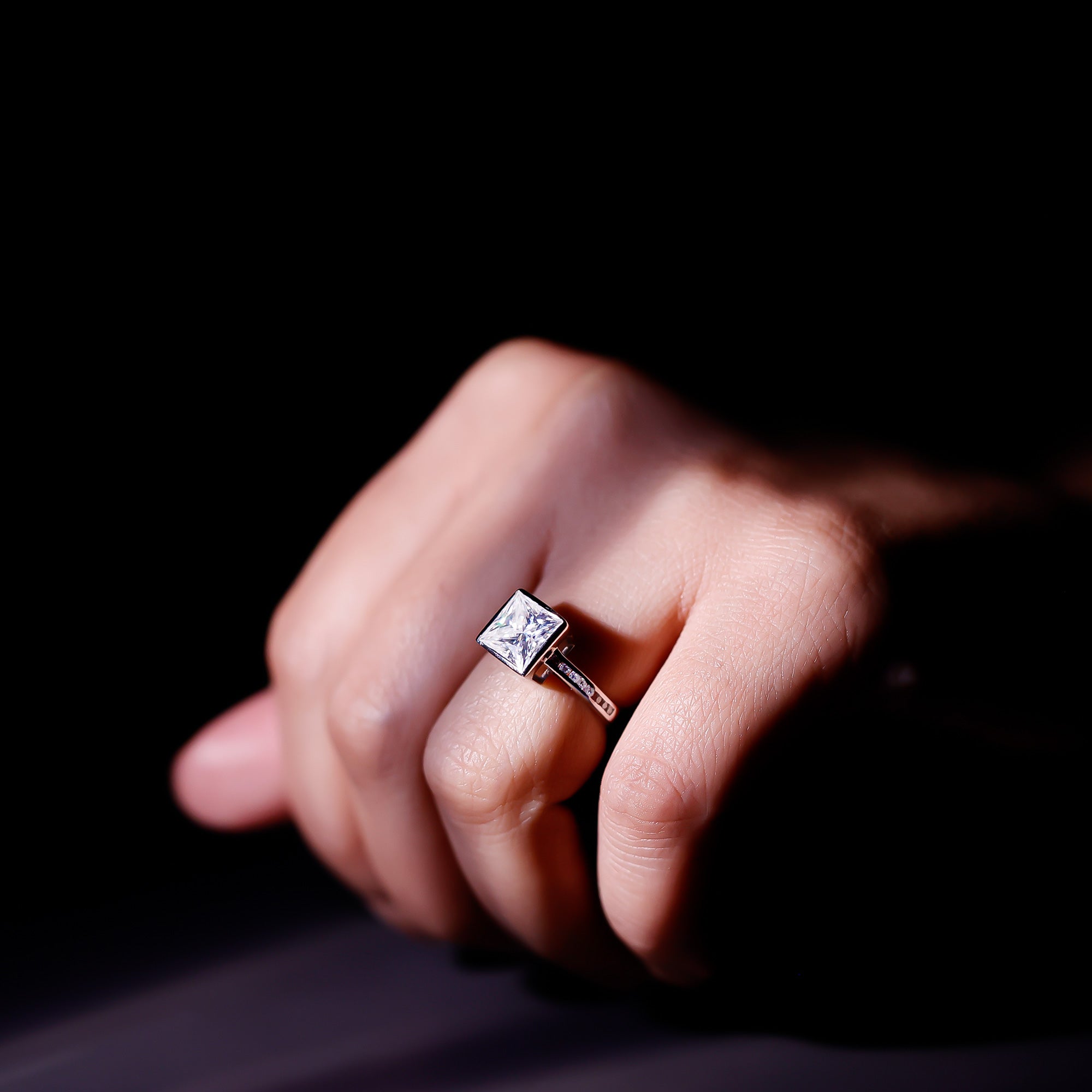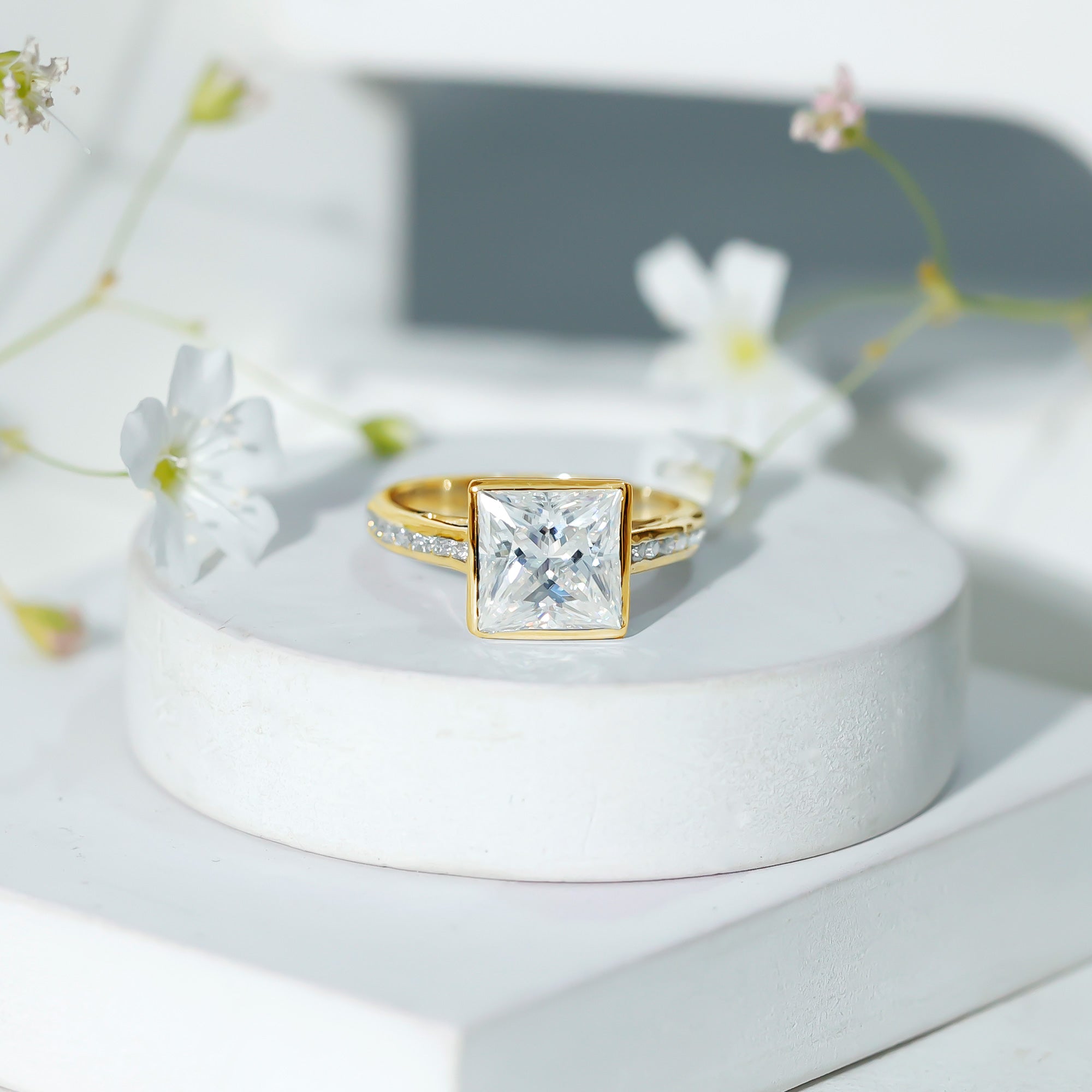 If she wants something to say Look at me! I am here. then a 3-carat engagement ring is the perfect fit for the statement chic but classic woman. With a gorgeous 8x8 mm princess cut centre stone of Moissanite with a brilliance and fire immeasurable to a natural diamond. Set in a modern bezel, it balances the line between refined and relaxed, perfect for everyday wear. Crafted with a certified Moissanite D-VS1 graded for quality, meaning its colourless and very clean to the eye. This ring will make each moment memorable, whether that be proposing, re-exchanging vows, or just wanting to celebrate your love.So why moissanite (in case you havent heard): moissanite is diamond-like darkness at about 1/10-th the price and (for the most part) a much better moral choice than a traditional diamond. These Moissanite rings for women are an excellent option when you desire an outstanding ring without sacrificing either beauty or quality. This one brings a modern feel with timeless meaning, whether youre loving Moissanite engagement rings or the structure of a bezel engagement ring. This is one to save in the case that you are looking for unique Moissanite diamond engagement rings. This engagement ring with a princess-cut is not simply an ornament, it is a piece of love, designed to sparkle along with you every day.