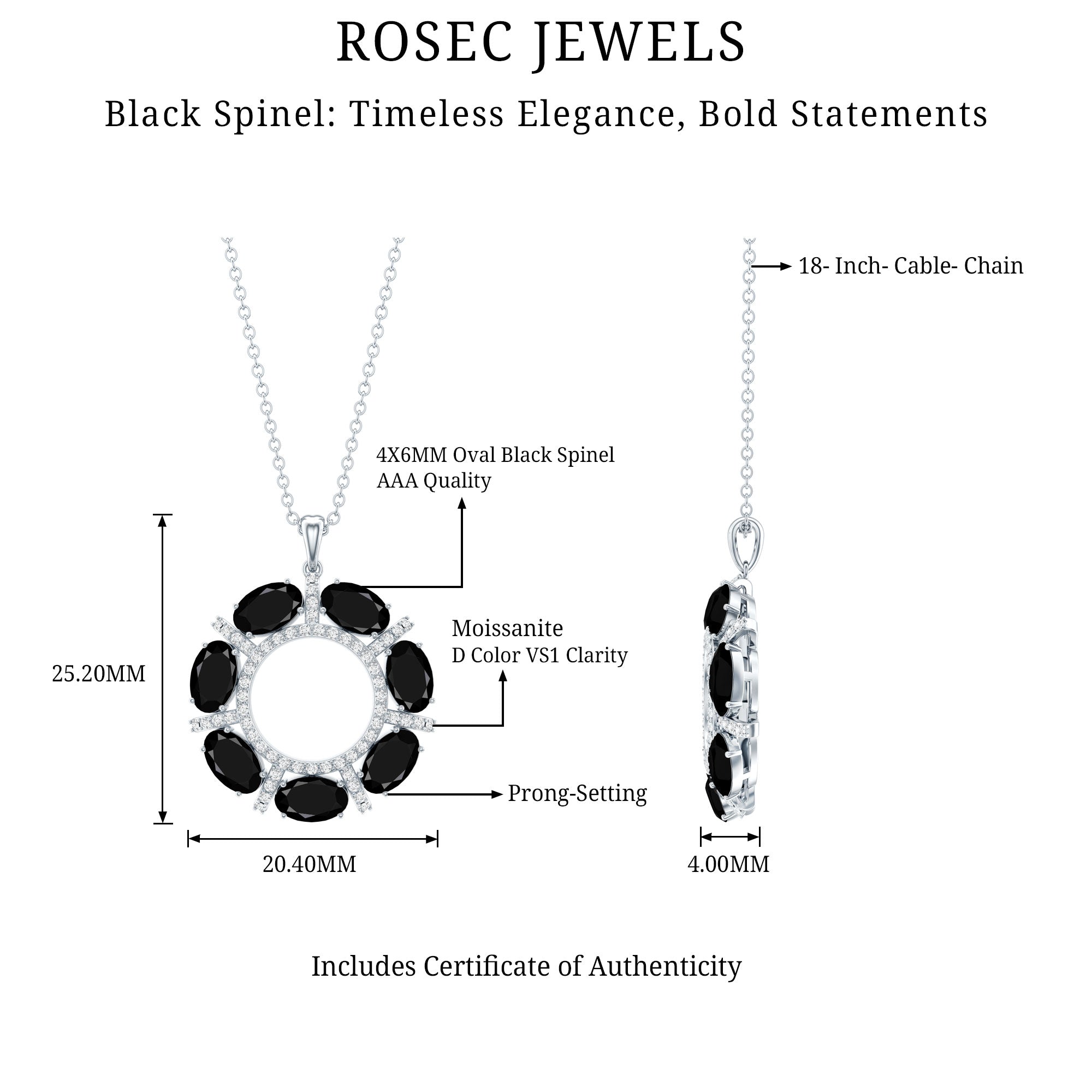 Black Spinel - Brilliant Cut Black Spinel Gemstone exhibits AAA Quality and possess vibrant color. Semi-Precious stone summons calmness, balance and adaptability. It is Natural and Certified, helps in balancing yin and yang and bring determination to the wearer. It is moderately Durable and it has captivating luster which keeps the desirability of this stone intact. Moissanite - D-VS1 Quality exhibited by Brilliant Cut Moissanite give justice to its incredible value. Moissanite summons beauty, attractiveness and unbreakable love. It is Certified and helps in bringing success and luxury to the wearer. Its Durability and Luster is enhanced by Lab Created Treatment, to further make it a captivating and desirable gem.
