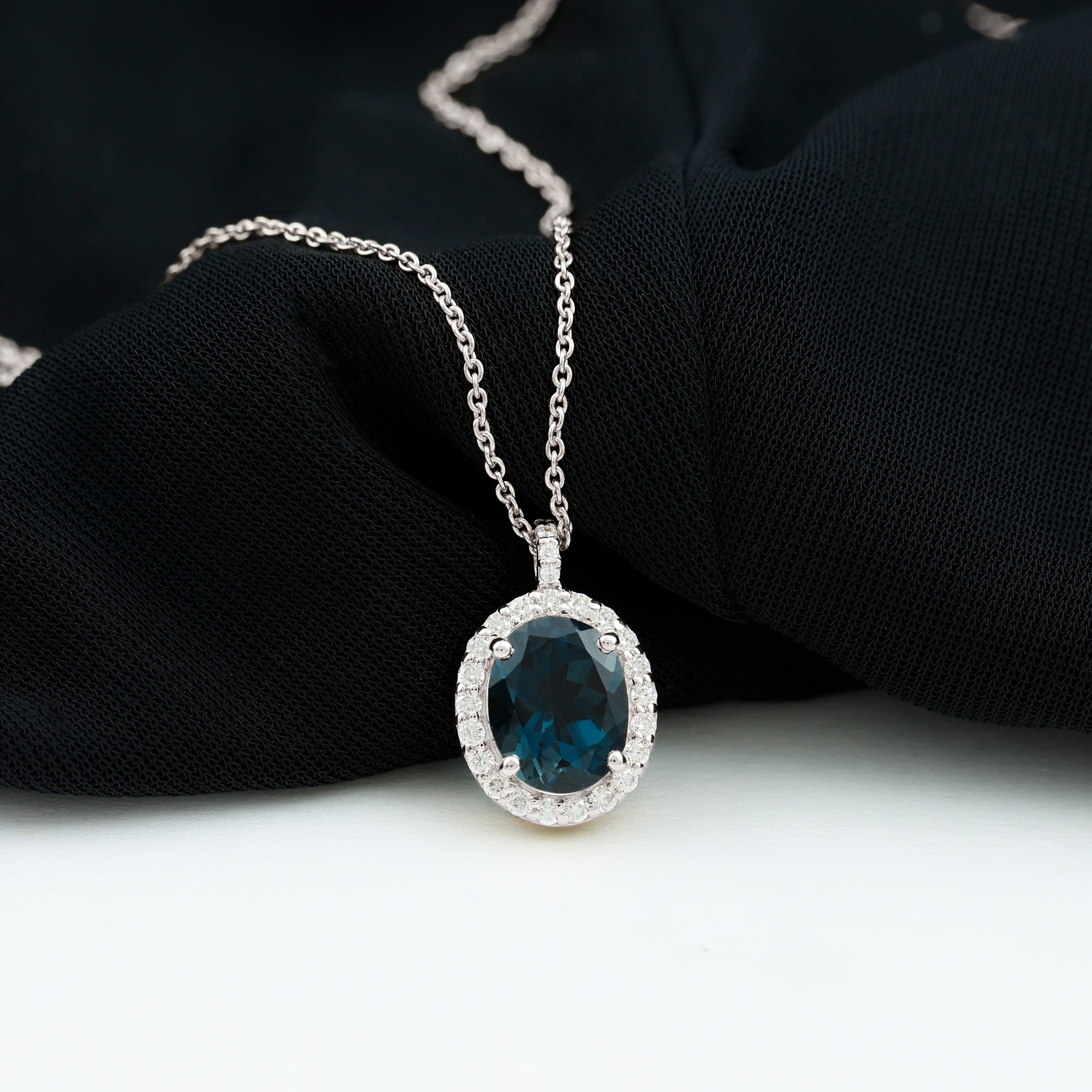 Enhance your neck with the exquisite elegance of the London Blue Topaz Pendant. Featuring an 8X10 MM Oval Cut London Blue Topaz in a secure Prong Setting, adorned with sparkling Diamond, this Cocktail Pendant effortlessly complements any ensemble. While this pendant symbolizes friendship, it also serves as a remarkable gift for those born in December.