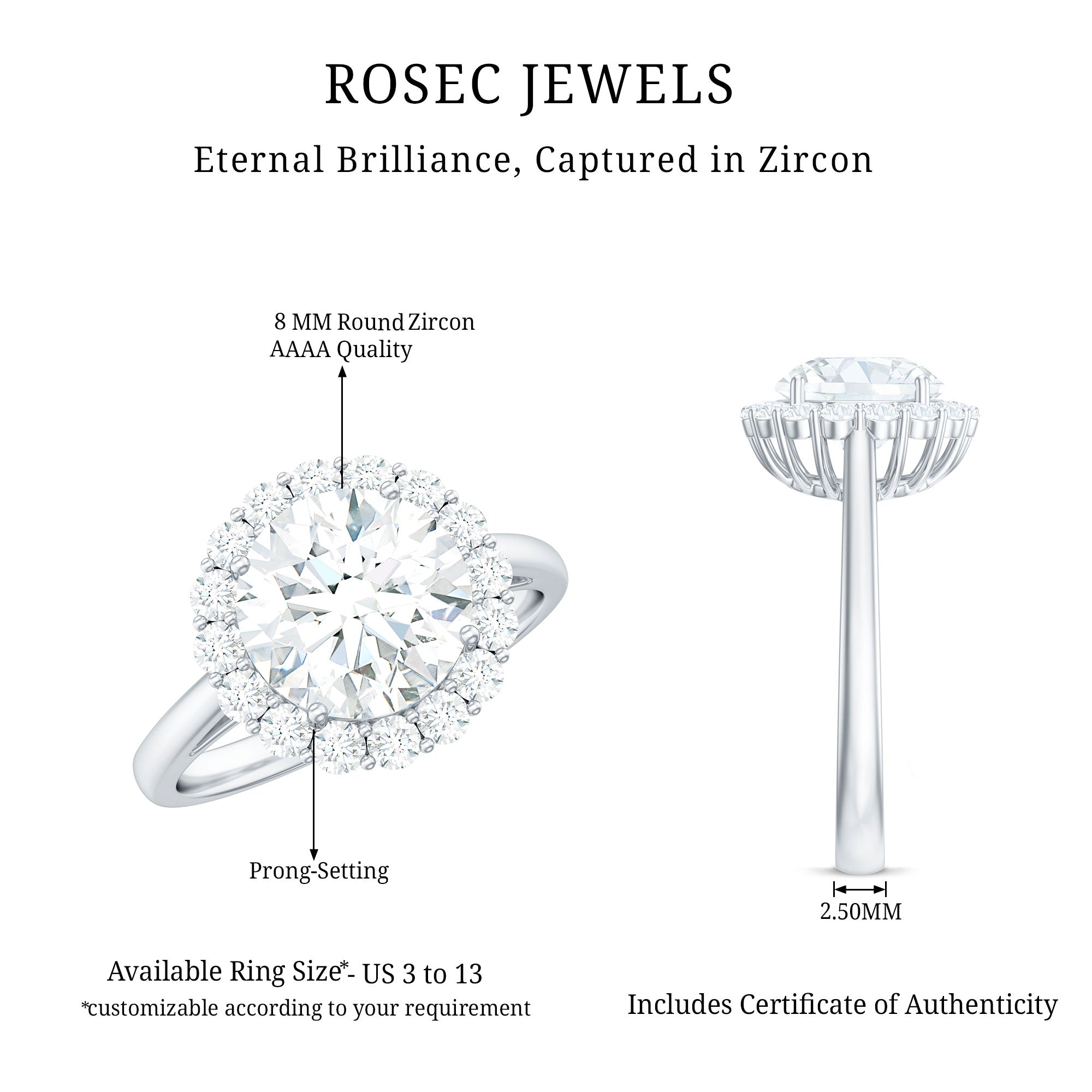 This cubic zirconia ring is a stunning and elegant piece of jewelry. The centerpiece stone, a brilliant zircon stone, is surrounded by a halo of smaller zircon stones, adding extra sparkle and brilliance to the piece. Perfect for those who appreciate classic style and modern elegance, this ring is a great choice for any occasion and will be a cherished addition to any jewelry collection.