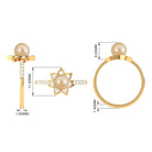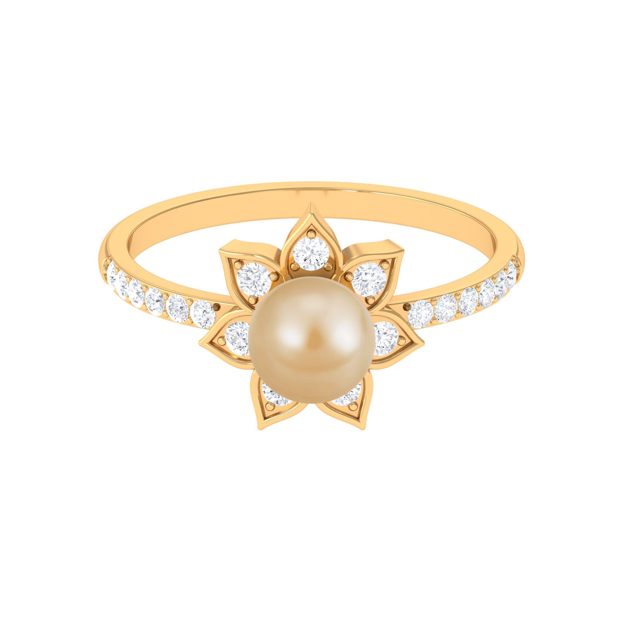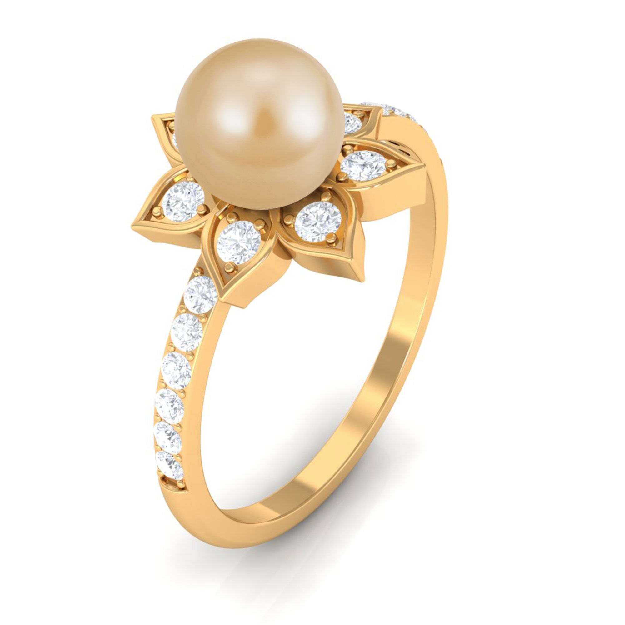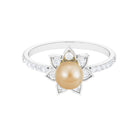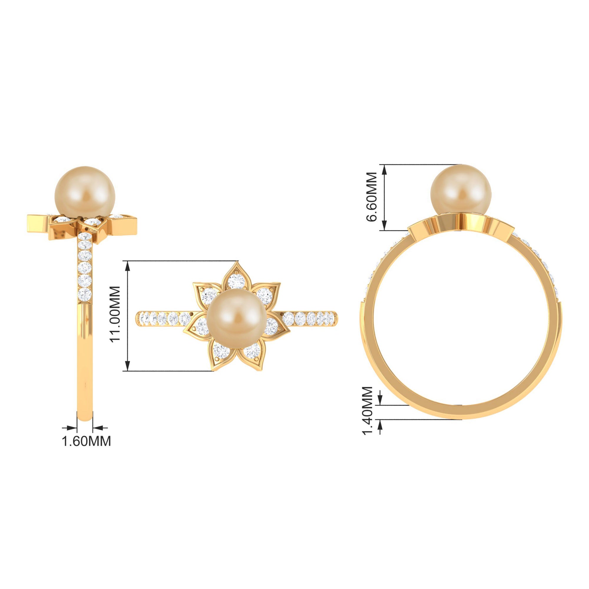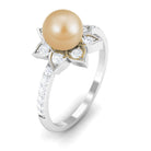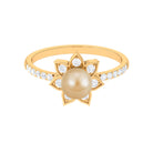 This south sea pearl solitaire ring is an absolute stunner, sure to catch the eye with its golden color and clear shine. The engagement ring features a round south sea pearl set in the center, surrounded by Diamond stones on both the shank and around the pearl itself. Crafted from solid gold in a flower motif, this flower ring has a classic appeal that is simply irresistible. With its floral design and elegant detailing, this ring is a must-have for any jewelry collection.