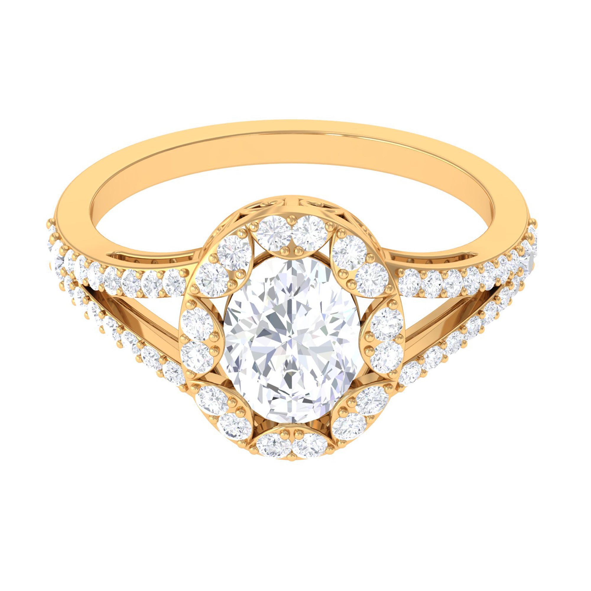 Give Her That Fairytale Ending. Forever gleaming and radiant, adorn her hand with our Cubic Zirconia Engagement Ring that is only fit for a true princess. Featuring brilliant oval cut zircon at the center with designer halo in split shank, handcrafted in Gold this Simulated Diamond Ring is absolutely stunning.