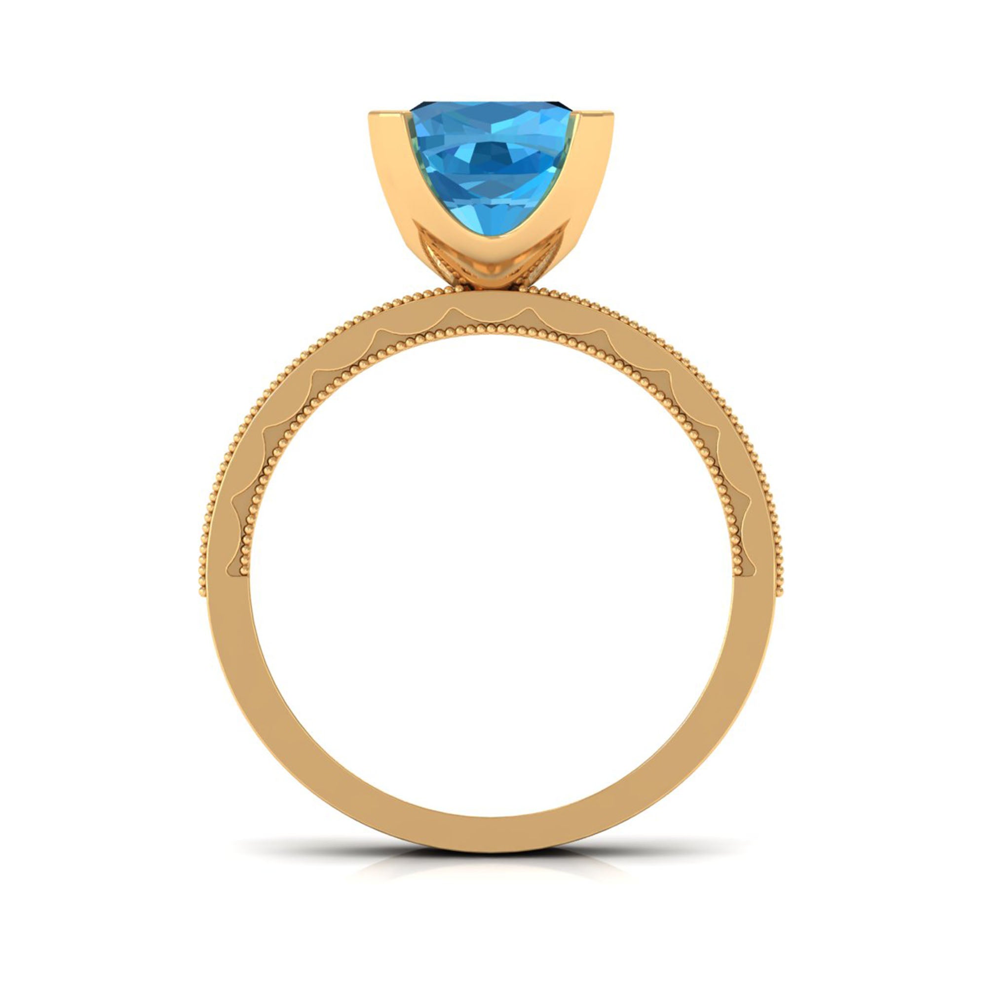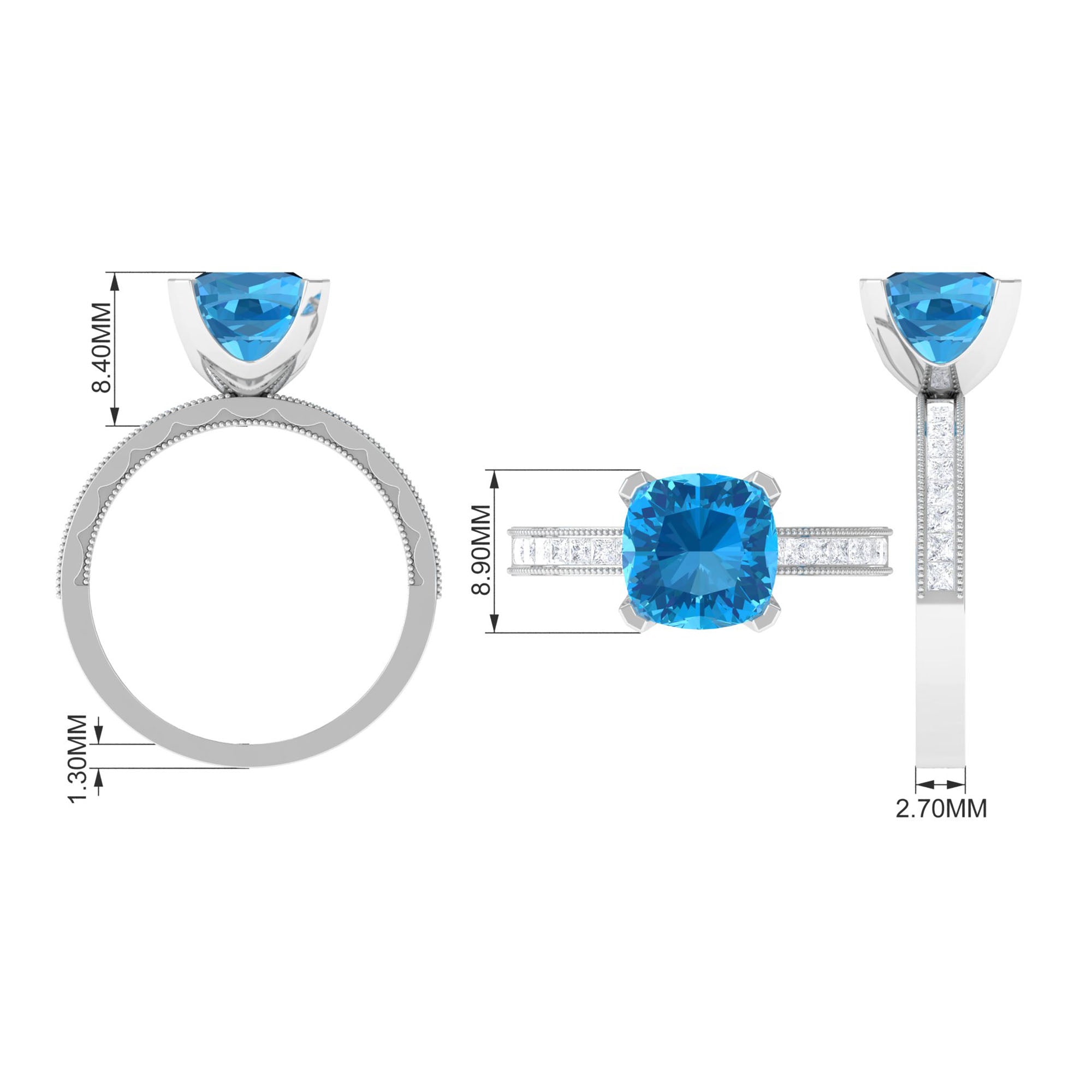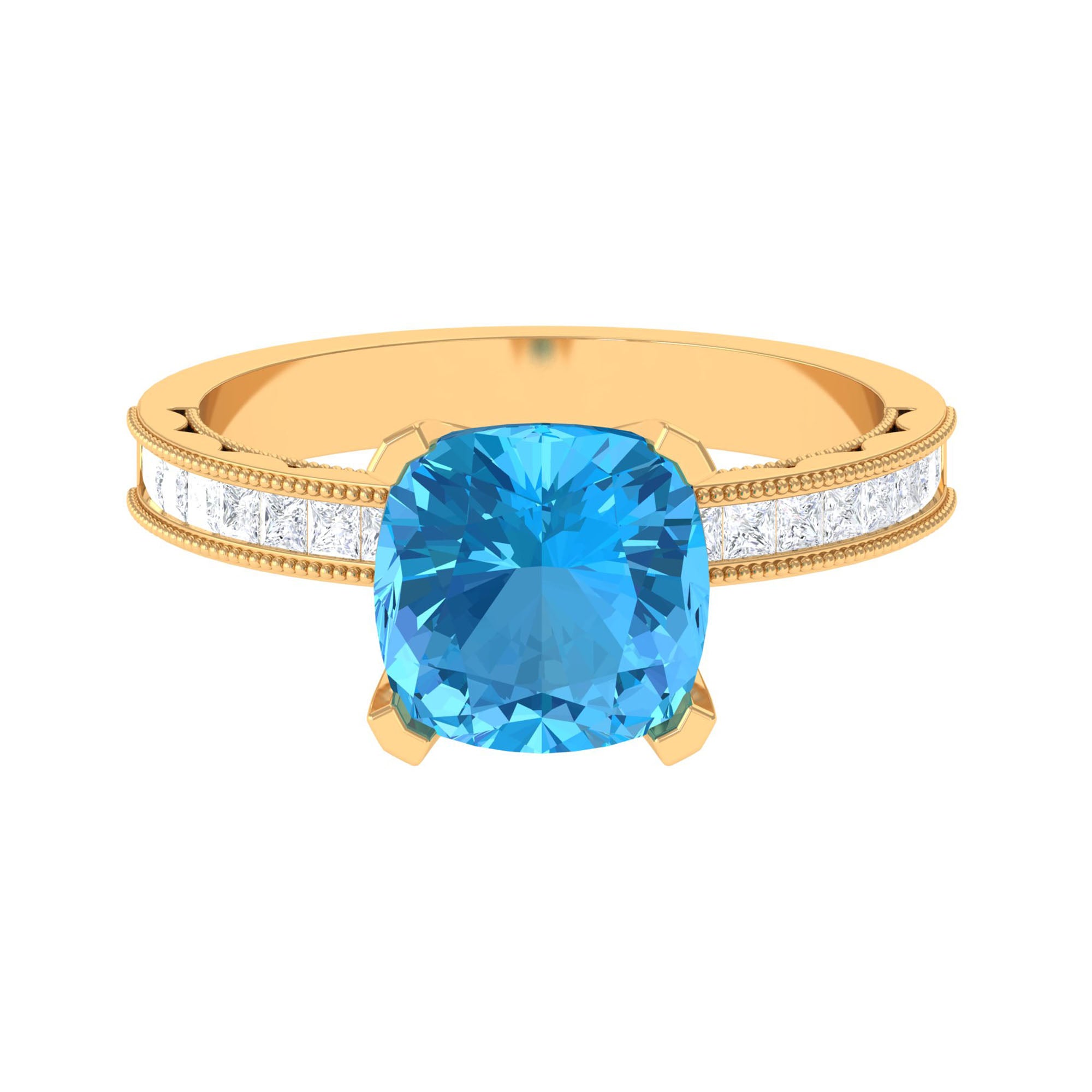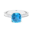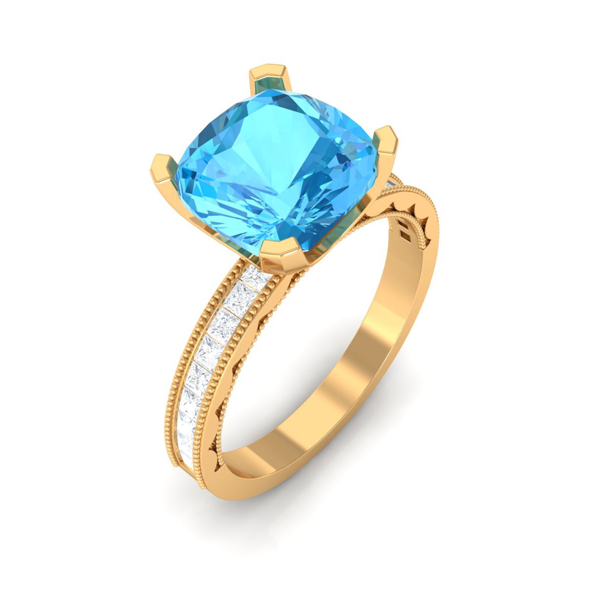 Steal all the attention with our Vintage Engagement Ring featuring 8.5 MM Cushion Cut Swiss Blue Topaz and Princess Cut Moissanite adorned in Solid Gold.