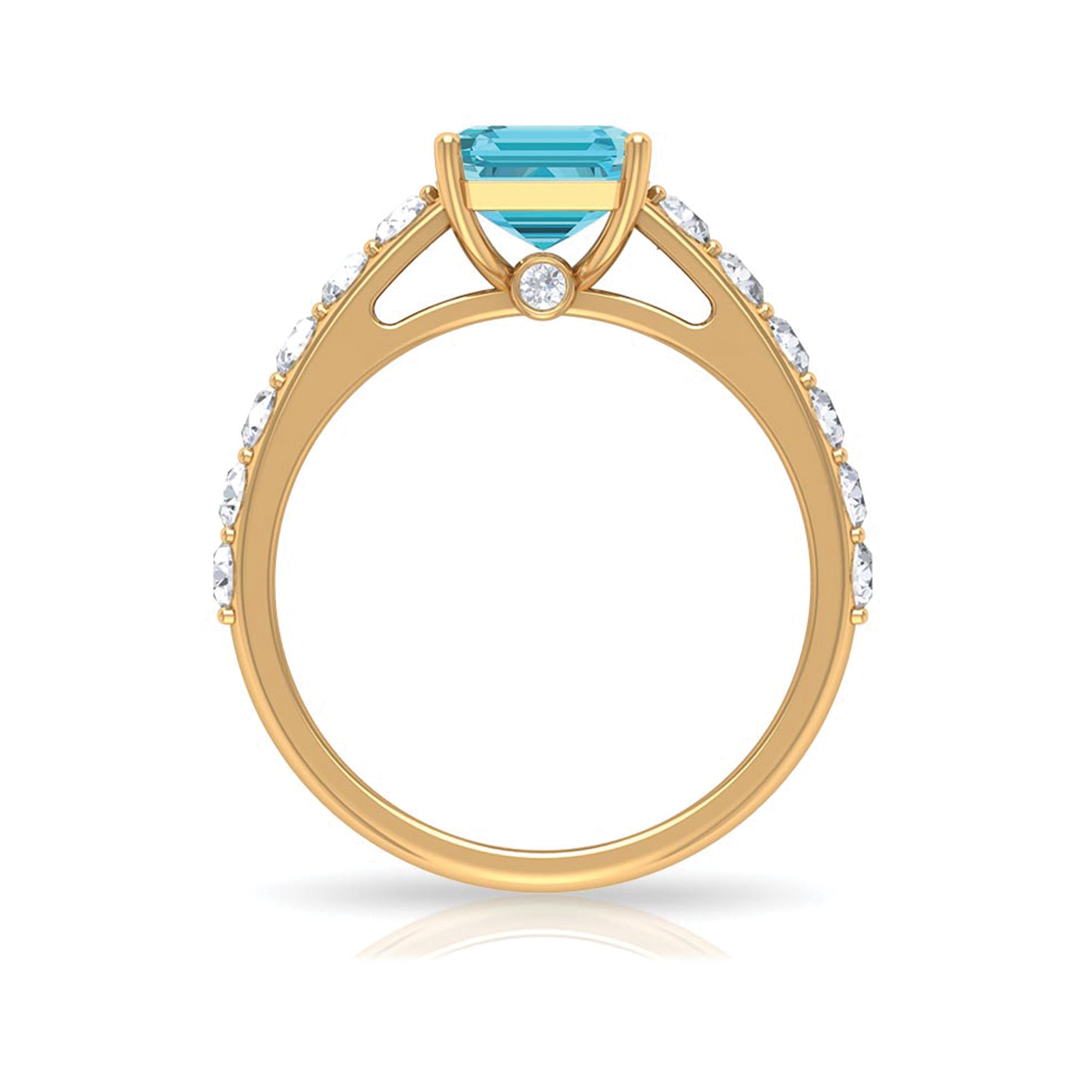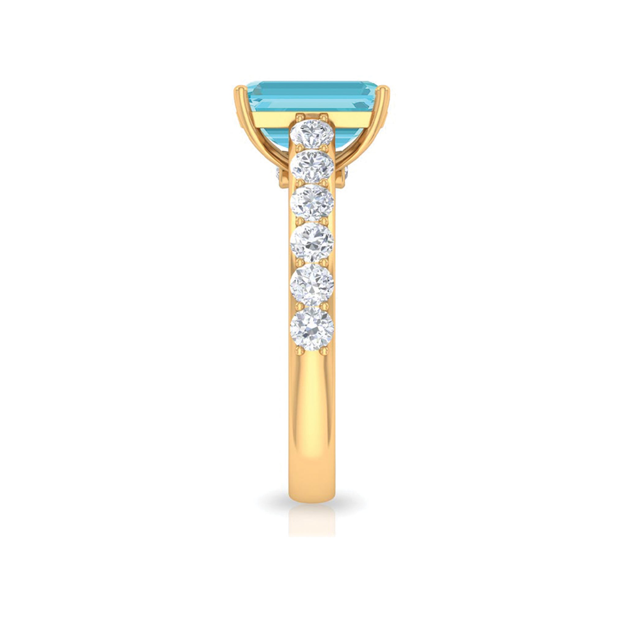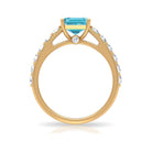 It is an Engagement Ring for Women adorned in Solid Gold and consists of an Octagon Cut Swiss Blue Topaz as Solitaire embellished in Prong Setting with Round Brilliant Moissanite as Side Stones embellished in Pave Setting, especially for you.