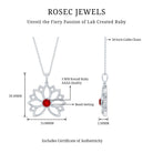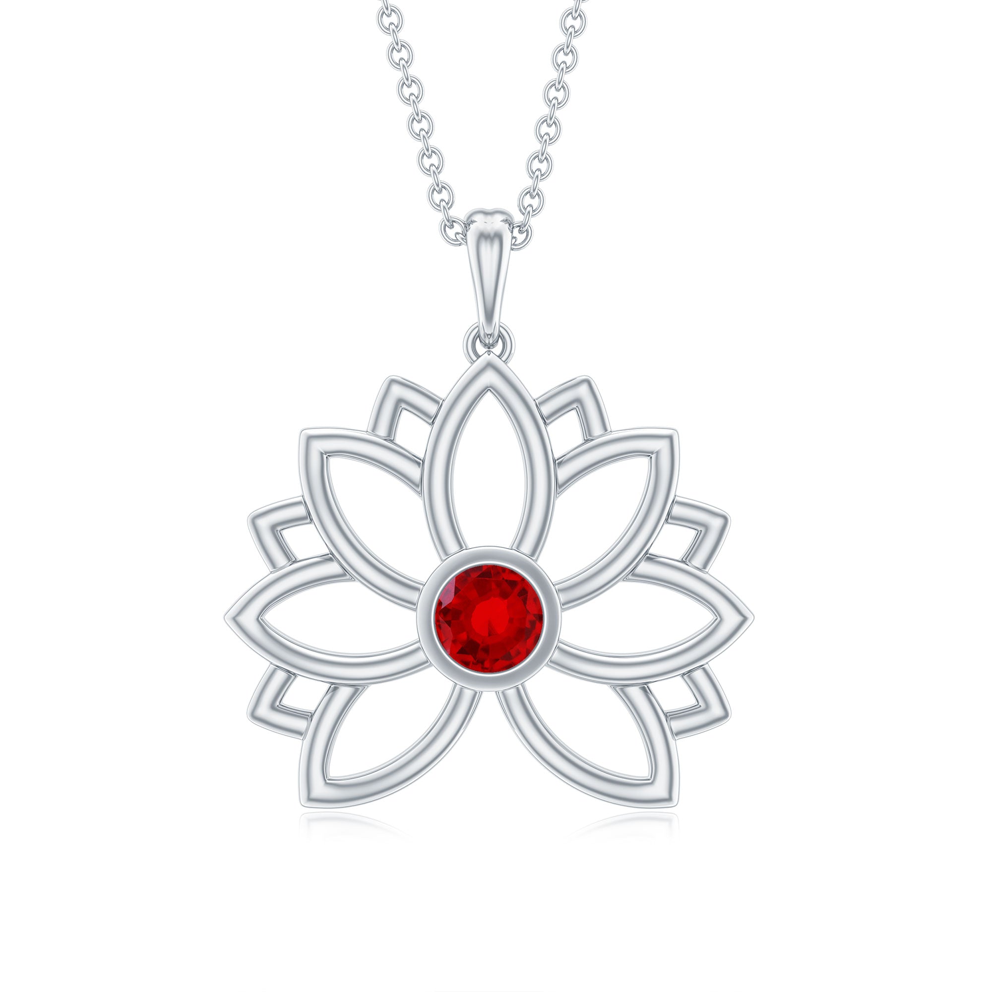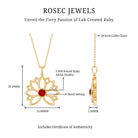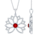 Lab Created Ruby Lotus Pendant has lovely delicate design make a perfect accessory for vintage lover. Stunning Round Solitaire Lab Created Ruby stone is encased in bezel setting enhance the beauty of Floral Charm Necklace. 14K Gold is used to craft this enchanting piece. Stack it or wear alone for statement look.