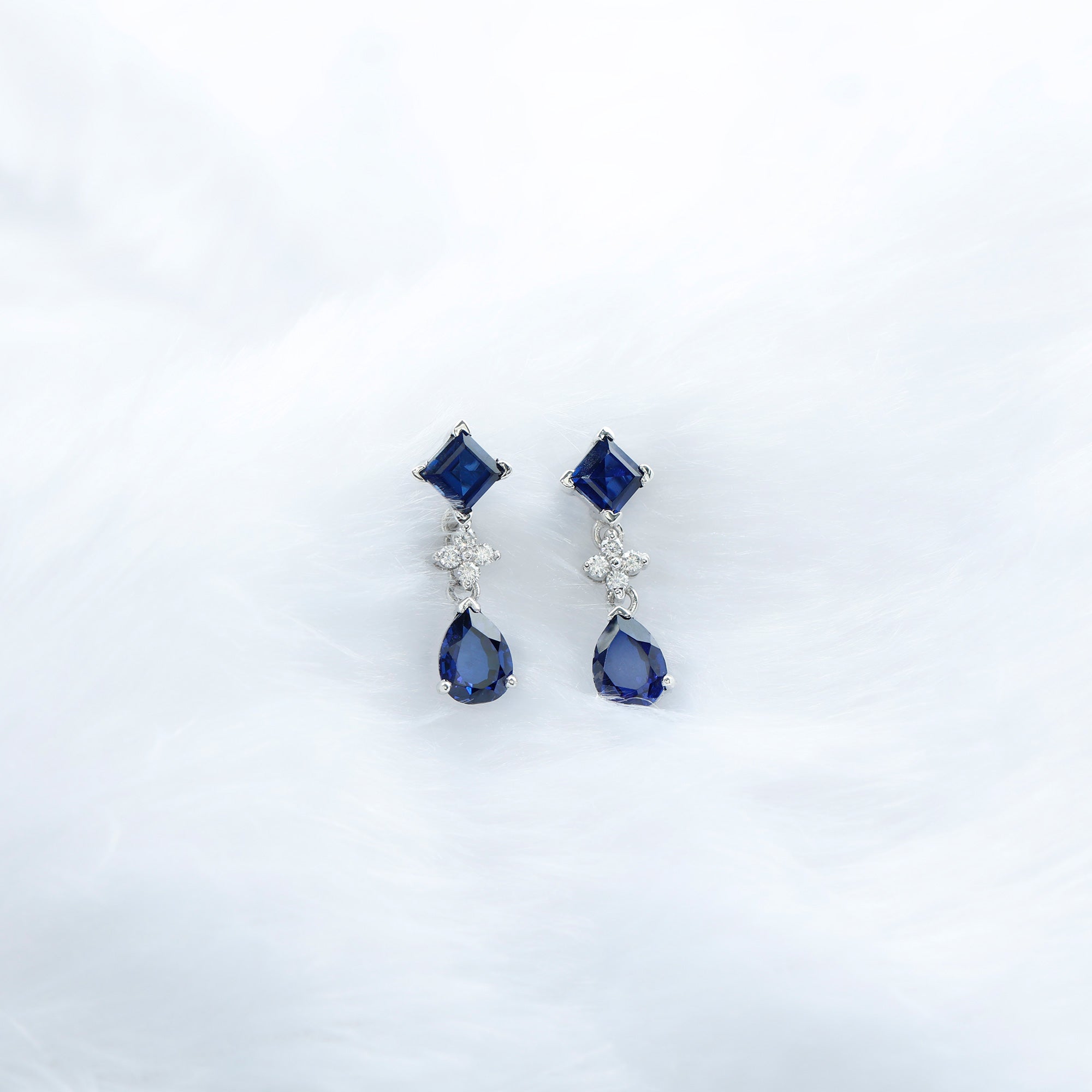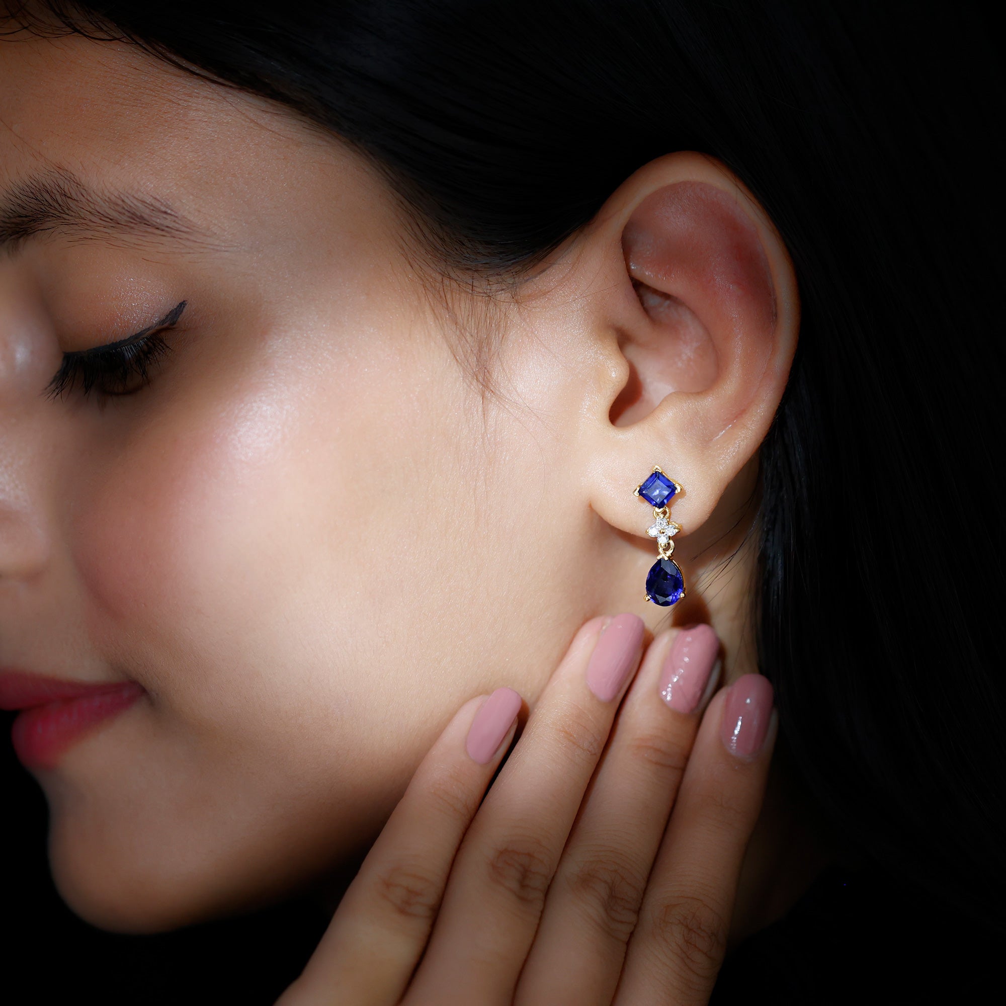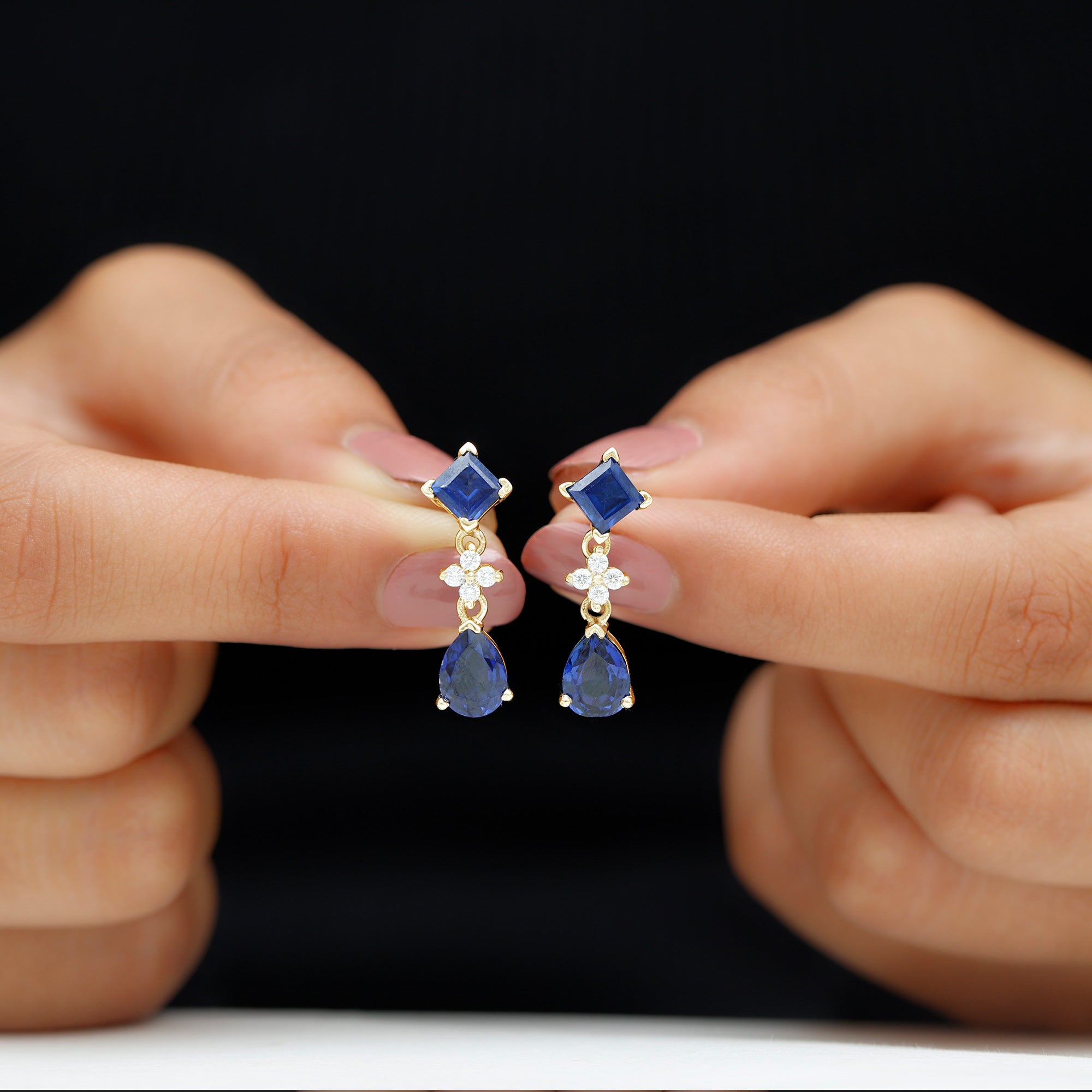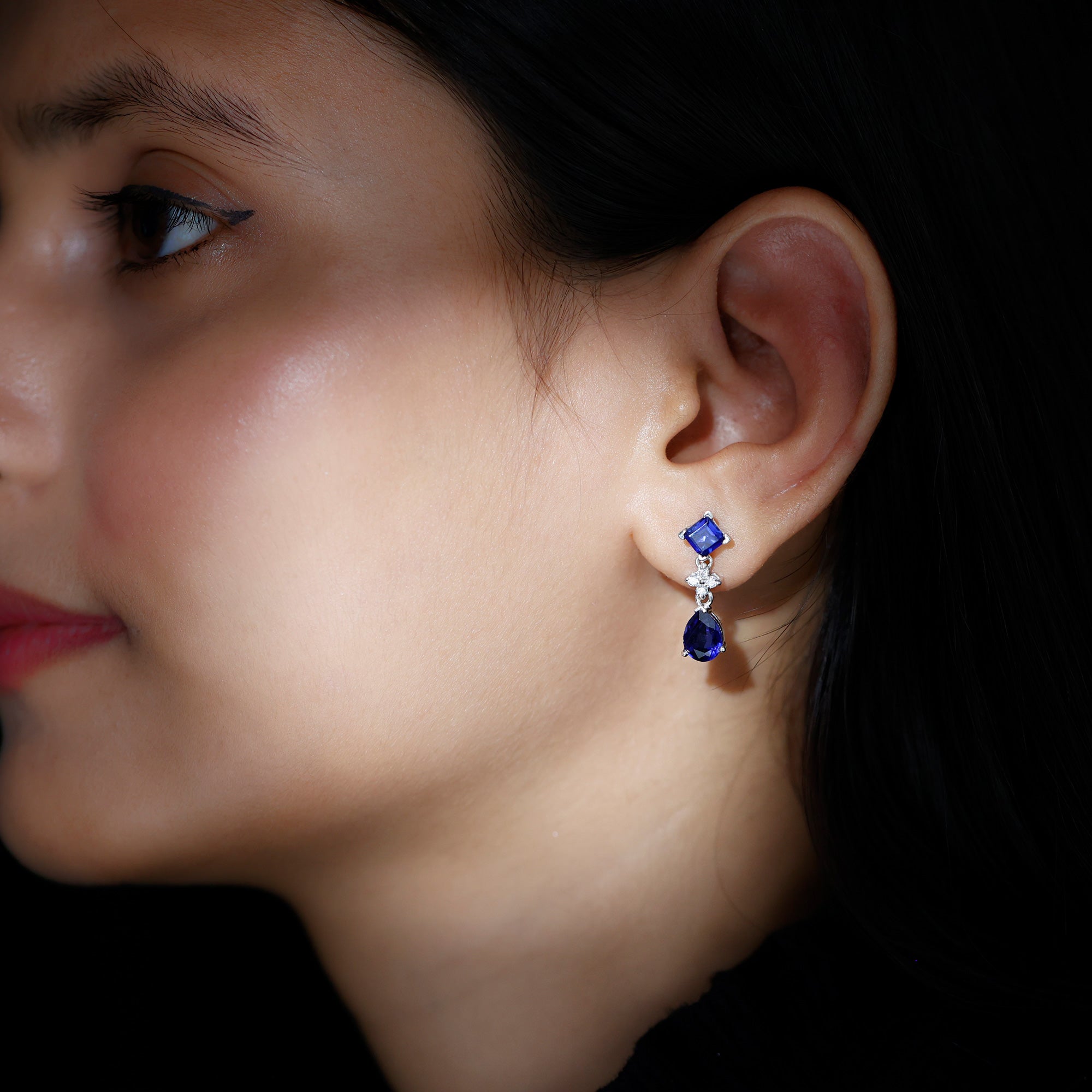 These earrings has that wow factor that youve been looking for. These earrings are studded with Princess Cut and Pear Cut Created Blue Sapphire and Dainty Round Moissanite. These Stud Drop Earrings will mesmerize your lady love for sure and she would get compliments whenever shell adorn these earrings. These Created Blue Sapphire Earrings are an alluring piece of fine jewelry, handcrafted in Solid Gold.