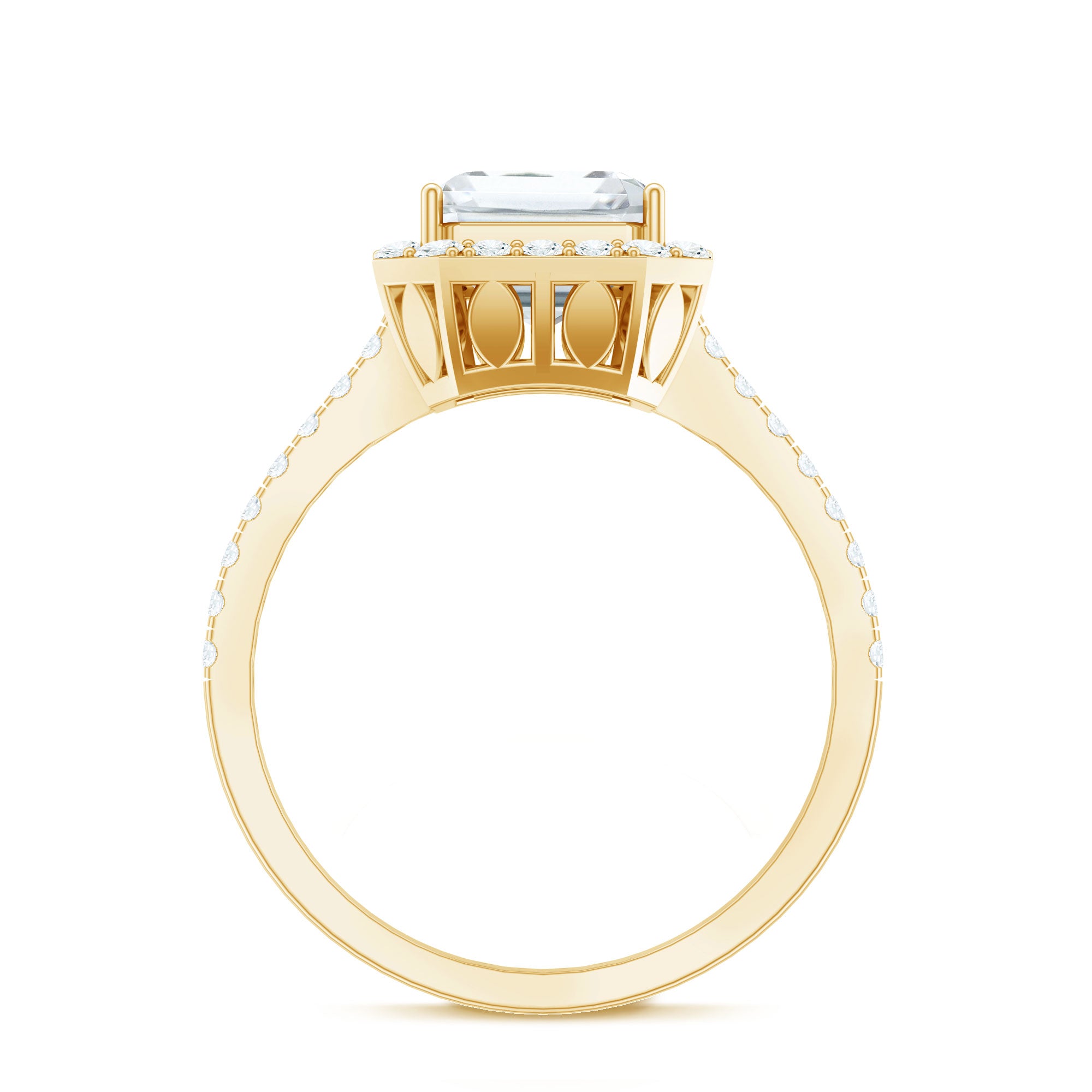 Surprise your loved one with a stunning anniversary gift - a unique womens ring crafted from gold. The Simulated Diamond ring features an octagon-shaped solitaire Zircon at its center, surrounded by round-shaped zircon in a halo style. Additional round-shaped zircon is beautifully engraved in a Fishtail setting as side stones, completing the exquisite design of this ring. Make her feel special with this beautiful and unique zircon solitaire ring.