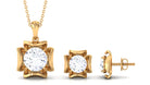 This Solitaire Jewelry Set is an elegant and timeless choice for any occasion. The set includes a stunning pendant necklace and matching earrings, each featuring a Round Moissanite stone in prong setting. This Jewelry Set is crafted with gold metal to give a luxurious look.