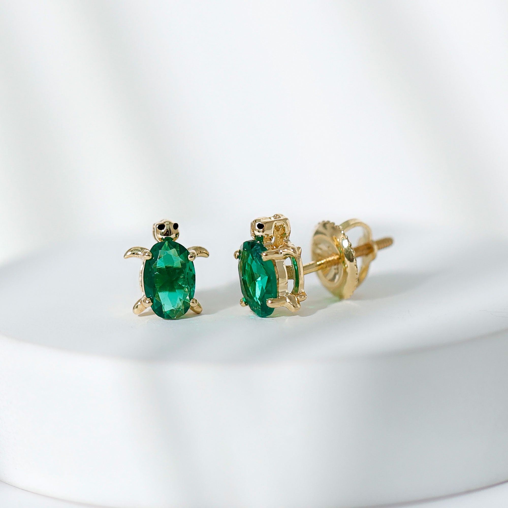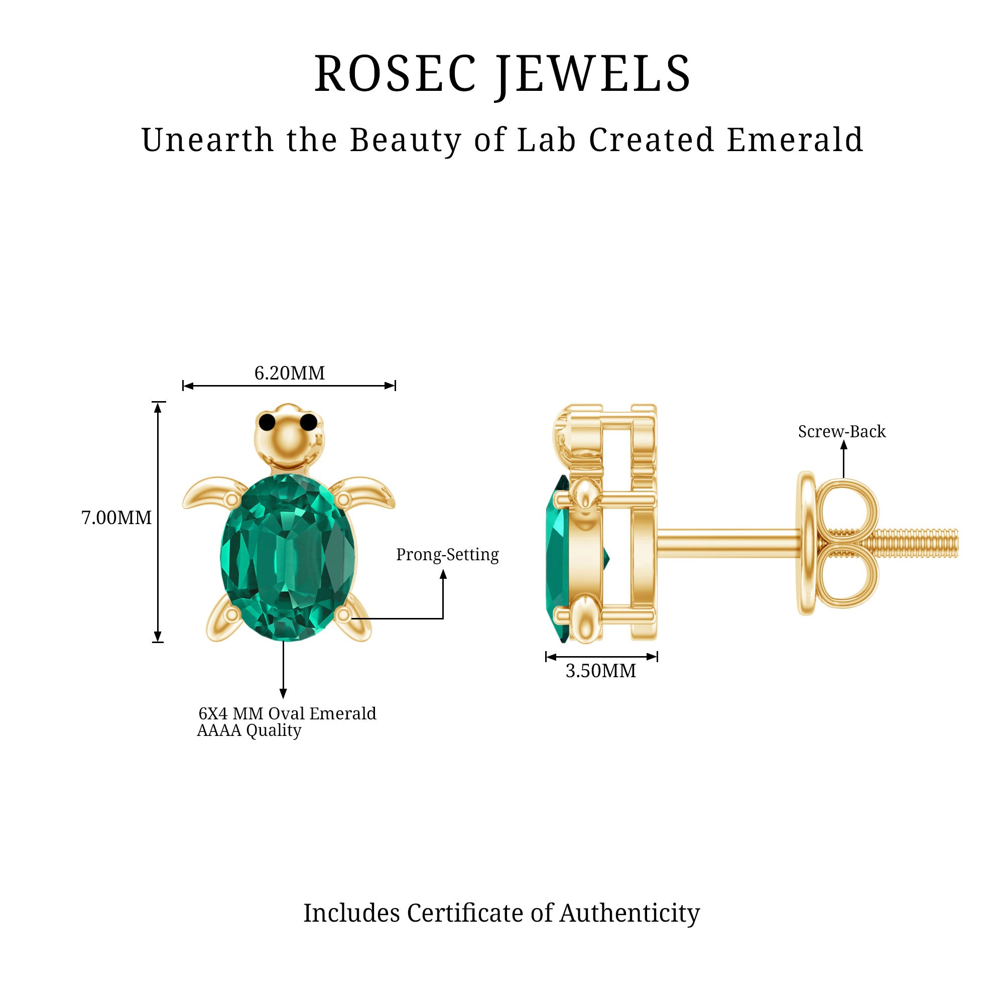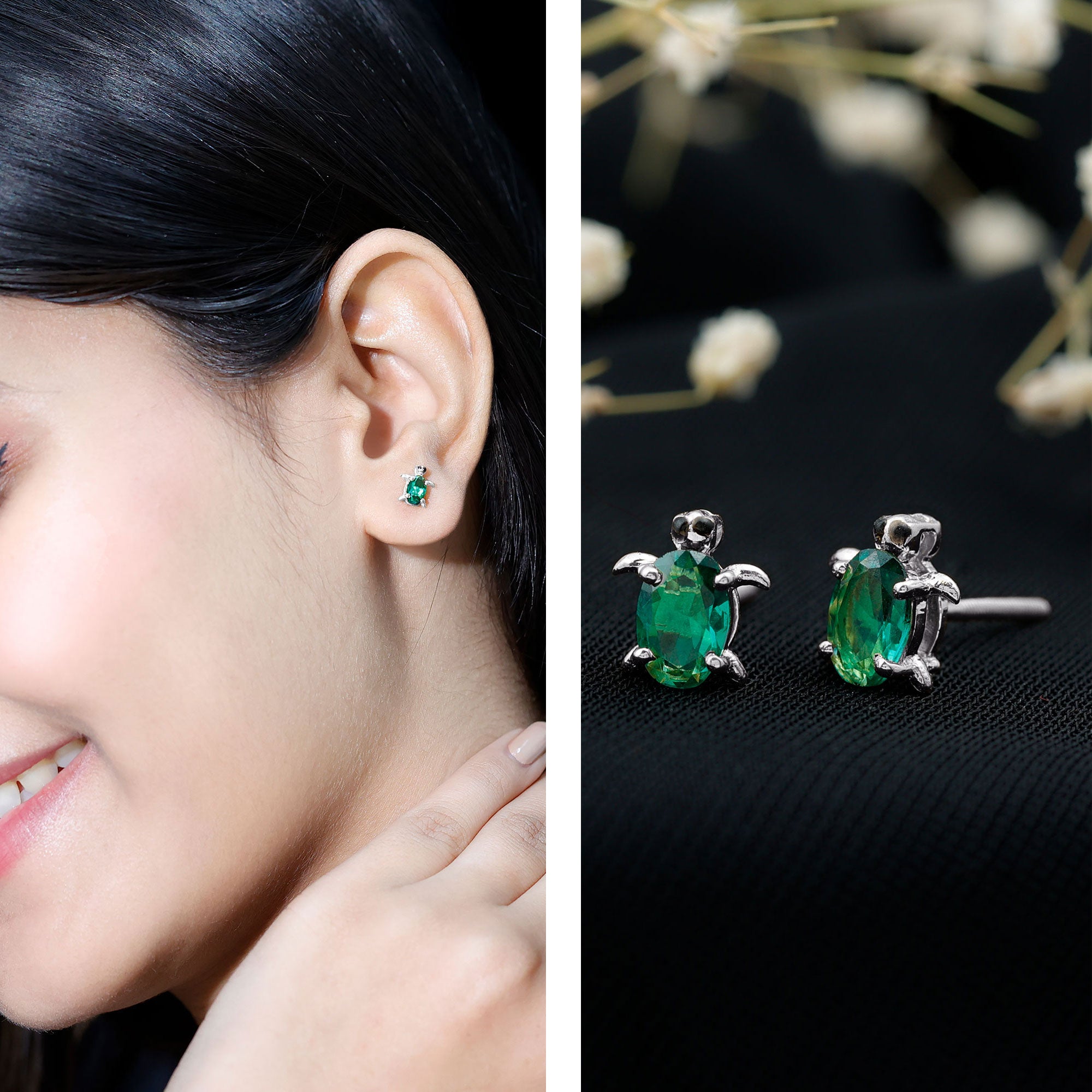 Turn heads with these adorable turtle lab grown Emerald Stud Earrings. Beautifully crafted, these earrings feature 4X6 MM Oval Cut Lab Created Emerald at the center of a charming turtle design. Perfect for adding a touch of fun to your casual or party attire, these Solitaire Earrings will make you the life of the party. If your lady is fond of sea creatures then these studs are the perfect choice of gift for her. Impress your loved one with these Emerald Earring Studs as a birthday gift and win her heart. Make her day special with this Turtle Studs beholding the shine of AAA quality Emerald.