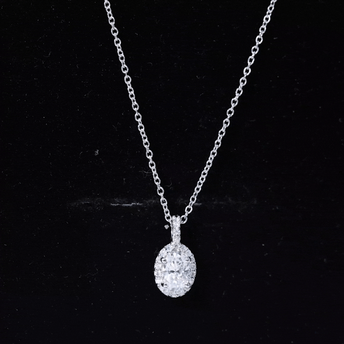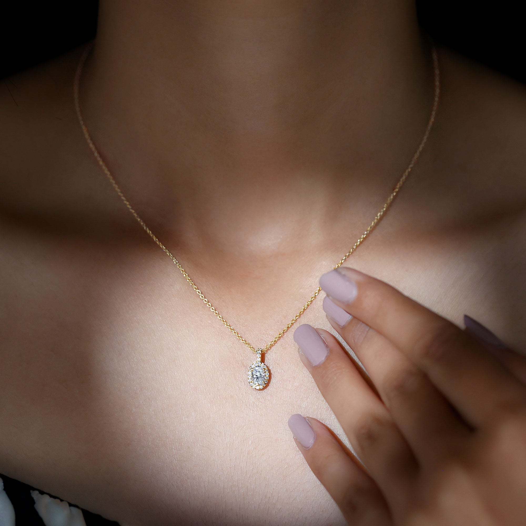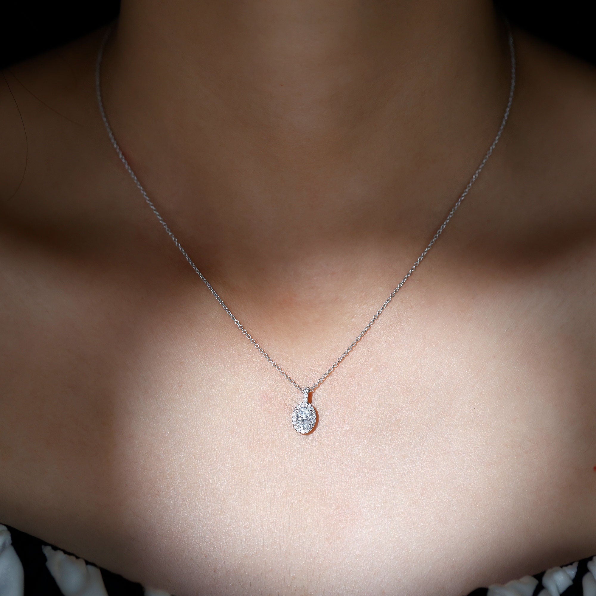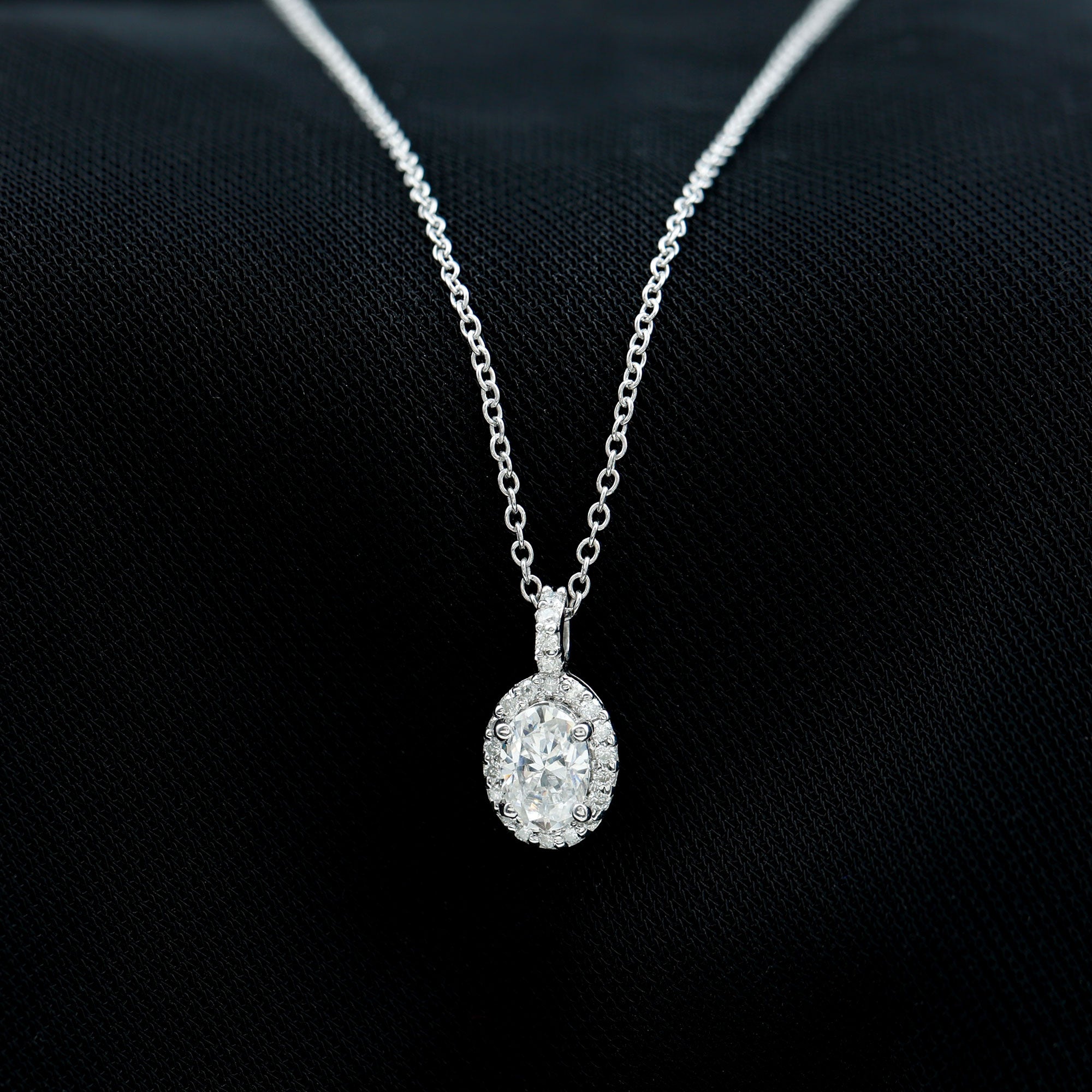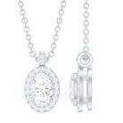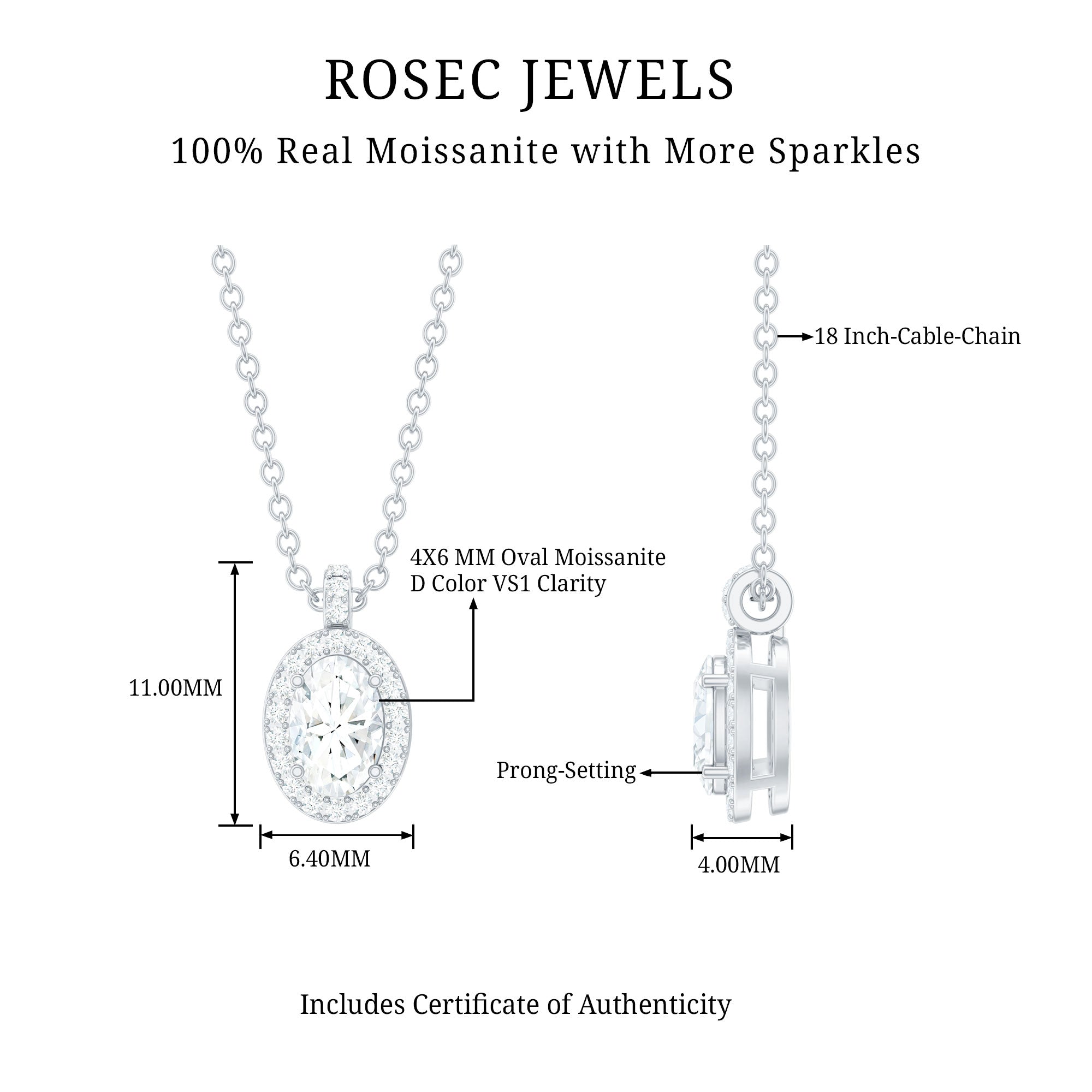 Add the perfect touch of sparkle to your neckline with this Moissanite Pendant Necklace. It features a 4X6 MM Oval shaped moissanite of D-VS1 Quality set in secure prong setting and surrounded with round sparkling stone to create a classic halo effect. The best part? Even more Round Moissanites studded on the bail for an extra burst of shimmer. This Bridal Necklace can be worn alone to give a subtle lift to your outfit or can be stacked with other pieces for a layered look. You can have confidence in the quality of our offerings, as each piece is accompanied by a certificate of authenticity.