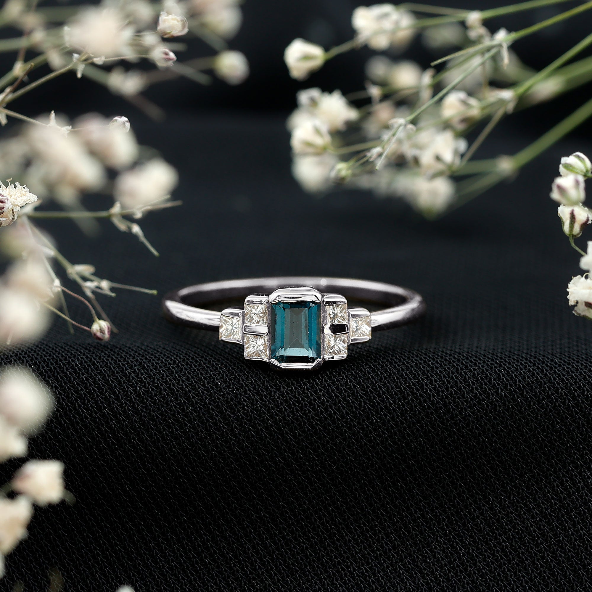 Are you prepared to commit to eternity? This Blue Topaz Engagement Ring is designed to make a breathtaking statement. This London Blue Topaz Ring exemplifies sophistication and allure. At its core, a captivating 4X6 MM emerald cut London Blue Topaz takes center stage with its rich blue hue. The focal point is bordered on either side by a trio of princess cut Hi-Si quality Diamonds, expertly coordinated for brilliance and fire. All gemstones are secured in a sleek half-bezel setting, providing safety and a contemporary look that maximizes light to amplify their shine. This Emerald Cut Engagement Ring serves as a timeless emblem of love and devotion. This Statement Engagement Ring, characterized by its timeless and dramatic allure, represents everlasting love, making it an ideal selection to commemorate the start of your infinite journey together. The AAA quality London Blue Topaz radiates with elegance, merging traditional beauty with contemporary design. Glimmering from every perspective, this 1 Carat Engagement Ring enhances brilliance with its breathtaking look. We also provide a range of ring sizes and an extensive array of metals to choose from. This Emerald Cut Blue Topaz Ring serves as a wonderful gift for your Wife, Fiancee, Girlfriend, or Mother.