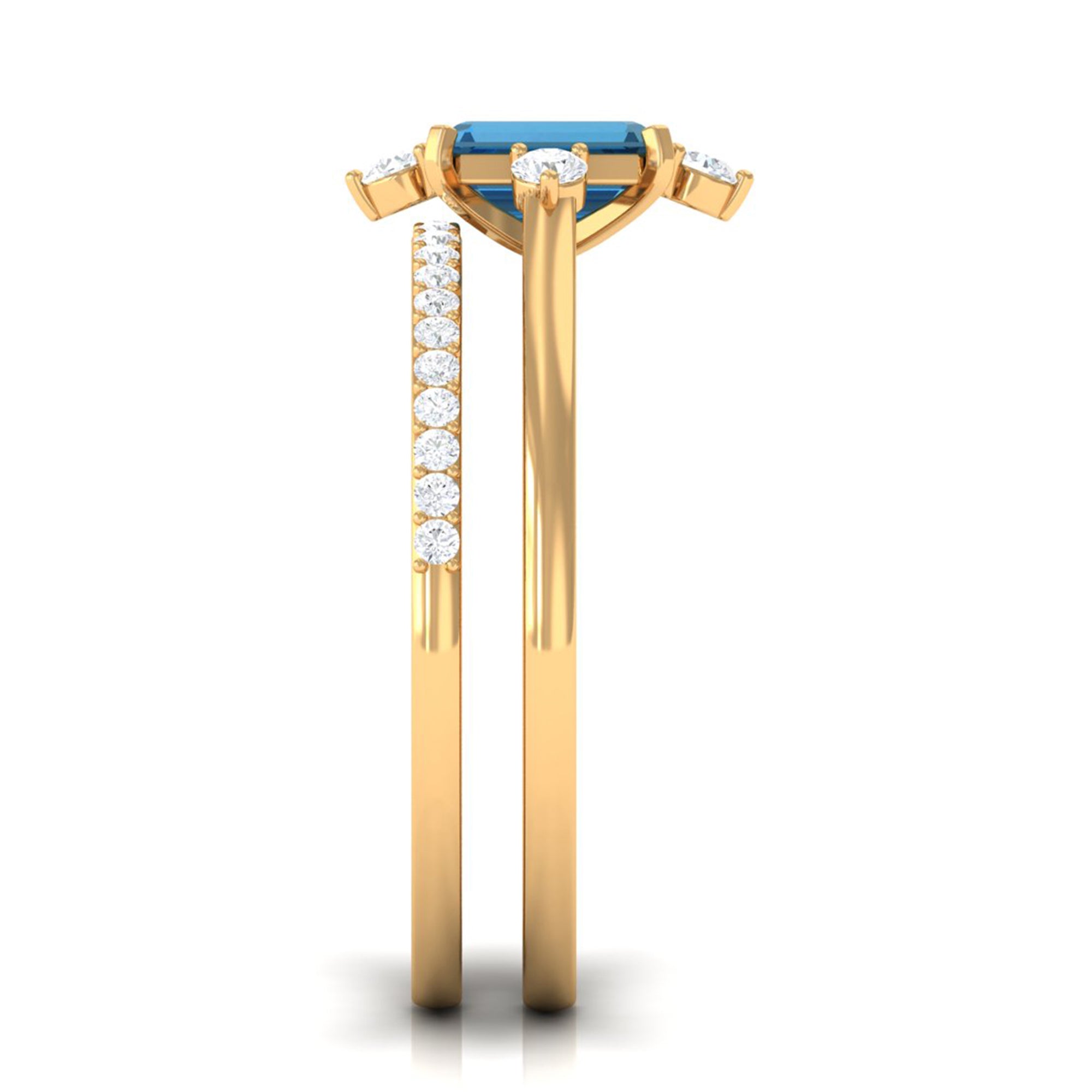 Mark a meaningful chapter in your love story with this beautifully designed Blue Topaz Wedding Ring Set, crafted to reflect elegance, strength, and connection. At the heart of the engagement ring is a 4X6 MM emerald cut London Blue Topaz, held securely in a prong setting. The engagement ring is accented with sparkling round diamonds, offering a delicate contrast that enhances the center stone. Paired with this is a matching wedding band, designed to align perfectly and sit beside the engagement ring. The band features a row of round diamonds, adding extra brilliance and tying both pieces together in harmony. Whether worn as a Bridal Wedding Ring Set or separately, each ring carries its own charm and elegance. The sleek, stackable design ensures everyday comfort while maintaining a refined, graceful look. Crafted with AAA quality london blue topaz and HI-SI quality diamonds, the stones are hand-selected for their brilliance and quality. Available in US sizes 3 to 13, the London Blue Topaz Ring Set is made to fit comfortably and last through every moment. This piece comes packaged in an elegant jewelry box and includes a certificate of authenticity for added confidence. Timeless and modern all at once, this Engagement Ring with Wedding Band Set is a beautiful reminder of the bond you share and the future you are building together.