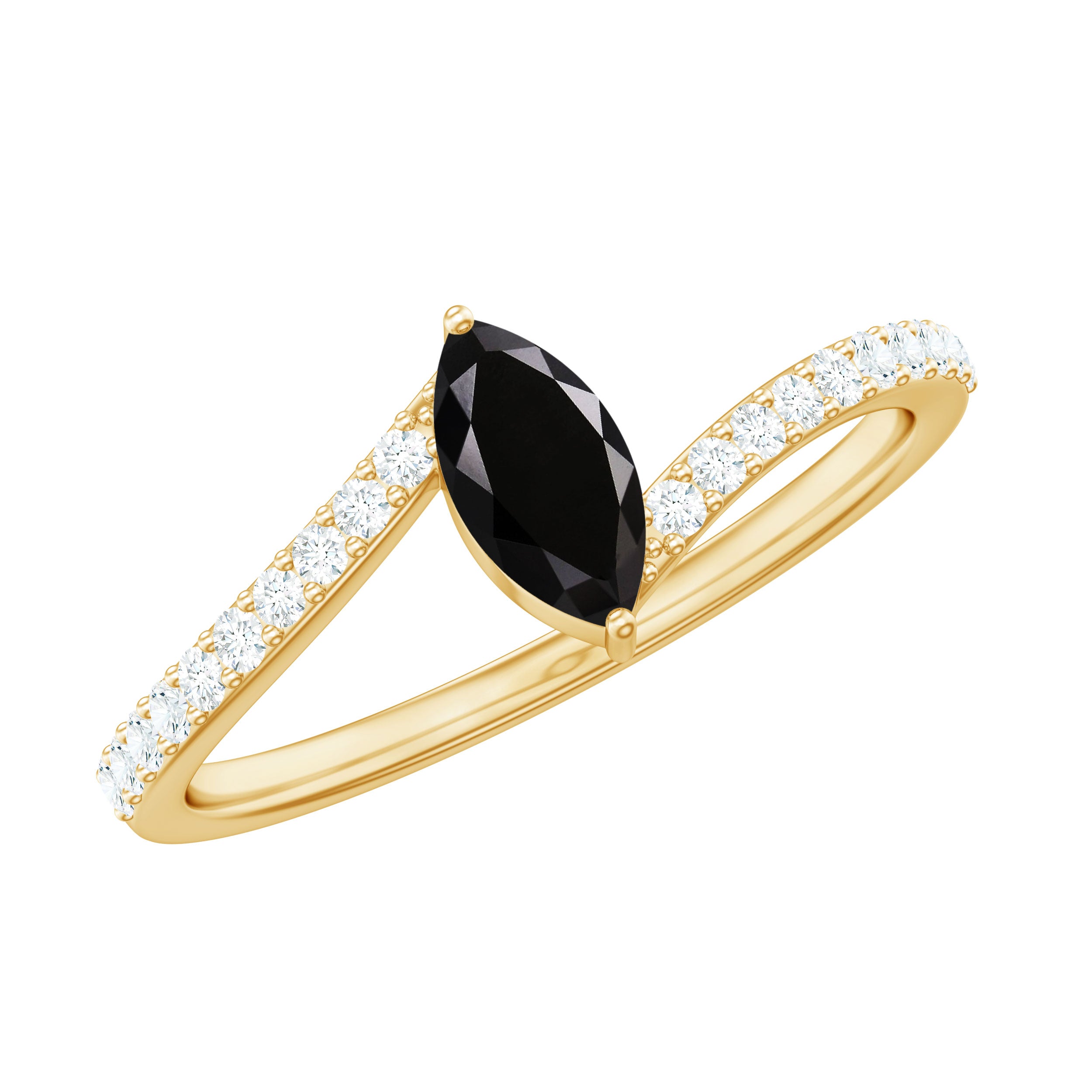 Designed with elegance and charm, this luxurious enchanted Solitaire Promise Ring captivates all who see it, showcasing a brilliant sparkle that could rival even a true loves kiss. This Solitaire Bypass Ring features a 4X8mm marquise cut Black Onyx, gracefully set in a prong arrangement with a tilted design. The distinctive aspect of this Tilted Ring is its bypass shank, embellished with small round Diamond stones. A piece of such exceptional craftsmanship and dazzling brilliance is sure to make your princess heart flutter. The sleek and minimalist bypass shank gently curves to embrace the luminous heart, merging classic elegance with a contemporary silhouette that not only provides a modern look but also safeguards the stone, making this Commitment Ring ideal for daily wear. Meticulously handcrafted, this Pre Engagement Ring is available in a range of high-quality metal purity options and colors. Furthermore, it comes in US standard sizes from 3 to 13, ensuring a perfect fit for every hand. Whether for a proposal, an anniversary, or a significant moment shared between the two of you, this Black Onyx Solitaire Ring is a timeless memento that she will cherish for a lifetime. A classic design intended to evoke feelings — just as yours did when you found your soulmate.