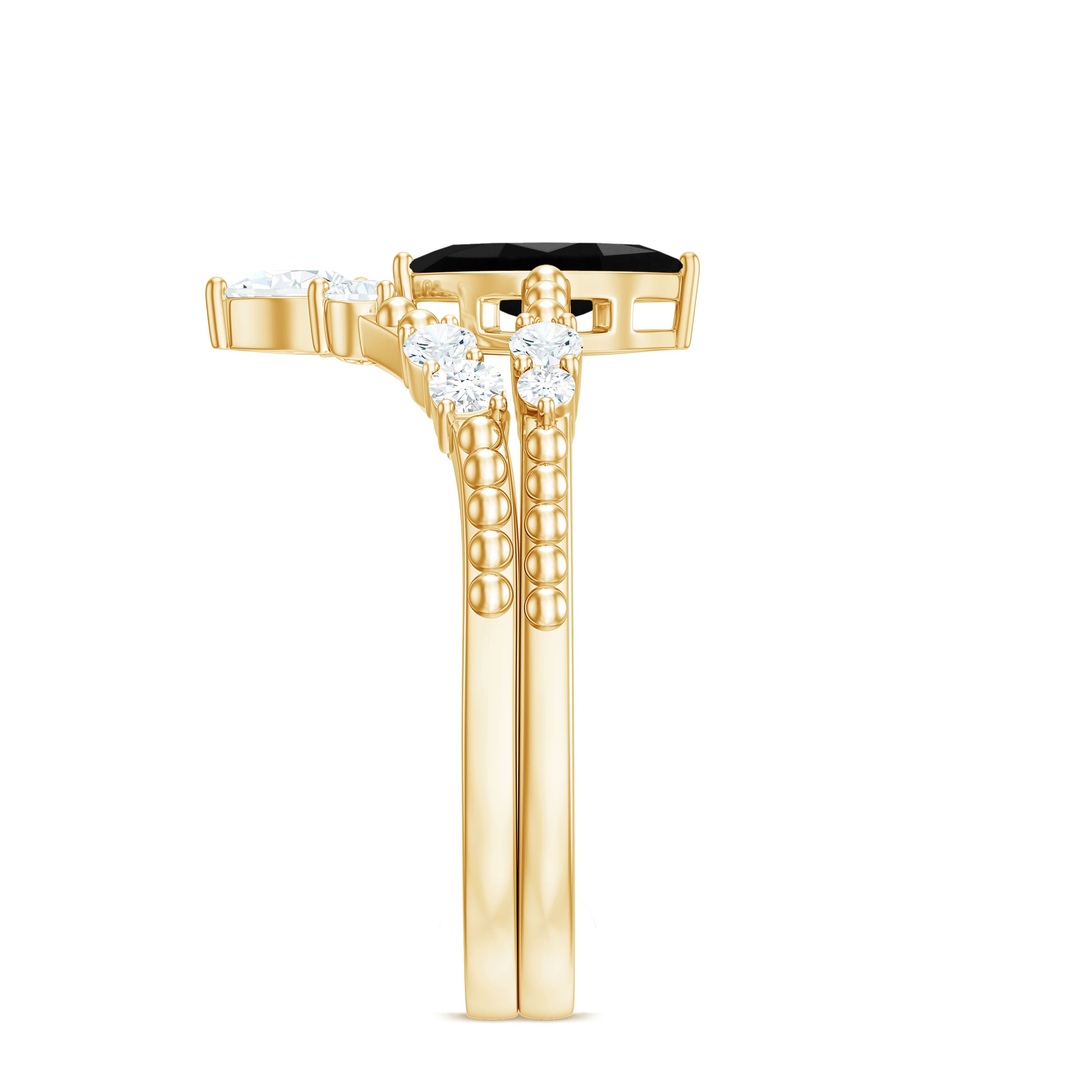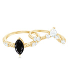 Crafted sophistically by experts is this beautiful Solitaire Ring Set is a perfect way to express love. Having two rings, one Solitaire Ring featuring 4X8 mm marquise cut Black Onyx set at the center as solitaire in a prong setting moissanite accents set on both side, and another is curved wedding band embellished with pear and round shape moissanites. The engagement ring is seamlessly complemented by a sleek chevron wedding band, designed in a gentle V-shape that embraces the solitaire ring with elegance. Collectively, the rings create a distinctive and refined Marquise Wedding Ring Set that embodies both minimalism and significance. Black onyx is a gemstone thought to provide various metaphysical advantages, such as shielding against negative energy, enhancing strength, confidence, and self-discipline, as well as fostering emotional and mental stability. Whether intended for a proposal, wedding day, or a special occasion, this Engagement Ring with Wedding Band is crafted to commemorate the moment with elegance and beauty. Meticulously designed with a focus on every detail, the set offers a modern interpretation of classic design, perfect for the bride who values simplicity yet desires something that truly stands out.