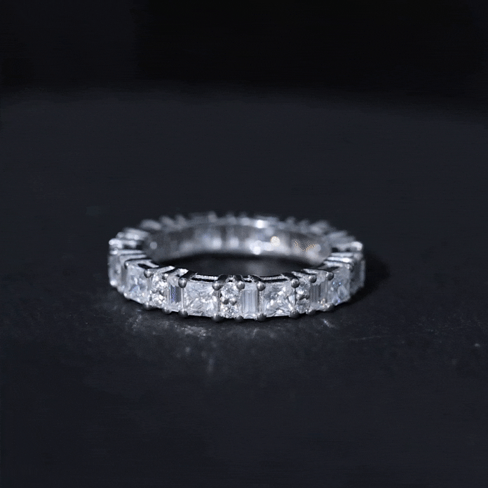 Show your lady love how special she is by gifting her this stunning Half Moissanite Eternity Band Ring. The ring is adorned with dazzling Round, Baguette, and Princess Cut Moissanite stones, set in a shared prong setting that covers the entire band.