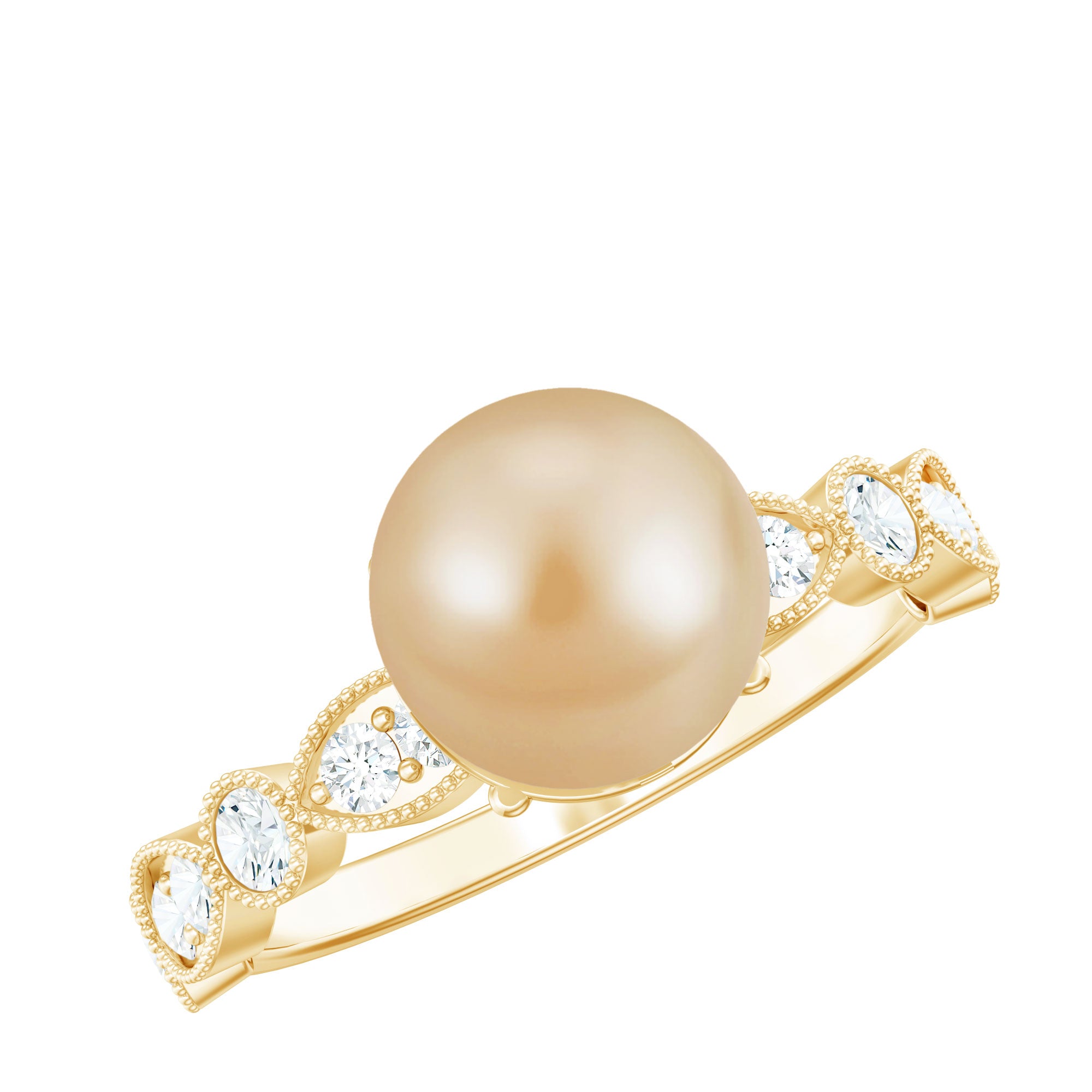 A classic piece with timeless appeal this Golden Pearl Solitaire Engagement Ring is adorned with the brilliant Round Shape South Sea Pearl with Round Diamond set as Side Stones on the shank with beaded gold details. This South Sea Pearl Engagement Ring is crafted in Gold. This charming Pearl Solitaire Ring makes for a trendy and elegant choice for your big day.