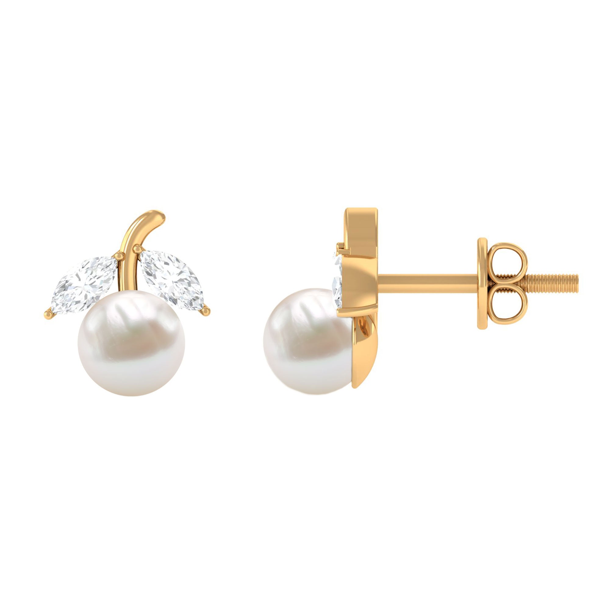 It is known as Fruit Earrings for Women adorned in Solid Gold and feature Round Shape Freshwater Pearl with Marquise Cut Diamond stones embellished in Prong Setting.