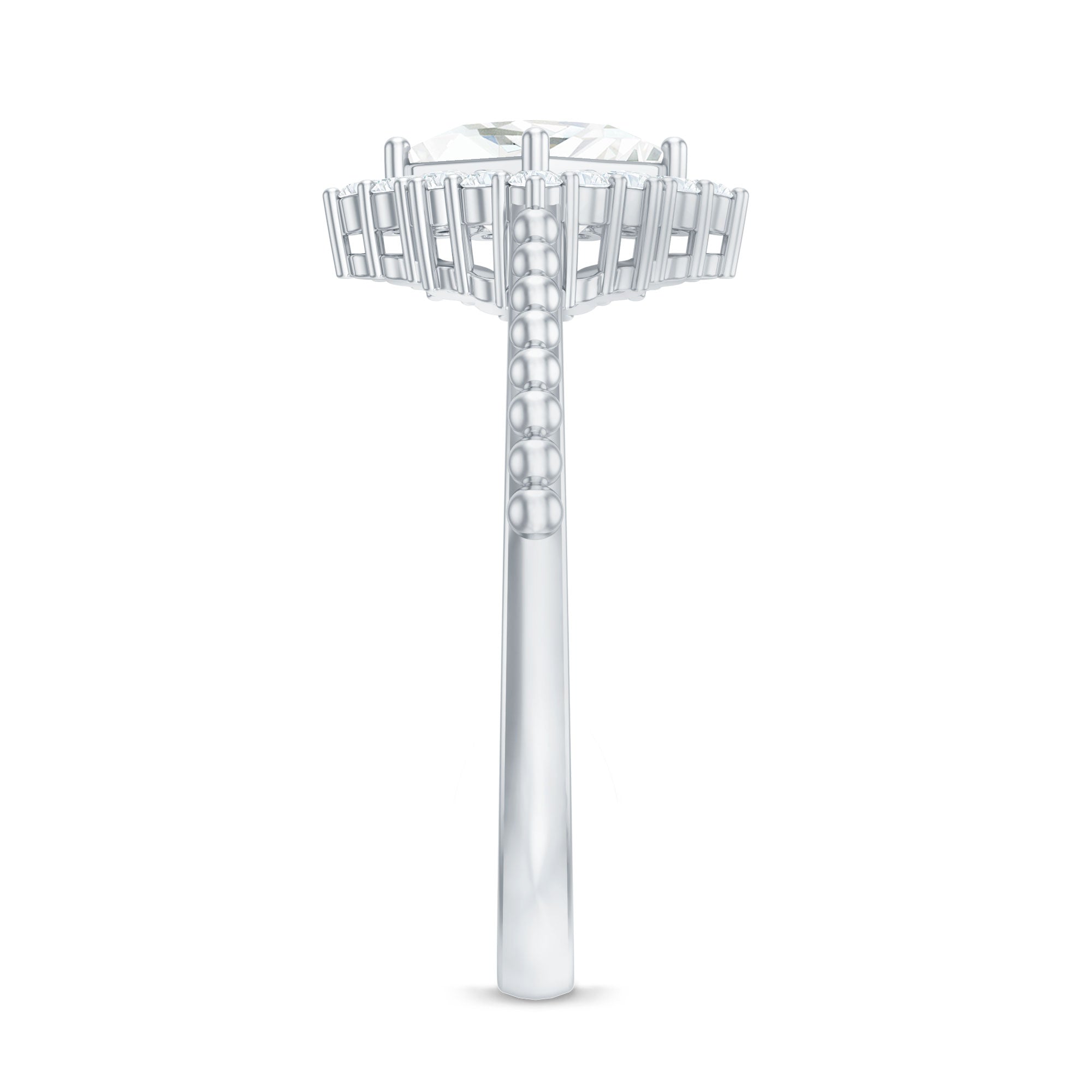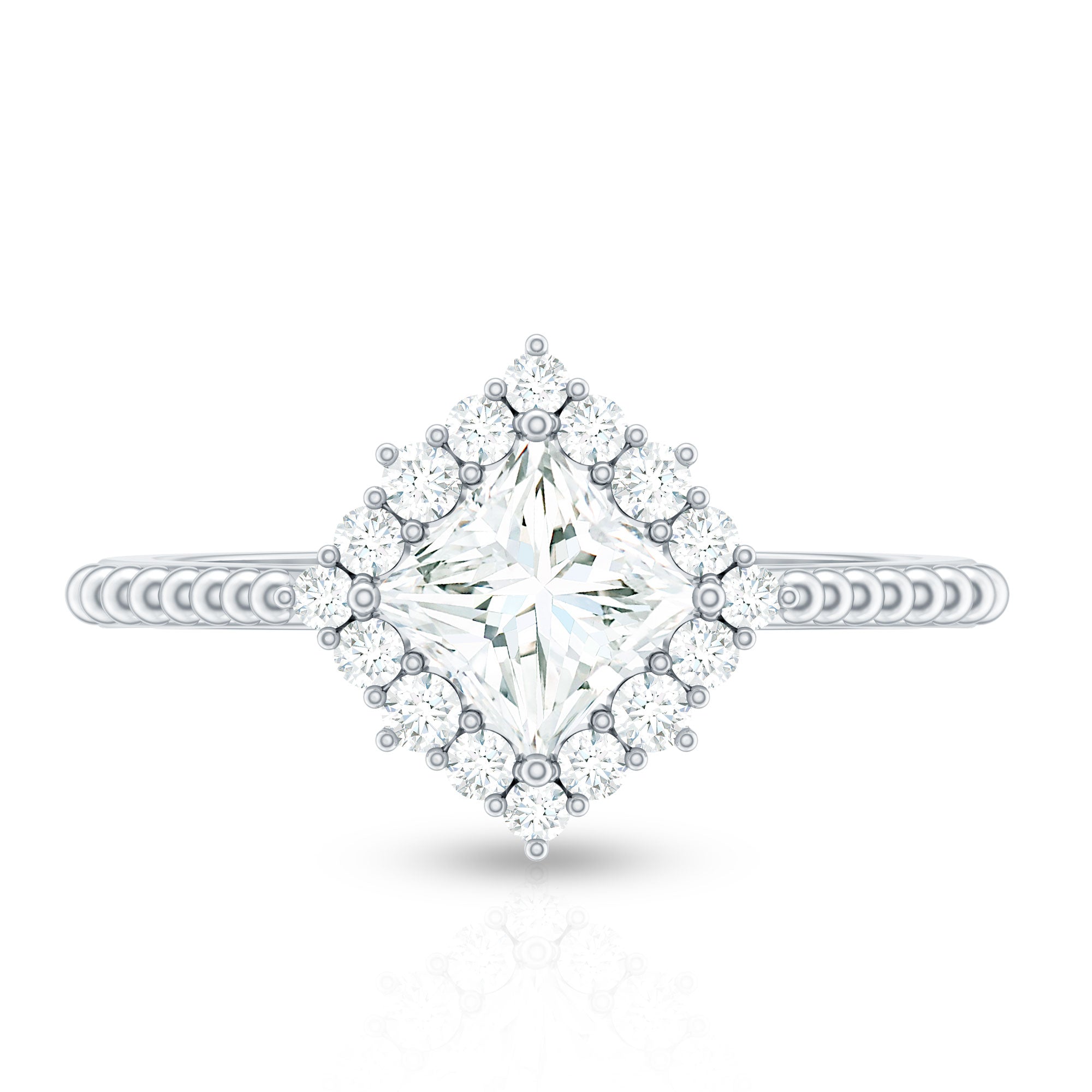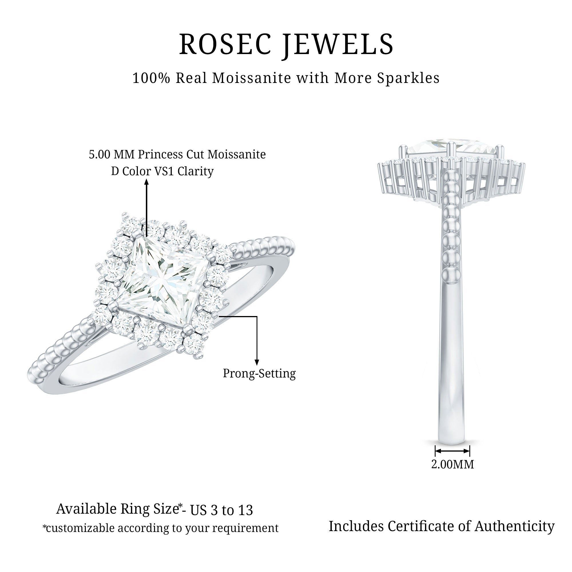 True love is expressed in many ways, and a carefully selected ring for your big day is one of the best ways of doing it. This outstanding Moissanite Halo Ring featuring 5 mm tilted Princess Cut Moissanite surrounded by tiny round shape moissanites, enhancing the sparkle of the center stone. This Halo Engagement Ring has beaded embellished shank, which give this piece an antique look. Moissanite has exceptional chemical, physical, and optical properties that closely resemble those of a diamond, giving this ring a brilliant sparkle and radiant look she’s sure to adore. Crafted with meticulous attention to detail, this Moissanite Square Ring is a symbol of strength, unity, and enduring love. Its soft yet daring look makes this Halo Engagement Ring a standout piece that she will wear and adore for a lifetime. Designed for everyday comfort and timeless appeal, this Womens Moissanite Engagement Ring is available in US sizes 3 to 13 to ensure the perfect fit. Whether youre preparing for a heartfelt surprise or a quiet, intimate moment, it comes thoughtfully packaged in a beautiful jewelry box, ready to be treasured from the moment it’s revealed.